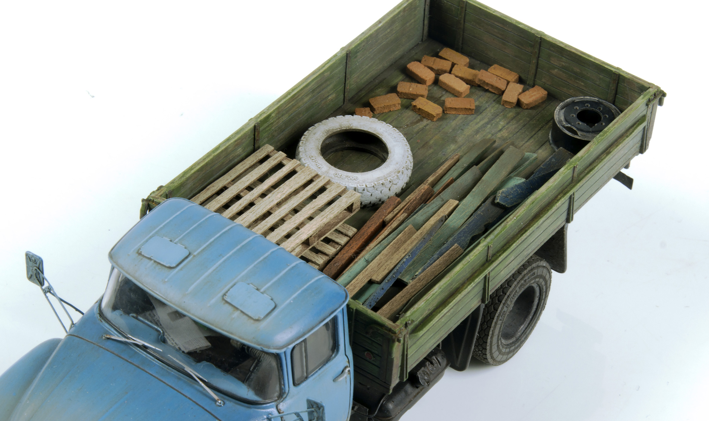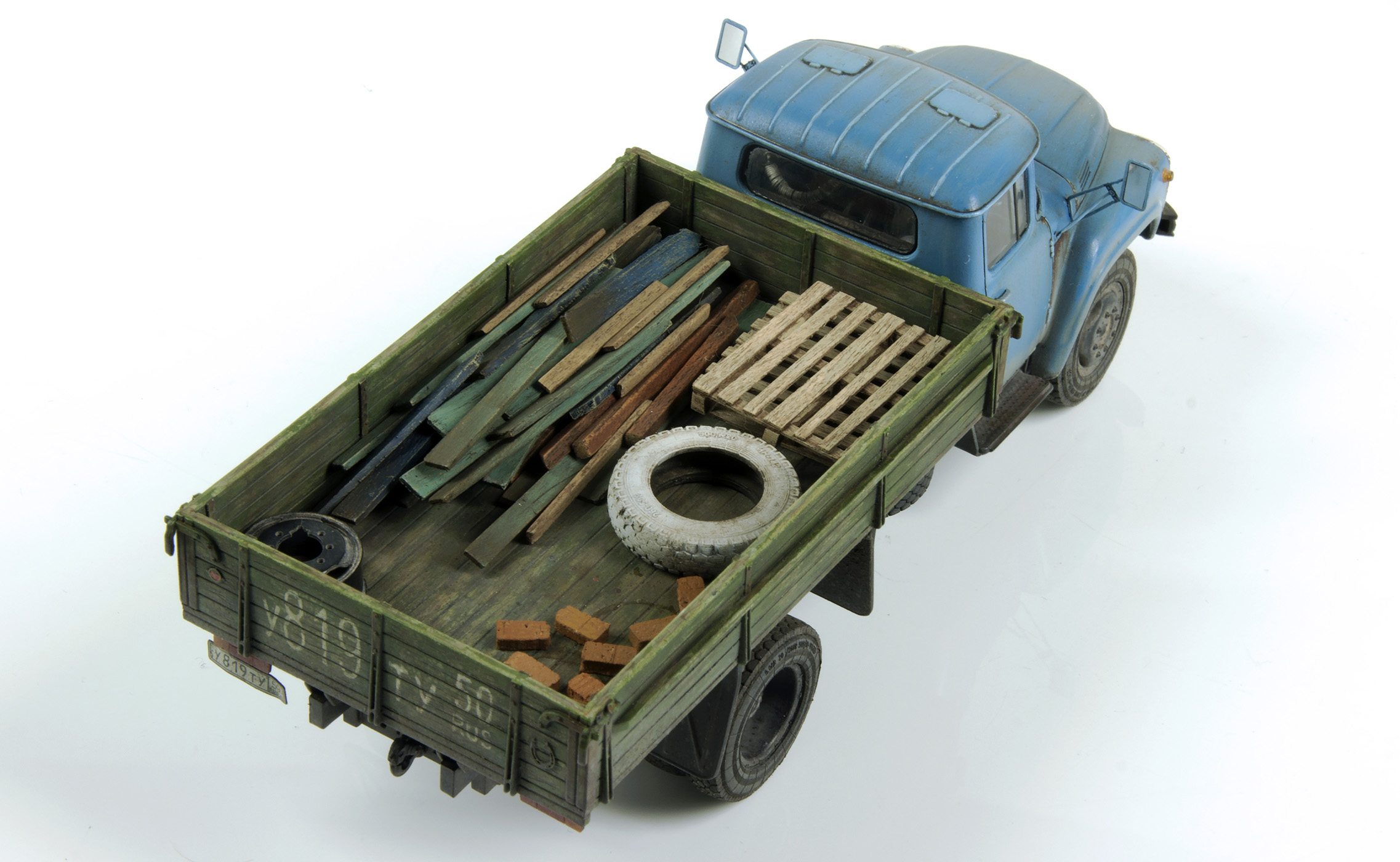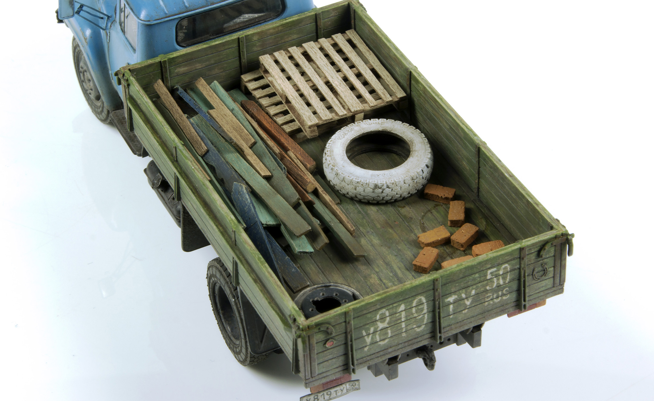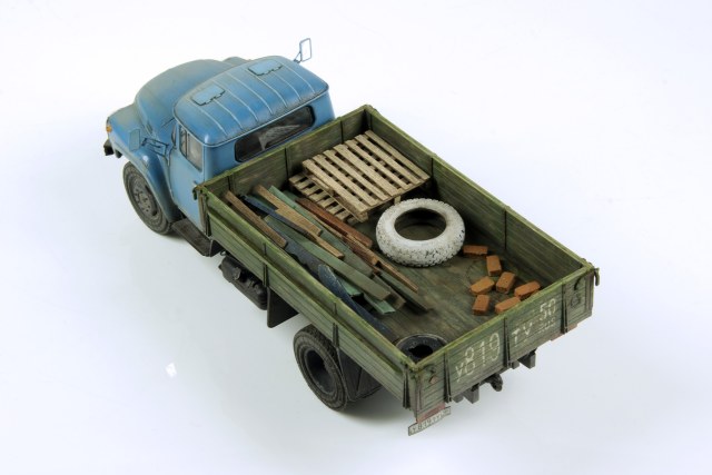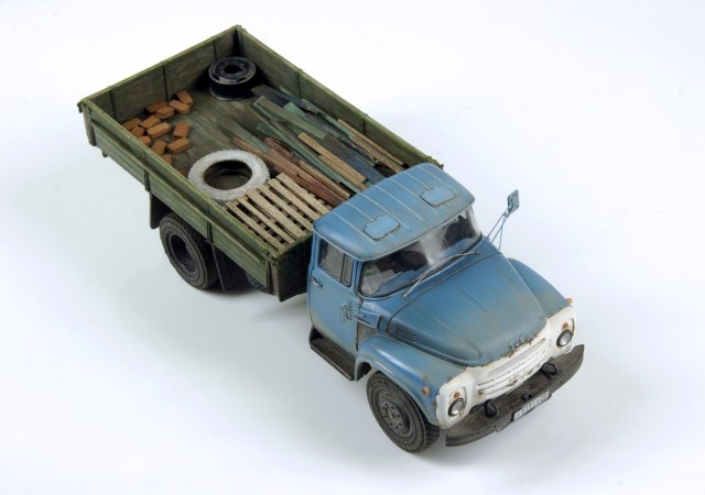 Добавил травленые дворники и зеркала от «Петроград», «рестайлинговые» задние фары самодел из пластика. Доработана внутренняя отделка салона и кузова. Наполнение - хлам из запасов, поддоны - самодел из рейки шпона.