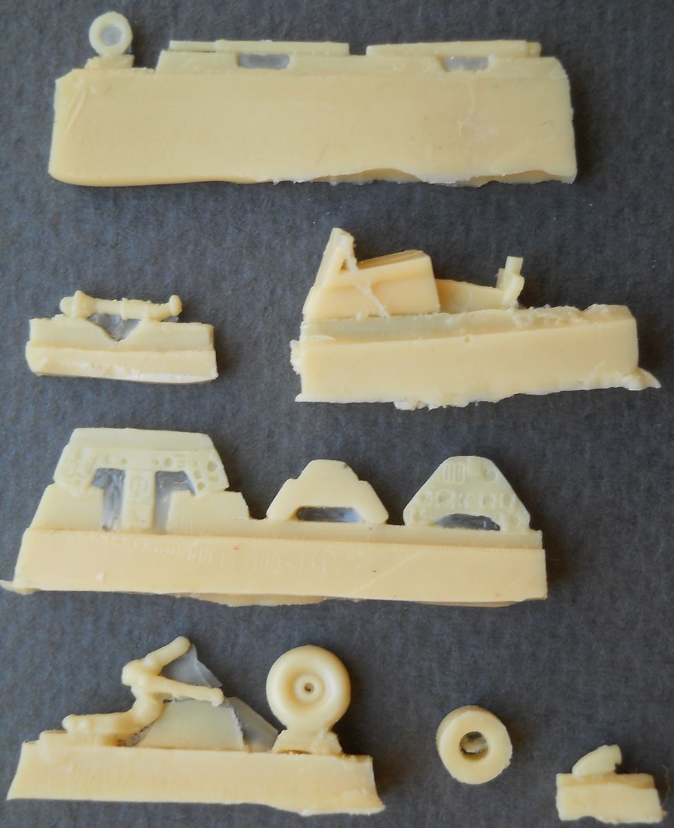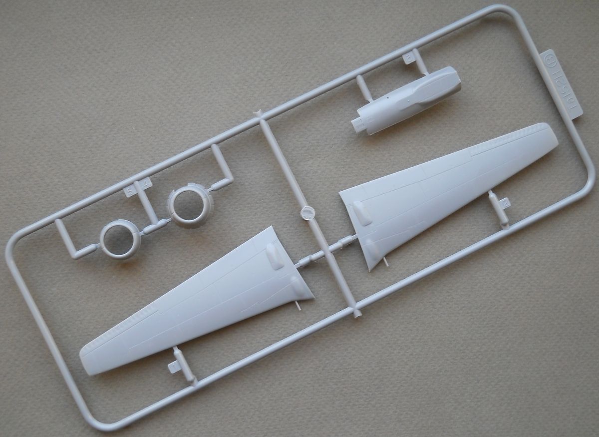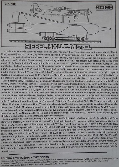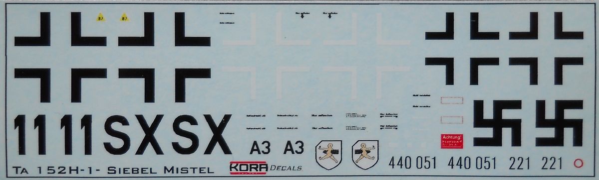 Модель фирмы Kora в 72-м масштабе (артикул 72200) упакована в картонную коробку с верхним открытием. В комплект входят три пластиковых литника с основными деталями Ta-152H-1 от фирмы Aoshima. Пластиковый фонарь к нему выглядит несколько мутным и потребует купания в футуре. Присутствует маленькая плата с весьма посредственным фототравлением. Ещё хуже смотрится бумажная приборная доска. Декаль к истребителю предлагается на два варианта и смотрится отлично. Также к Ta-152H-1 даются смоляные детали, относящиеся к интерьеру кабины, шасси, винтомоторной группе, плюс подвесной бак и воздухозаборники. Все остальные смоляные детали относятся к самой планирующей бомбе, ускорителям и стартовой платформе. Литьё неважного качество. Прежде всего, это относится к небольшим деталям. Дефектов как таковых не много, но проработка и исполнение во многих местах имеет налёт некоторой небрежности. Тем не менее, довольно неплохо получился фюзеляж планера бомбы и крыло, а так же рельсовые пути. В комплект прилагается пластиковый профиль. Декалей на саму бомбу не предусмотрено. Инструкция информативна и наглядна. Хорошо выполнены цветные схемы окраски.