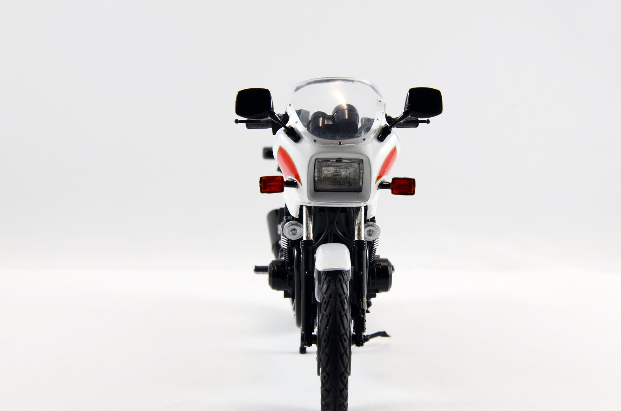 Выбрана была модель в белом цвете и полированными колесными дисками. В черном цвете думаю сливалась бы с двигателем и глушителями.