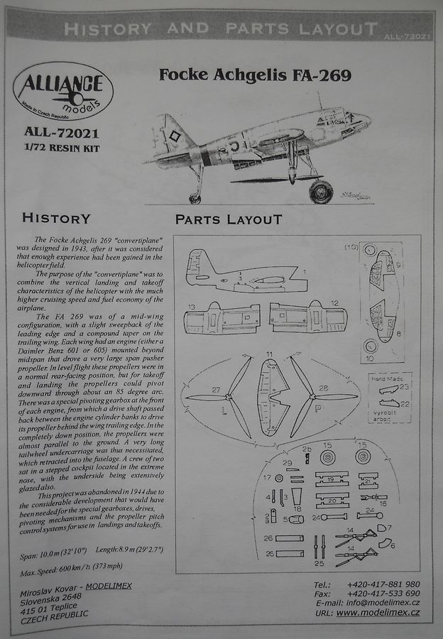 Модель из смолы от фирмы Alliance models в масштабе 1/72 (номер по каталогу 72021) упакована в прочную картонную коробку с верхним открытием. Литьё среднего качества, имеются незначительные дефекты. Фюзеляж выполнен целым, качество мелких деталей вполне приемлемое. А вот ваку-фонарь подкачал. Мало того, что он пожелтел от времени, так ещё и членение его крайне неудачное – разъём половинок проходит сверху прямо через прозрачную часть остекления. Потребуется изготовить фонарь заново. Декали даются на один вариант и смотрятся неплохо. Инструкция вполне наглядна и информативна.