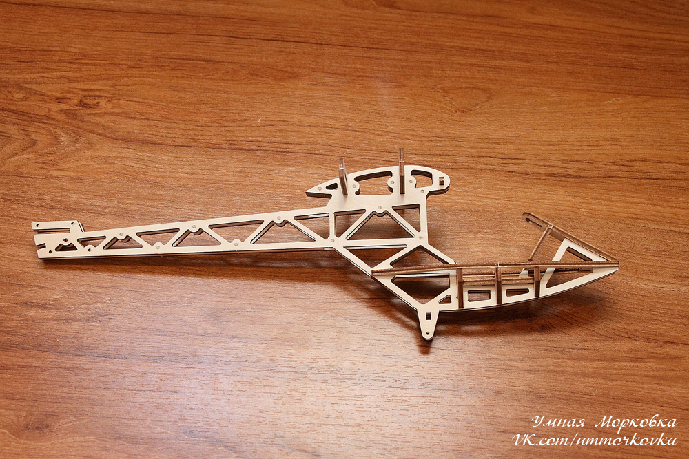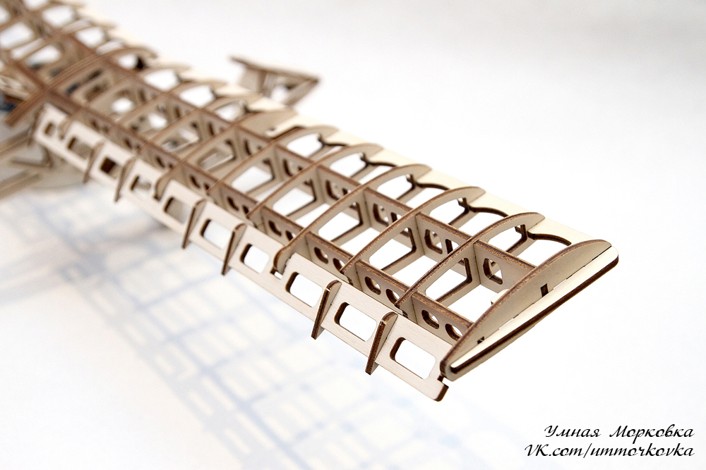 Про модель особо говорить нечего. Сделана из фанеры 3мм. Масштаб 1 : 13,5-13,8. Размеры округлял до круглых, чтобы проще было проектировать. Сборкой остался в целом доволен, хотя пара мелких нервюр держится слабовато, в отличие от других, аналогичных им. Толщины пазов в обоих случаях одинаковы.