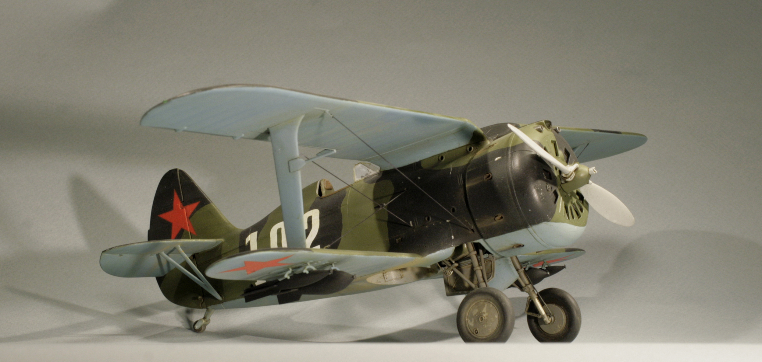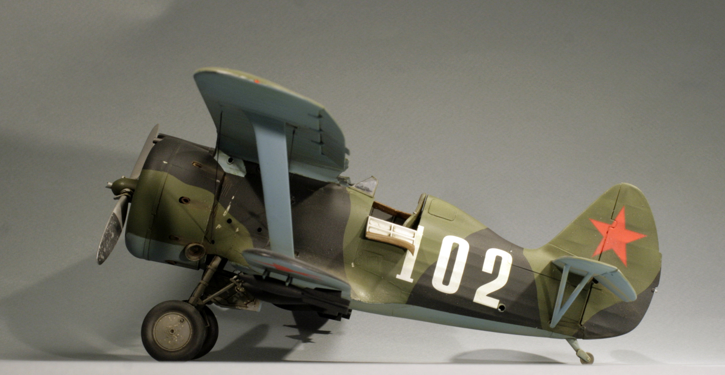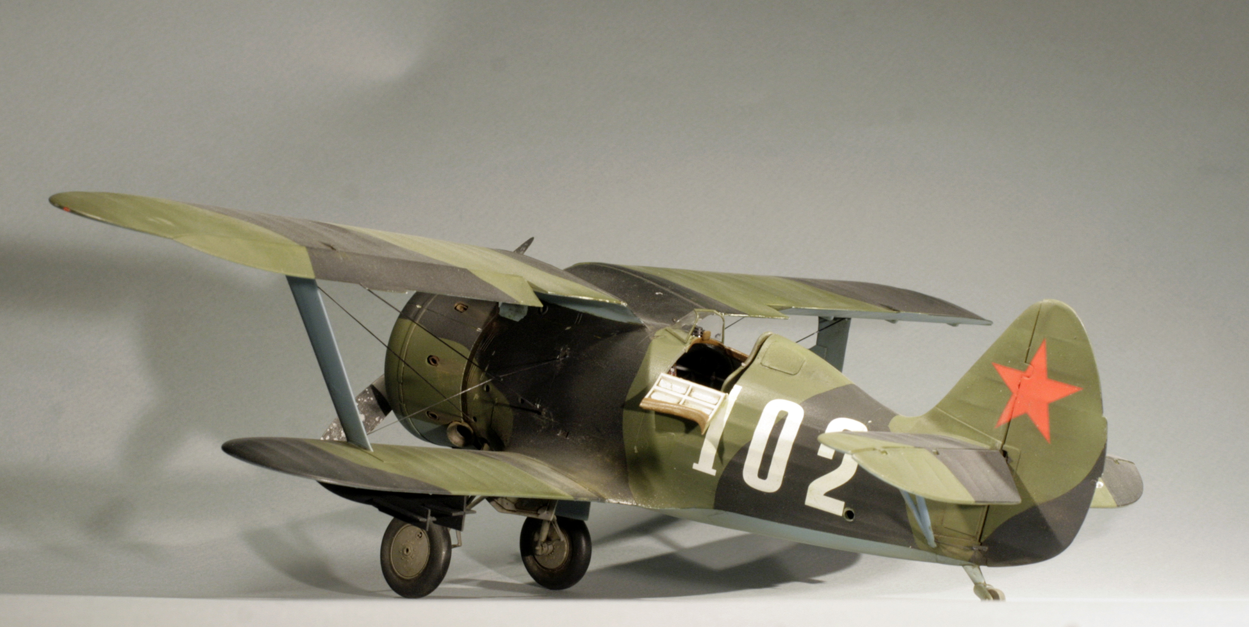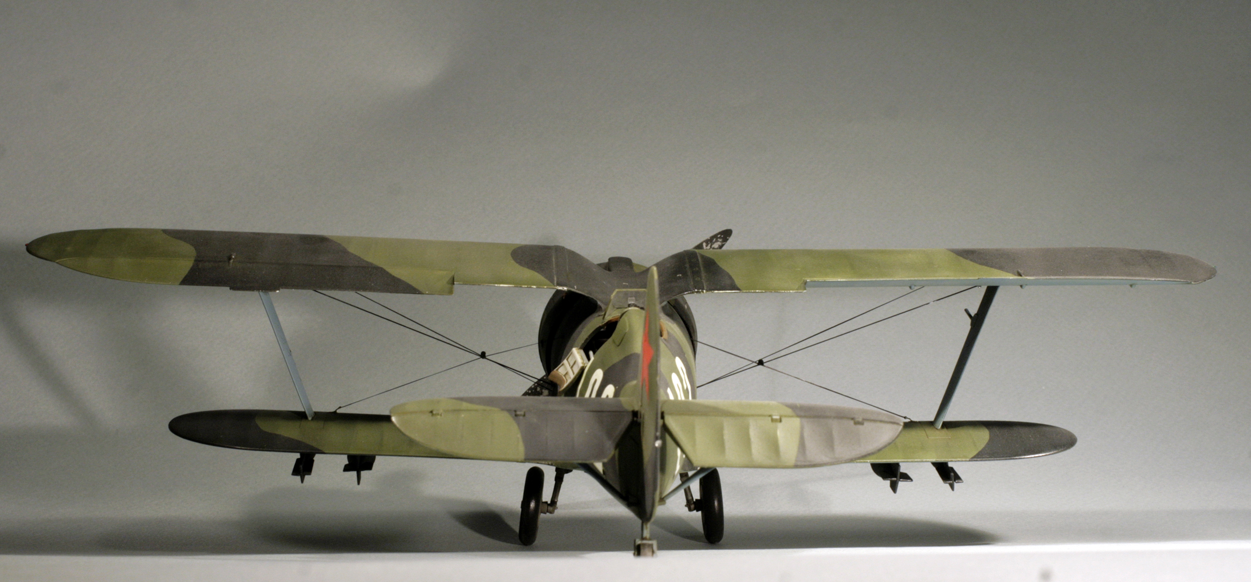 Стыковка модели внезапно оказалась посредственной. Конструкции фюзеляжа не хватает жесткости и посадочных штифтов, тем более половинки фюзеляжа были немного поведены. Из-за этого по стыку нижнего крыла с фюзеляжем и между половинами фюзеляжа образуются заметные уступы. Их пришлось шпаклевать. Последствия этой борьбы заметны по крупным участкам шпаклевки белого цвета. Так же очень неудачно реализован стык деталей капота.