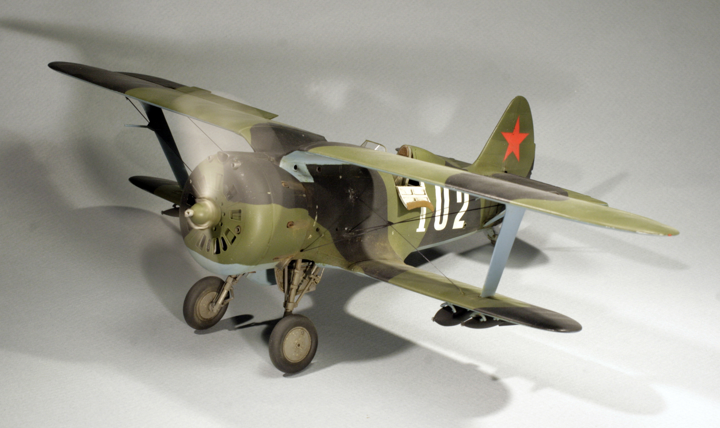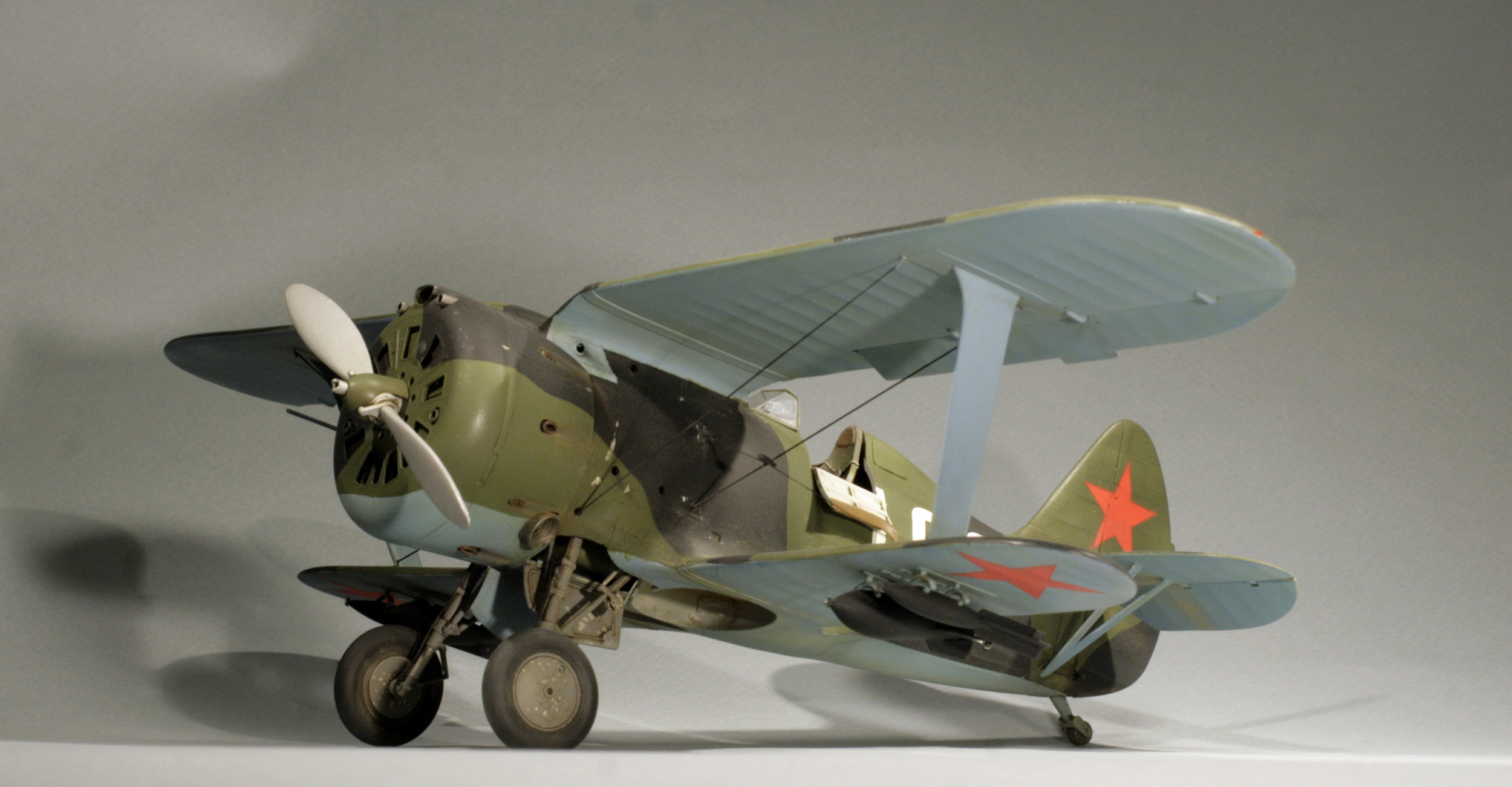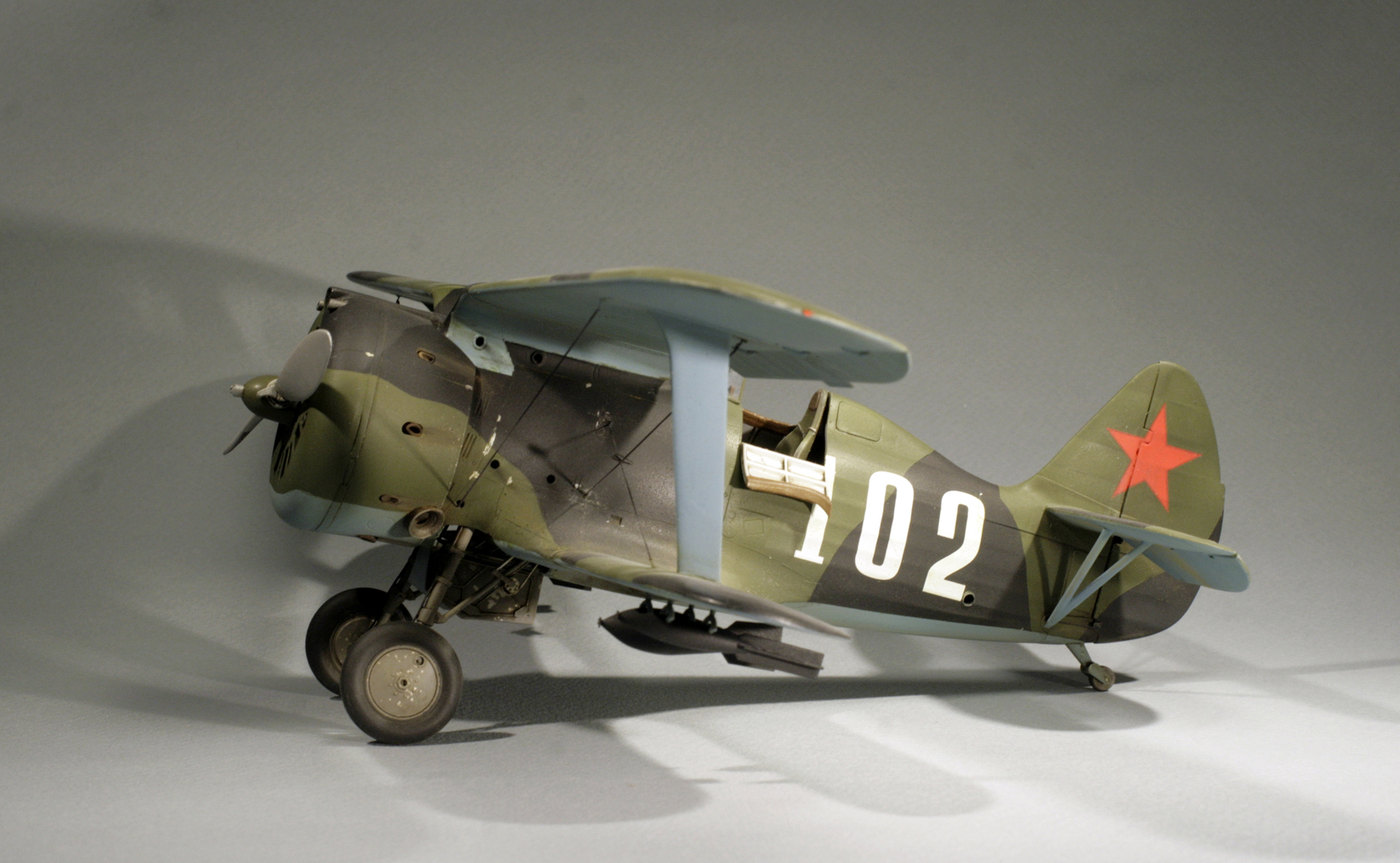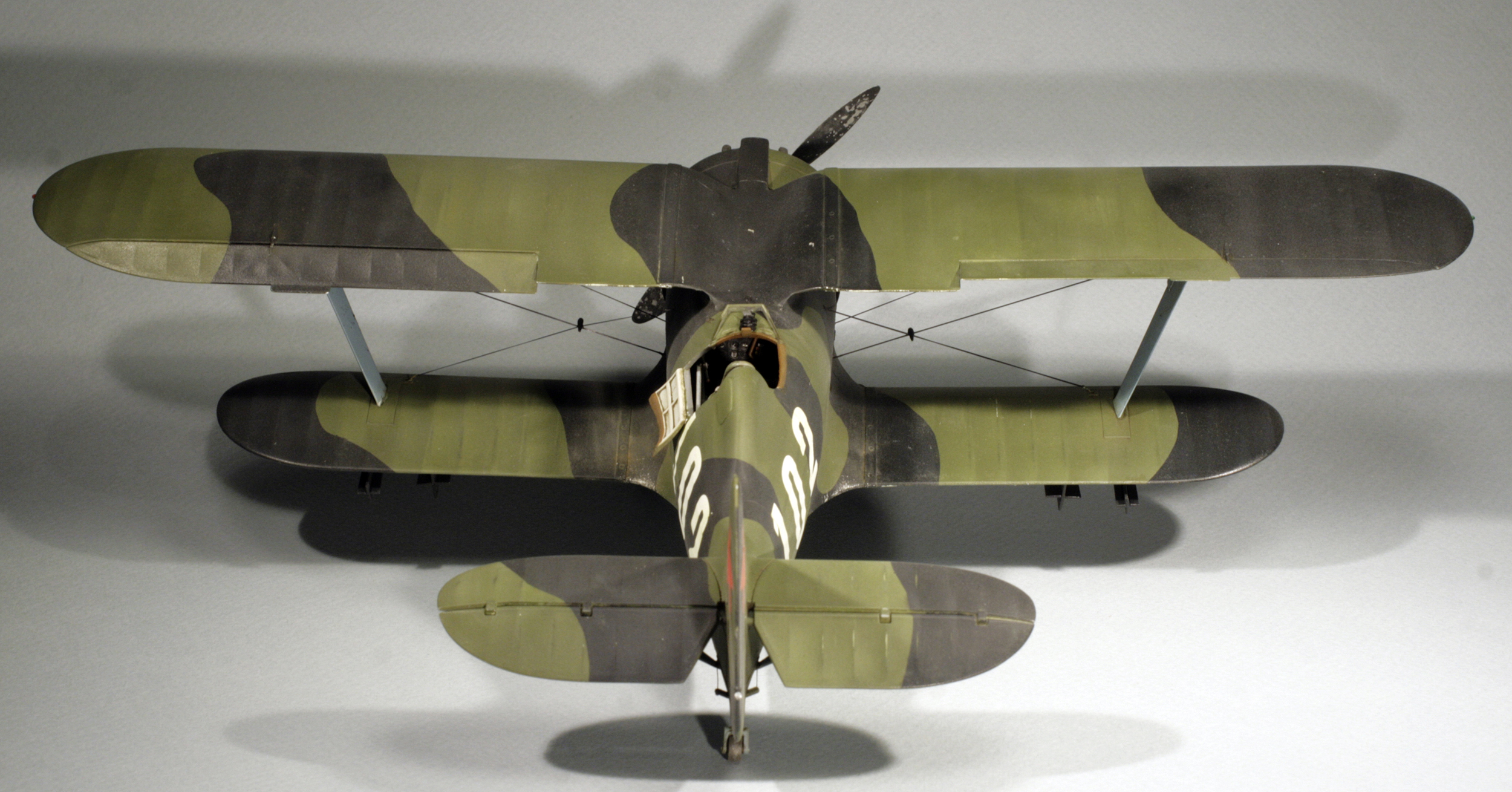 Стыковка модели внезапно оказалась посредственной. Конструкции фюзеляжа не хватает жесткости и посадочных штифтов, тем более половинки фюзеляжа были немного поведены. Из-за этого по стыку нижнего крыла с фюзеляжем и между половинами фюзеляжа образуются заметные уступы. Их пришлось шпаклевать. Последствия этой борьбы заметны по крупным участкам шпаклевки белого цвета. Так же очень неудачно реализован стык деталей капота.