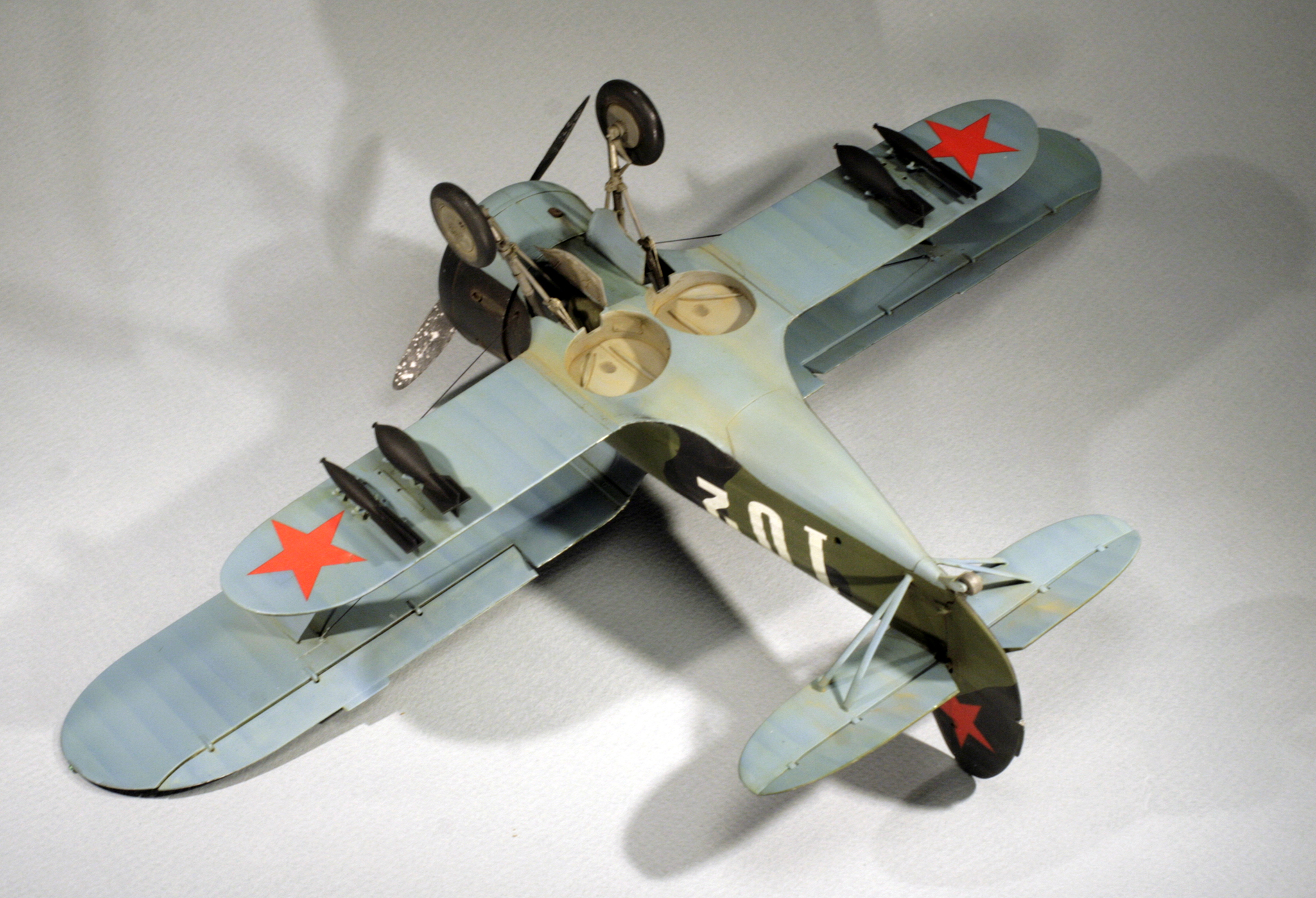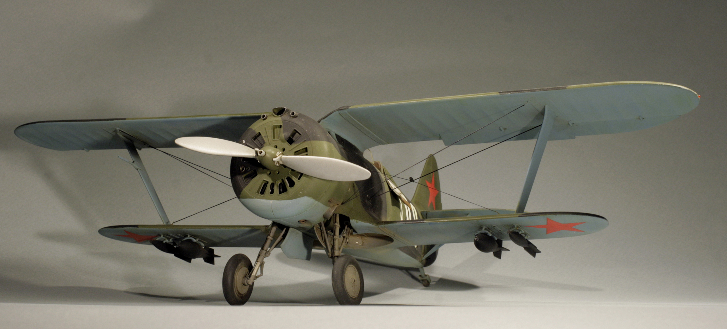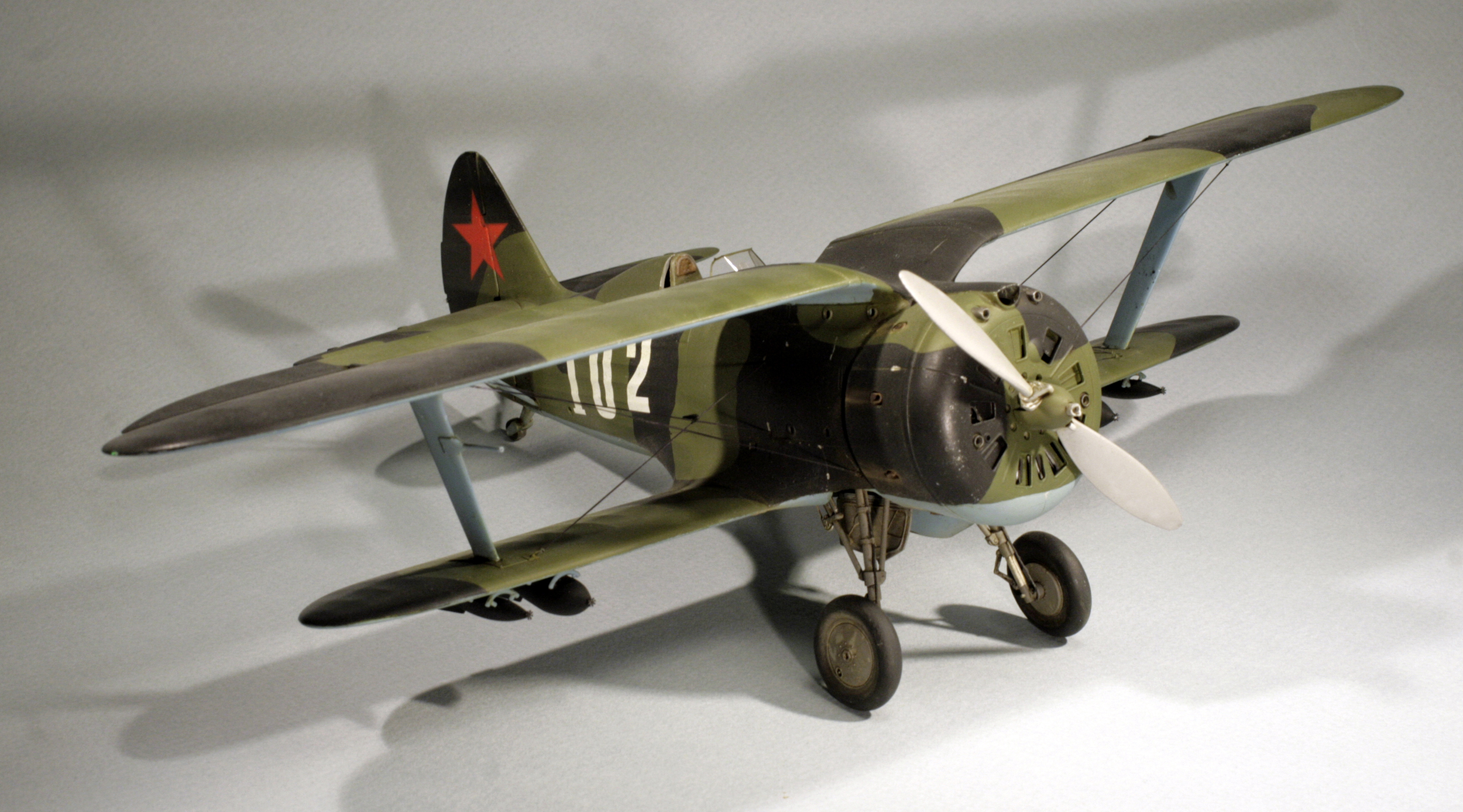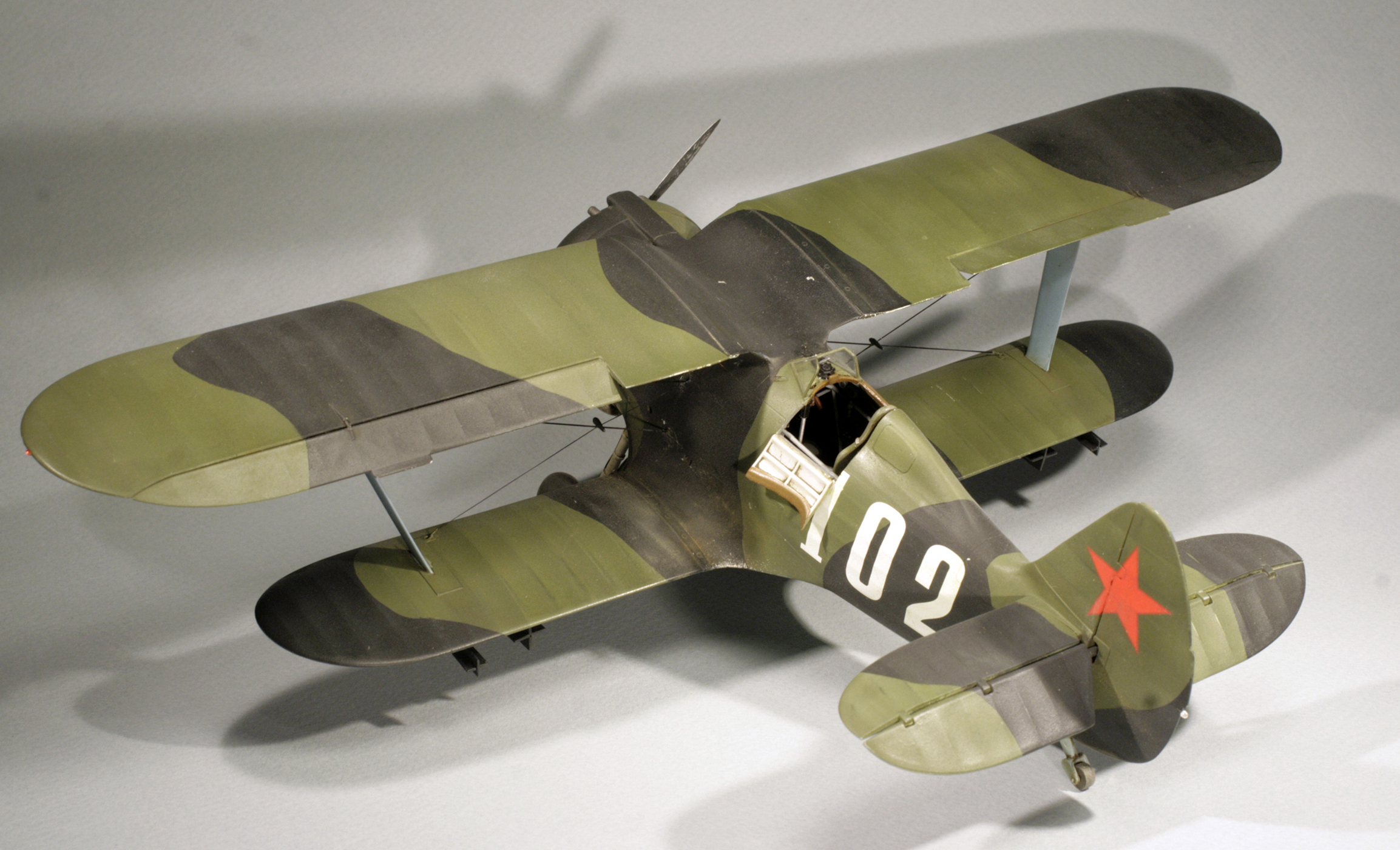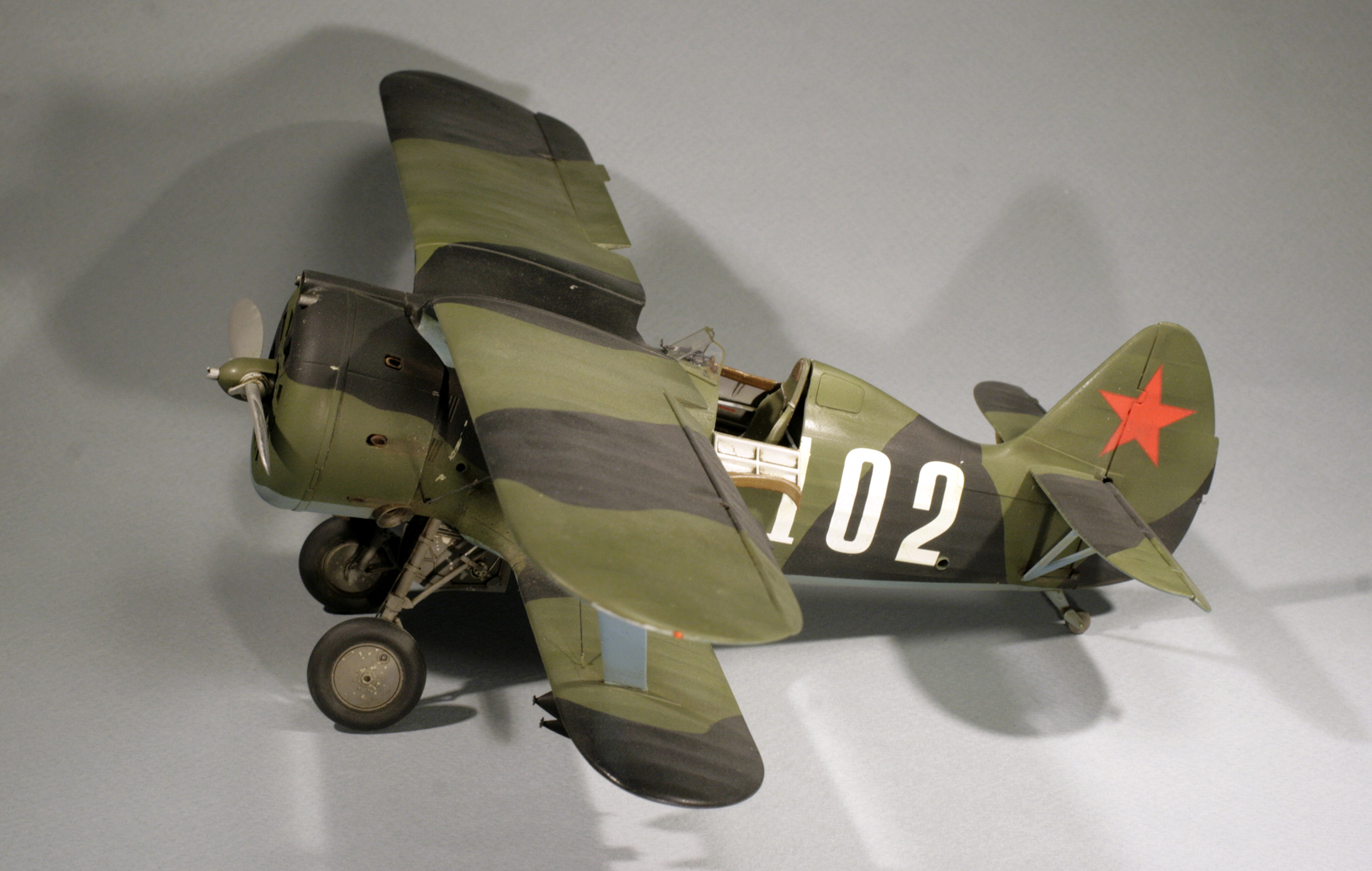 Стыковка модели внезапно оказалась посредственной. Конструкции фюзеляжа не хватает жесткости и посадочных штифтов, тем более половинки фюзеляжа были немного поведены. Из-за этого по стыку нижнего крыла с фюзеляжем и между половинами фюзеляжа образуются заметные уступы. Их пришлось шпаклевать. Последствия этой борьбы заметны по крупным участкам шпаклевки белого цвета. Так же очень неудачно реализован стык деталей капота.