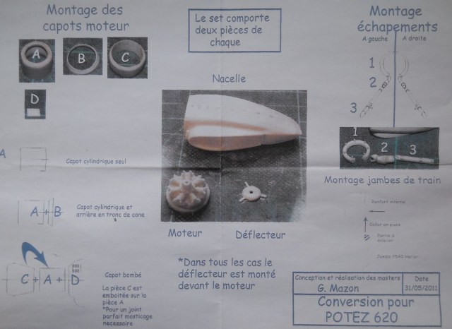 Фирма FGMmaster Dujin создана коллегами Jean-Pierre Dujin и выпускает некоторые его модели, в той или иной мере доработав исходный материал. Конверсионный набор из смолы (масштаб 1/72) упакован в картонную коробку с верхним открытием. Конверсия предполагает получение, на основе пластиковой модели от Heller(Smer) Potez 540, на выбор Potez 621, Potez 620 или Potez 650. Литьё весьма среднего уровня. Имеются дефекты литья. Мелкие детали выполнены в традиционном стиле для Dujin на листе облоя, причём качество из-за износа форм неважное. Вызывает сожаление отсутствие интерьера пассажирского салона. Ваку-фонари пилотской кабины присутствуют в двух экземплярах. Декаль содержит два варианта и выглядит вполне хорошо. Инструкция смотрится неоднозначно. С одной стороны - в ней присутствует немало информации по сборке и окраске, с другой стороны – в ней отсутствует вариант окраски на гражданскую версию Potez 621 и Potez 620, что является явным недостатком.