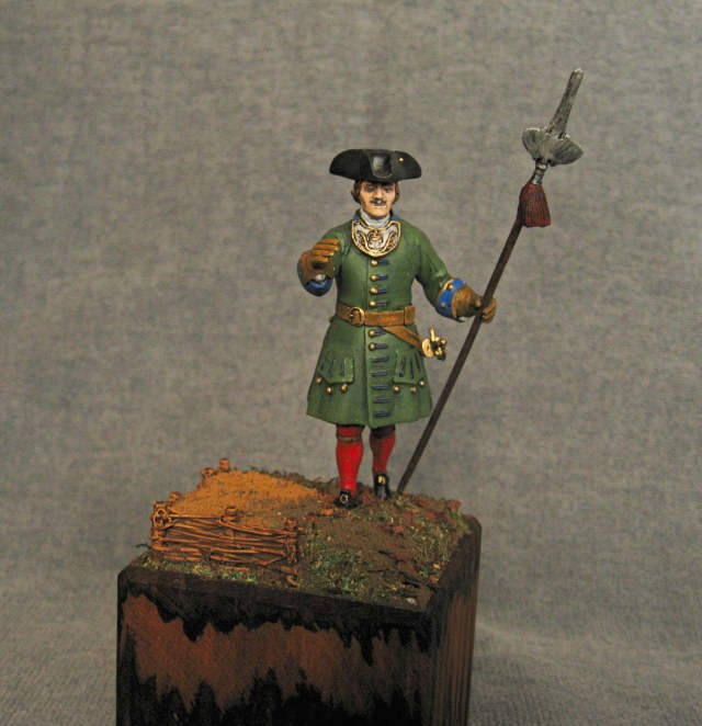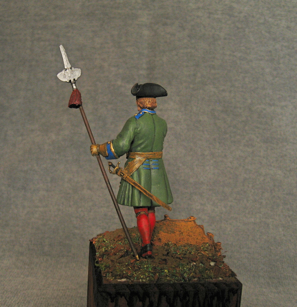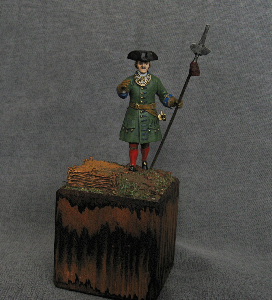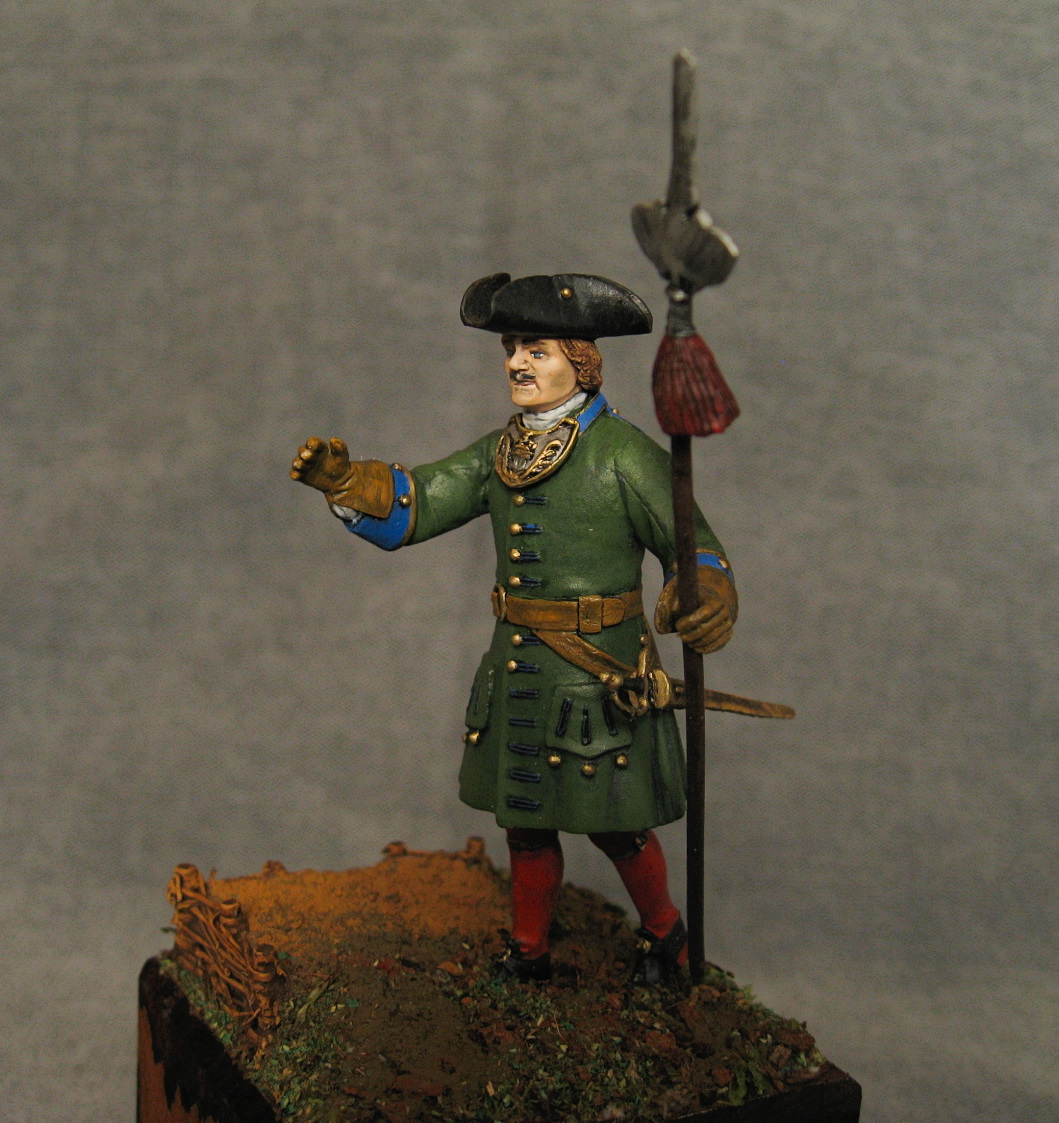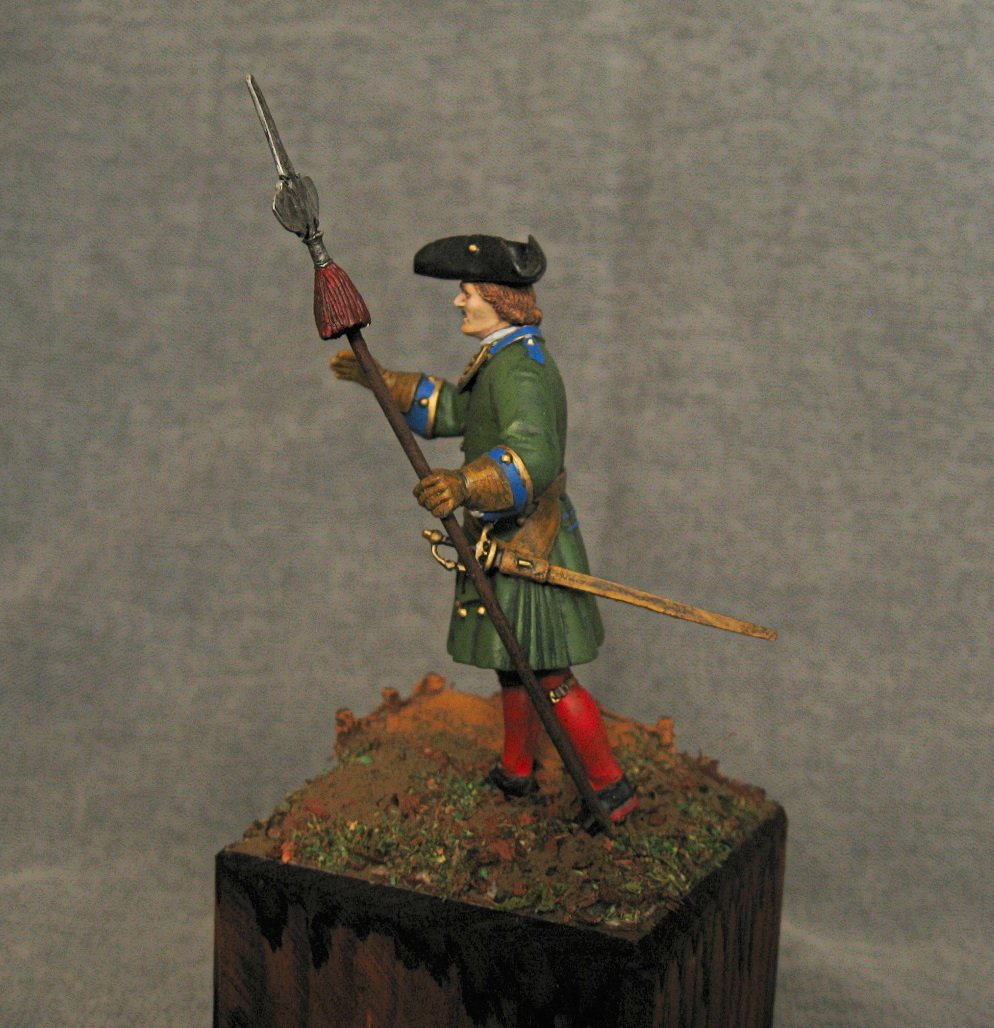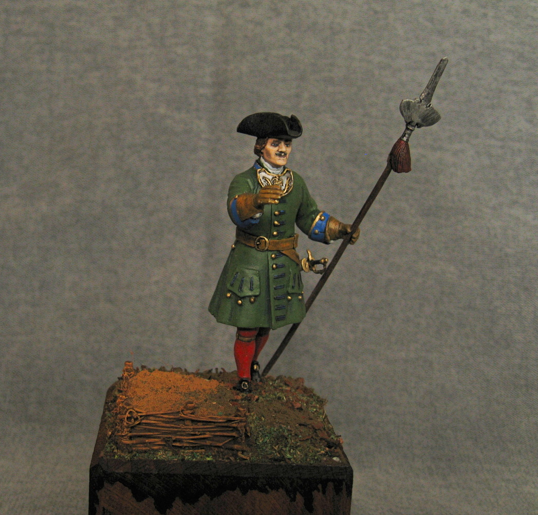 Здравствуйте. Вот такой получился поручик. Период 1706-1708 год. Офицерский знак взят и подогнан из другого комплекта. Относительно кистей на протазане - их достоверность, имеется только от регламента 1721 года. Акрил, эмаль, немного масла.