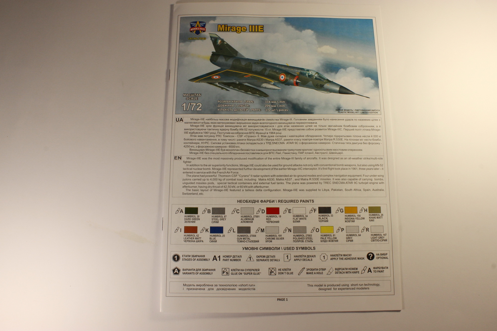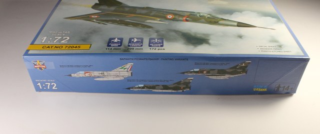 Коробочка из плотного картона, с верхним доступом, стандартного размера. По бокам варианты окраски, собранная модель, инфа про размеры модели и списочек из того, что планируется в серии Mirage III.