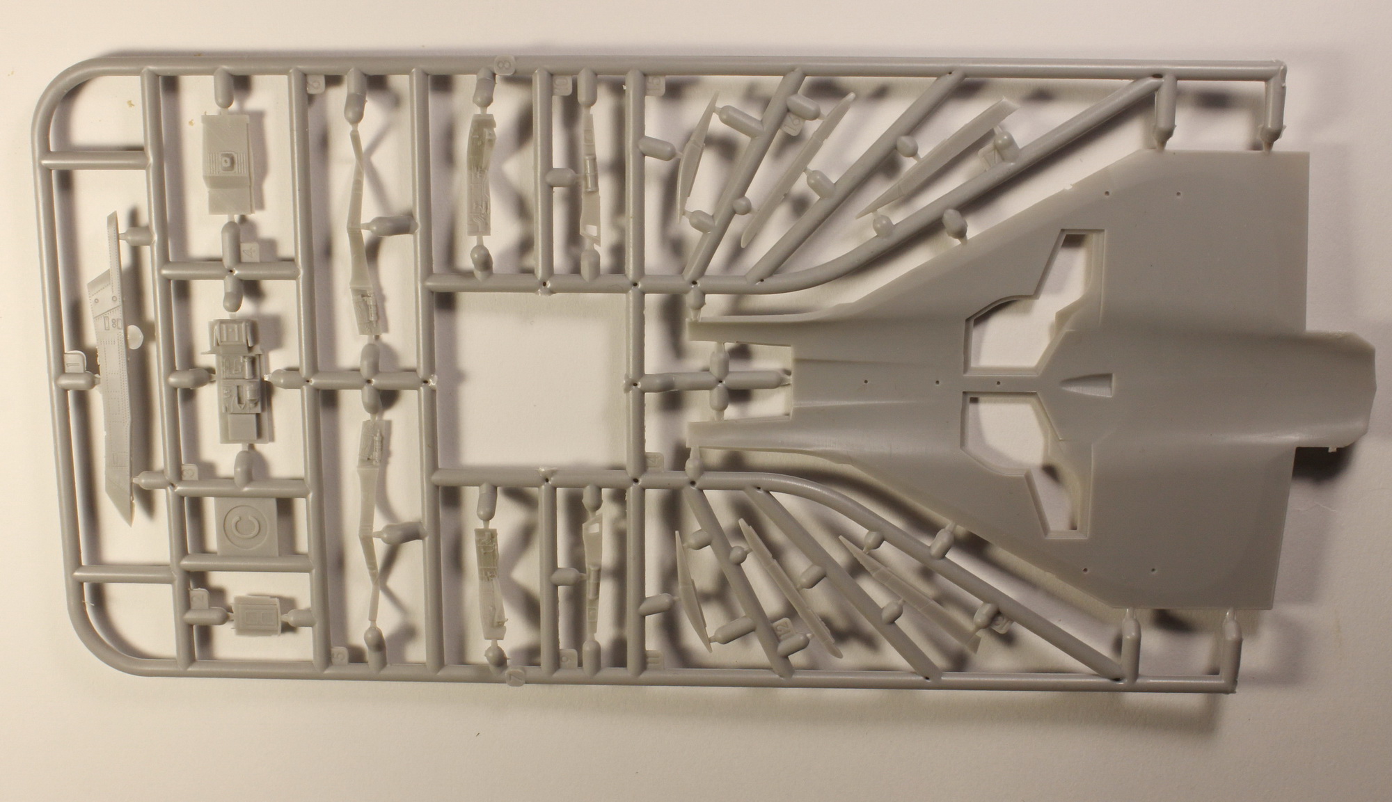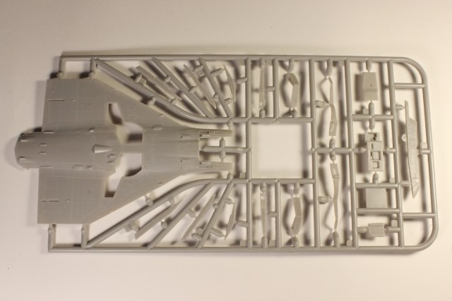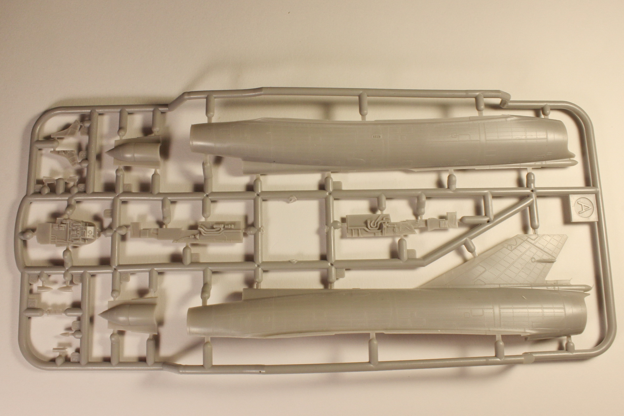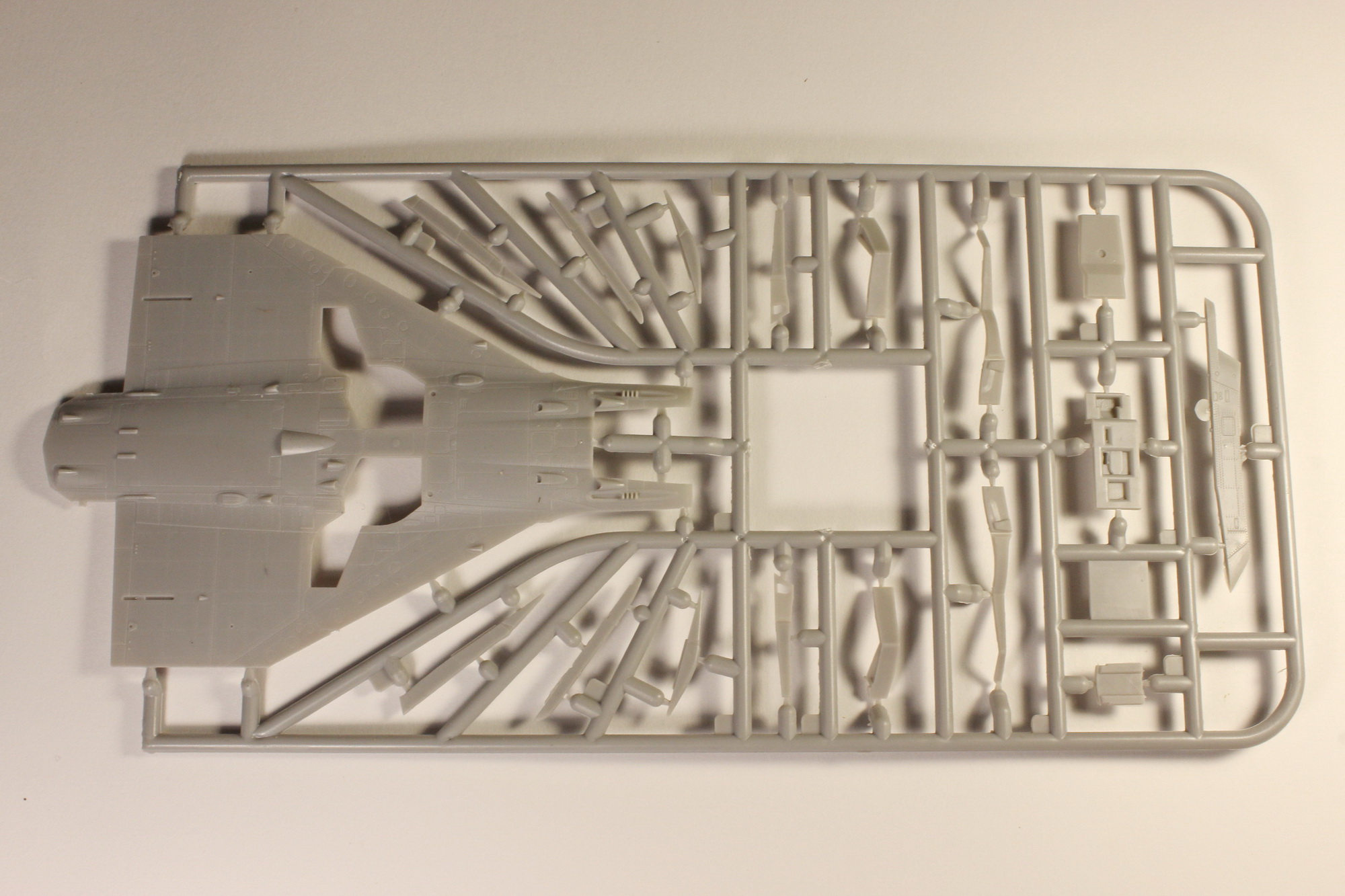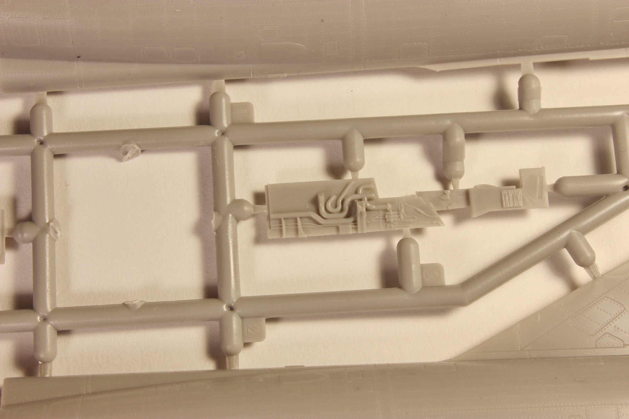 Литники. Пластик серого цвета. Детали выглядят отлично, утяжин не обнаружил, облой минимален. Вся модель проклепана, расшивка аккуратна. Визуальное сравнение с конкурентами SH (Mirage F1) в пользу Modelsvit. Понравилось исполнение узла ВЗ – не будет лишнего места для обработки.