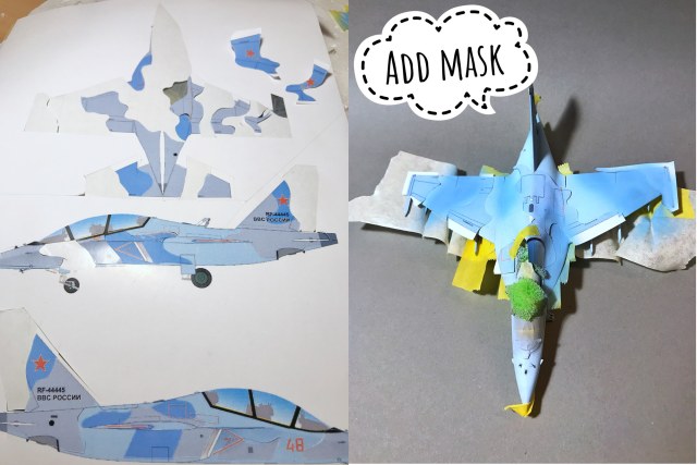 Итак, главная ошибка - решение использовать самоклеющуюся бумагу в качестве масок. Я распечатал камуфляж в масштабе 1:1, вырезал и понадеялся, что счастье не за горами. Даже на ладонь предварительно наклеивал. чтобы смягчить последствия. Но нет, умные люди не зря говорят не делать так. Посрывало краску во многих местах. Очень грустно. Переделывать не стал уже, закрасил как мог.