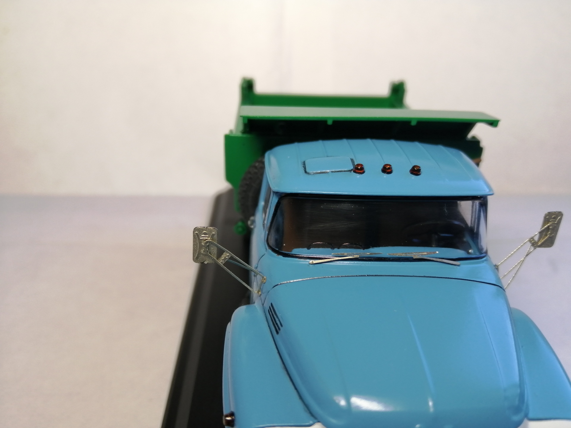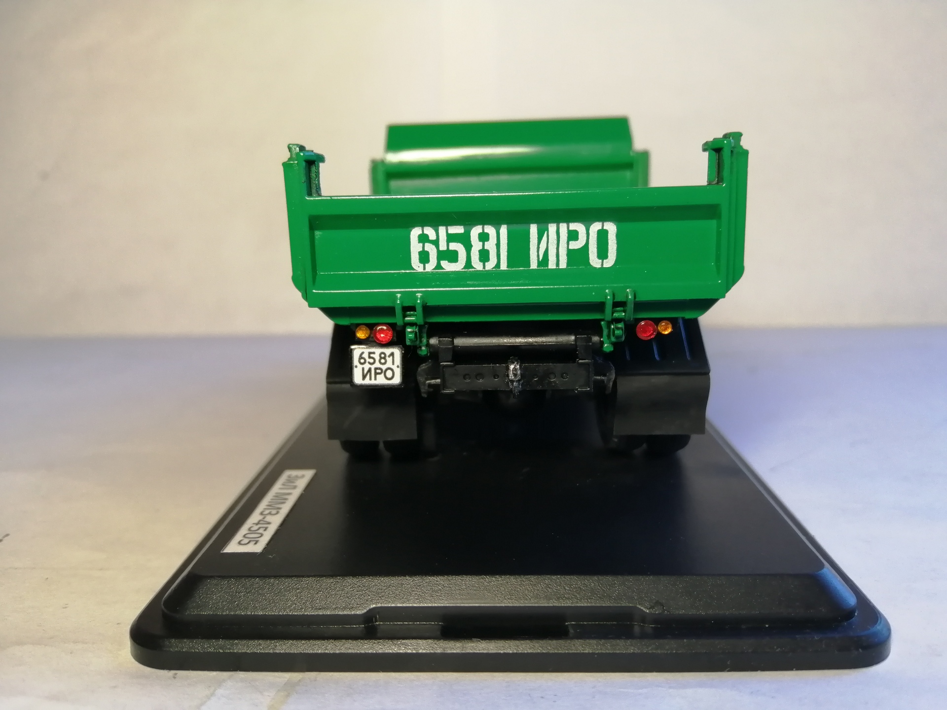 Изкоробочная сборка. Из переделок: спилен один люк, добавлены огни автопоезда, зеркала фототравление ПетроградЪ, попытка имитаций камазвской тормозной системы (более крупные тормозные камеры, дополнительные ресиверы, устройство "алкоголик" под пассажирской ступенькой), измененная приборная панель под камазовские приборы. Декали от "народная декаль". Покраска баллонами "Мотип".