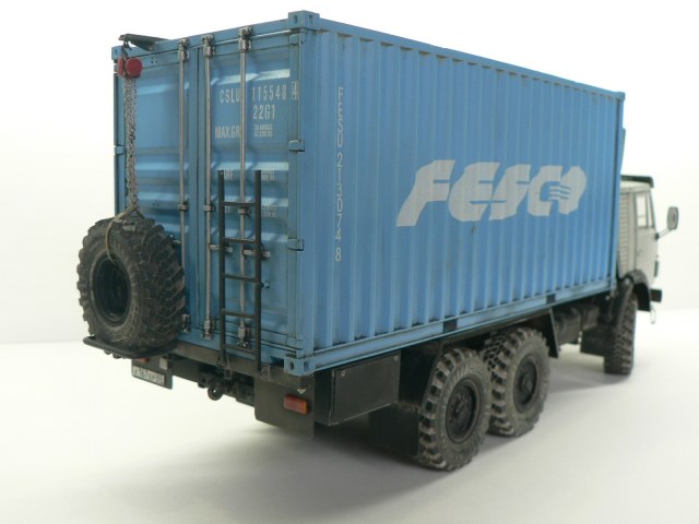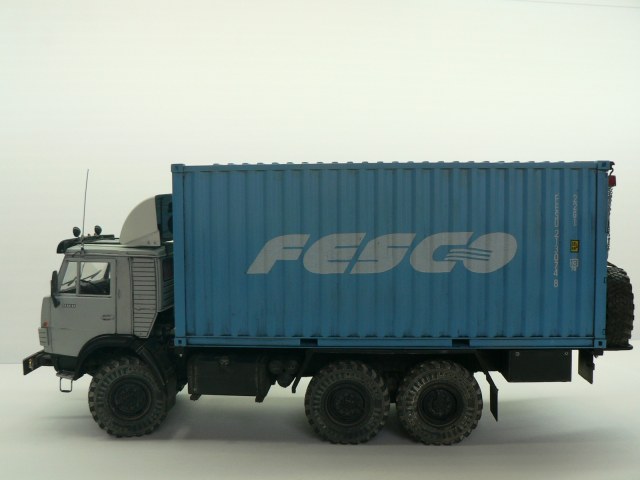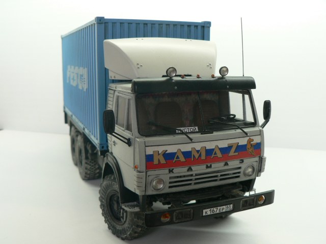 Добрый день, коллеги. Решил продолжить линейку контейнеровозов, представленных на КАРОПКЕ. Собирательный образ по фото из инета. За миллиметрами не гнался, в матчасть не вникал. С малярными работами сложные отношения, лучше пока не получается. В основе широко известная в узких кругах модель КАМАЗ 4310 от ICM (арт. 35001). Дополнения: - контейнер от Tpumpeter (арт. 01029); - смоляные колеса от МИНИАРМ (арт. В35130); - передняя панель кабины от Комплект ЗиП (арт. ZIP35096); - фототравление от Микродизайн (арт. МД 035218); - фары на козырьке от Эльф; - декали от Алексея (штучные декали на заказ). Обтекатель, козырек, спальник и прочее - самодел из пластика, проволоки (рамка под обтекатель и козырек) и смолы ЭДП(козырек). Окраска аэрографом, акрилом TAMIYA. Смывка- масло Невская палитра. "Пыль" на колесах – пигменты WILDER. Хочу выразить благодарность Роману(Пастор) и Сергею(Сфинкс) за помощь в работе над моделью и проведение фотосъемки.