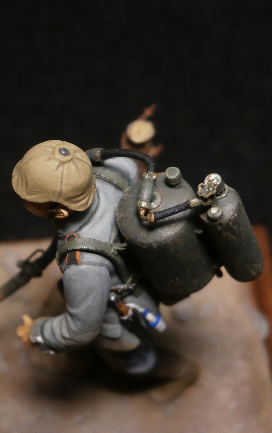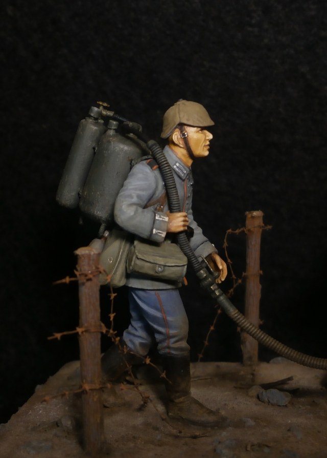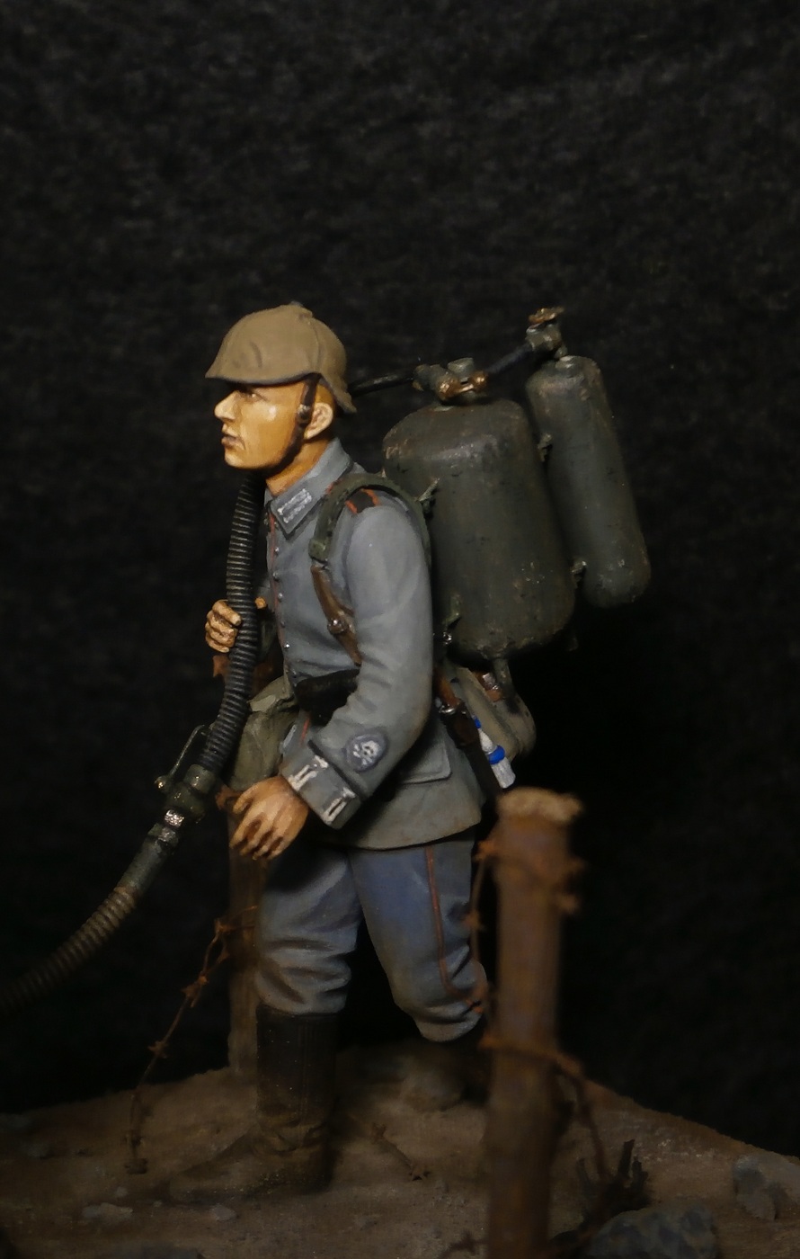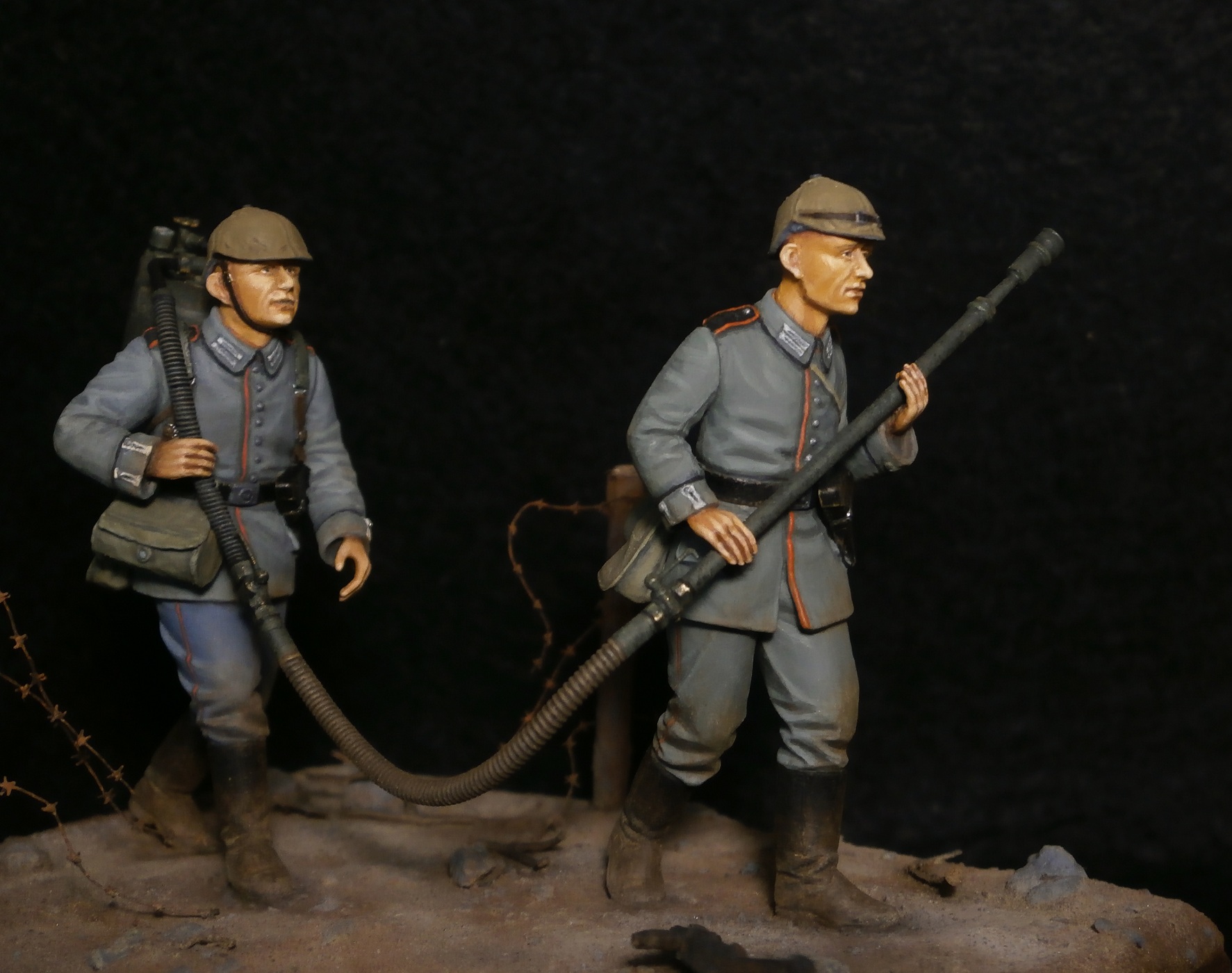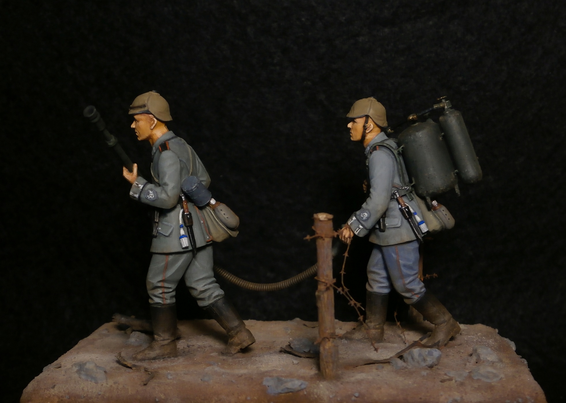 Немецкие огнемётчики из Garde Reserve Pionier Regiment с огнемётом kleif m15 ранней версии, август 1916 г. Основой послужил набор германцев на 1914г от ICM. Огнемет сделан с нуля из подручных средств и тамиевской шпаклевки, шланг - струна бас-гитары. Роспись акрилом zip-макет и валехо.