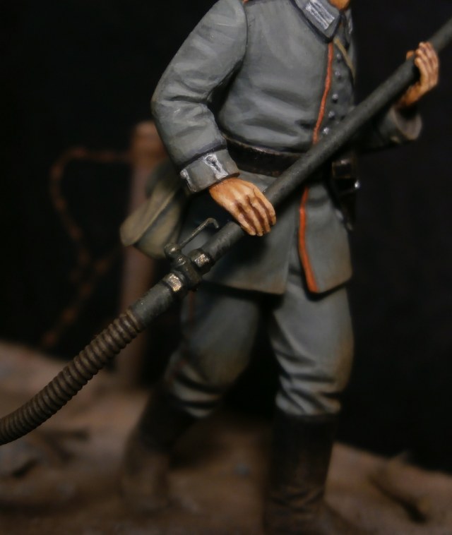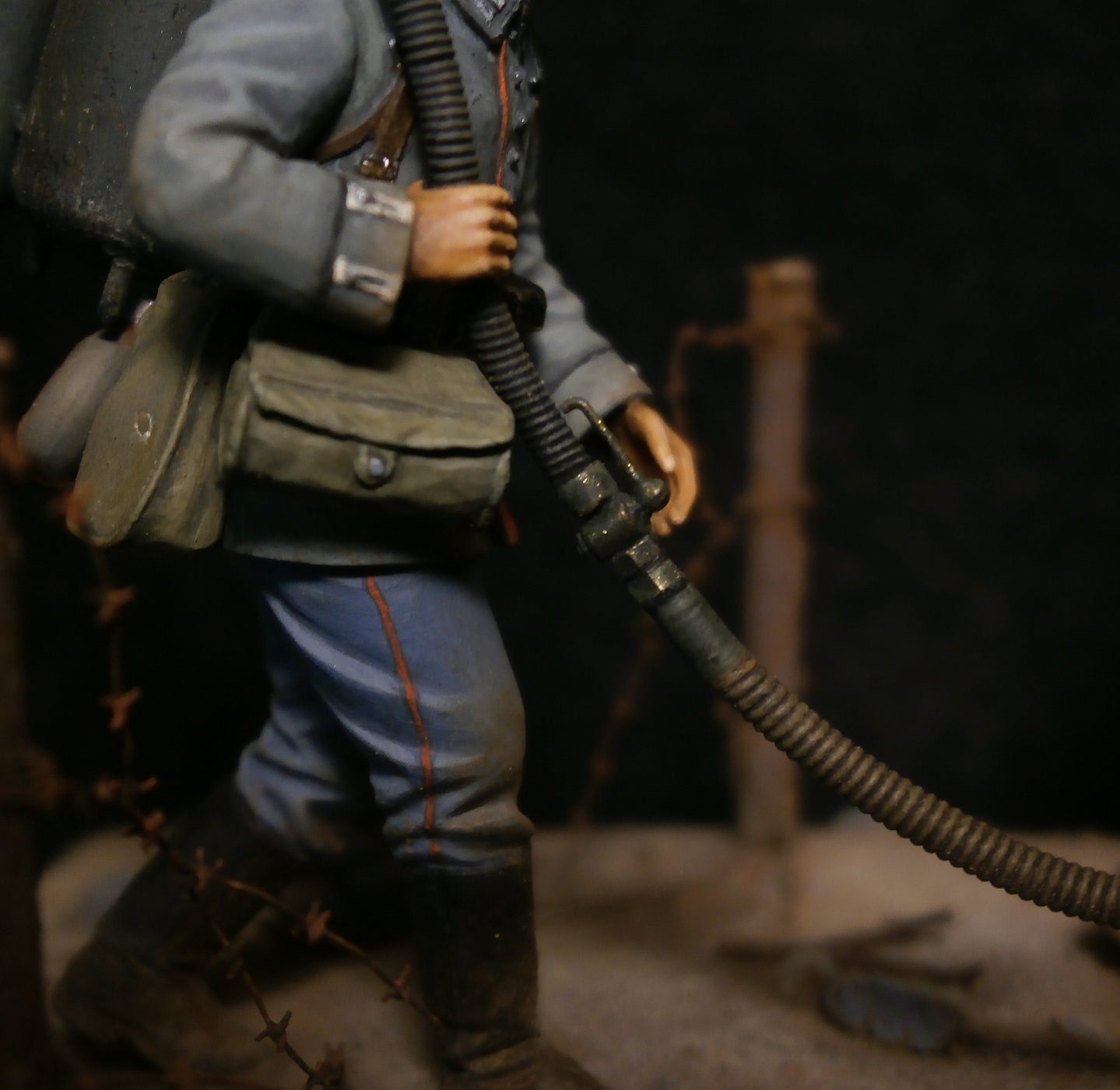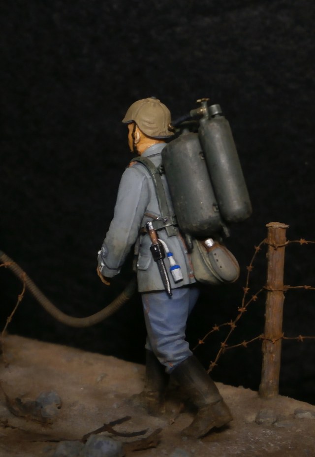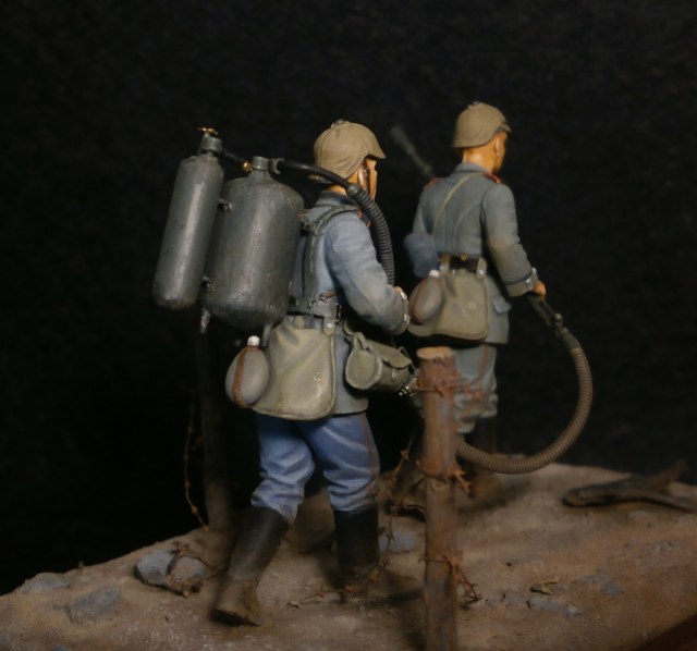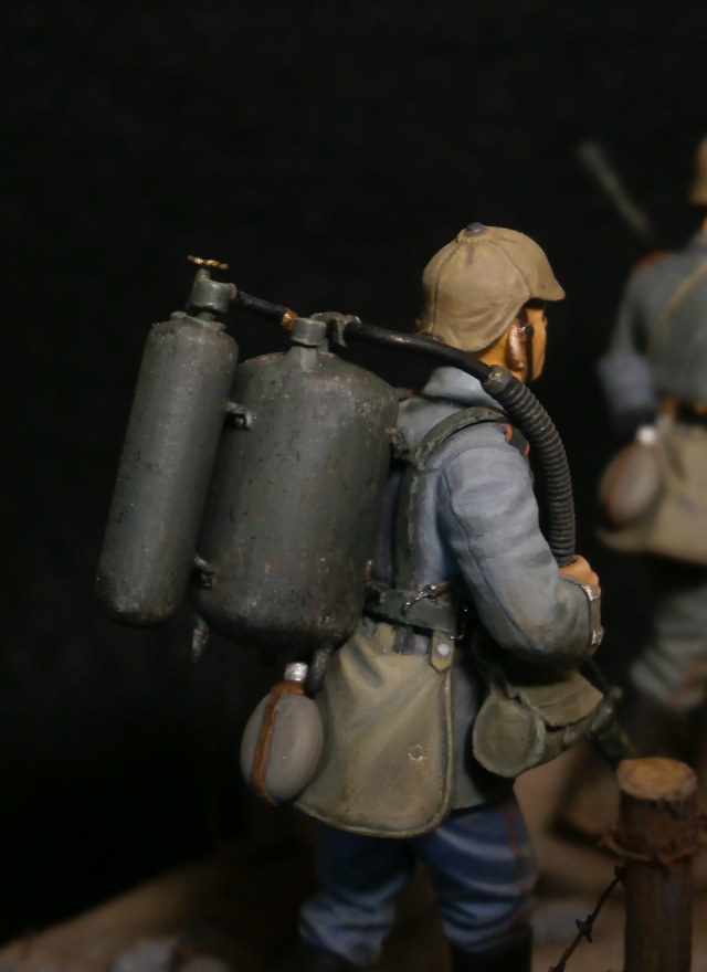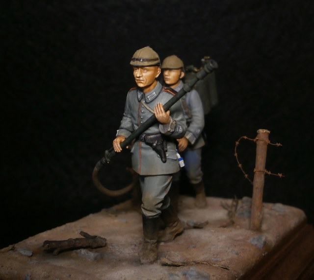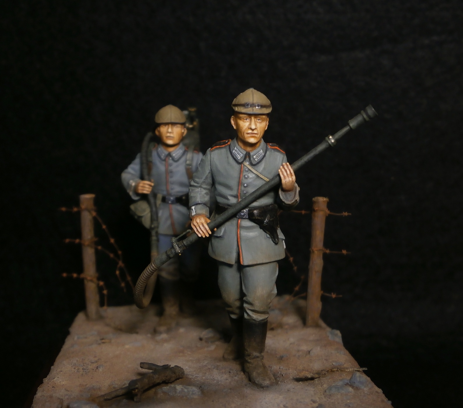 Немецкие огнемётчики из Garde Reserve Pionier Regiment с огнемётом kleif m15 ранней версии, август 1916 г. Основой послужил набор германцев на 1914г от ICM. Огнемет сделан с нуля из подручных средств и тамиевской шпаклевки, шланг - струна бас-гитары. Роспись акрилом zip-макет и валехо.