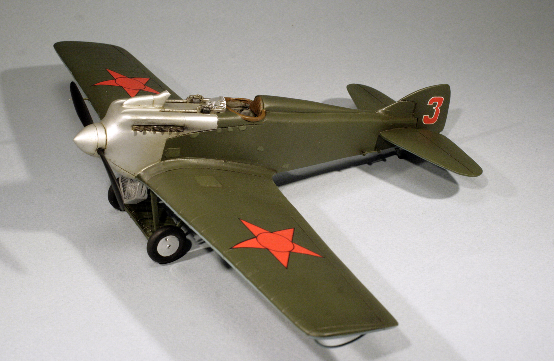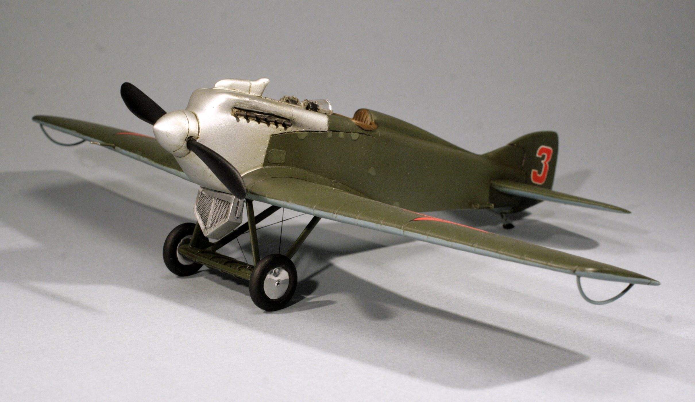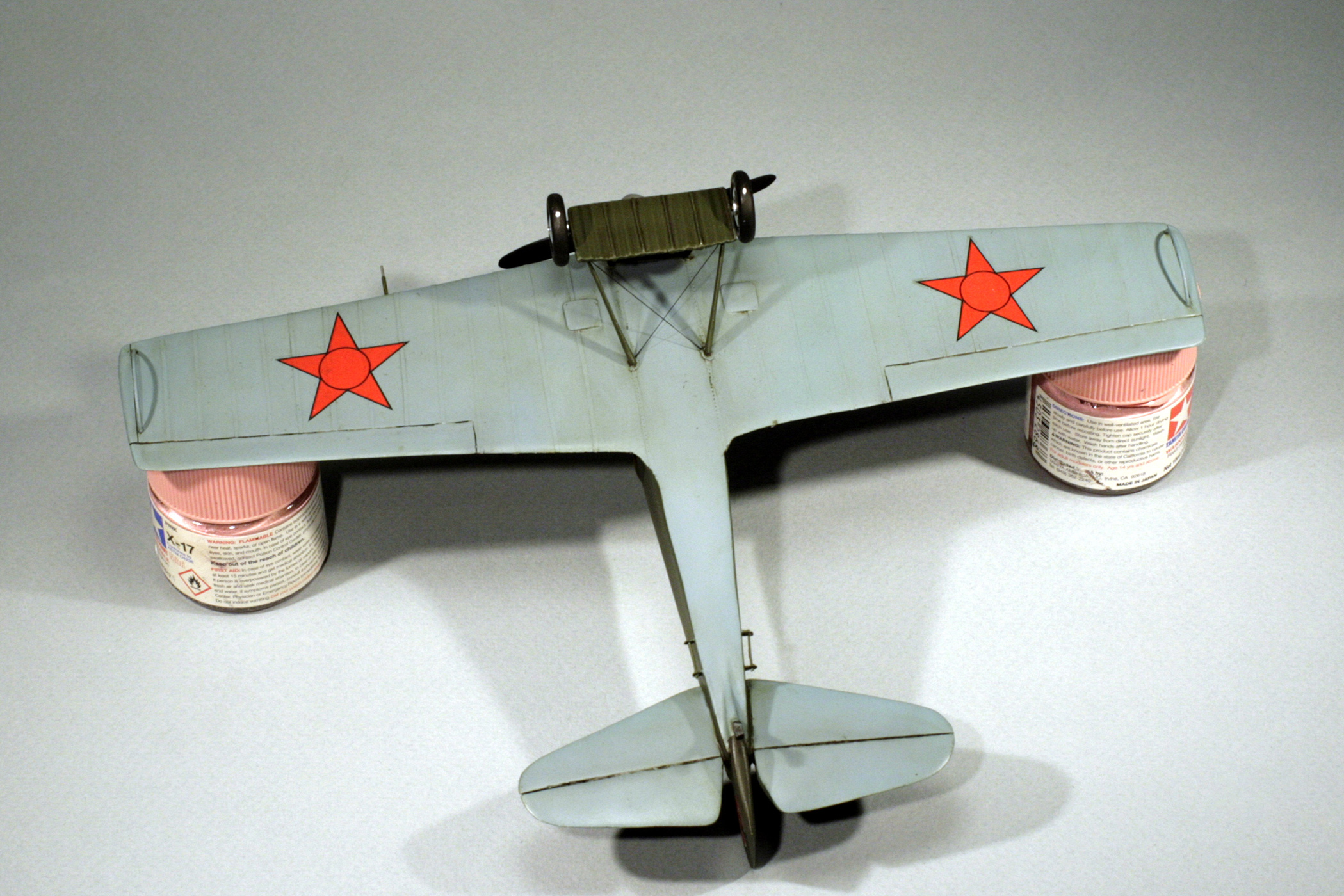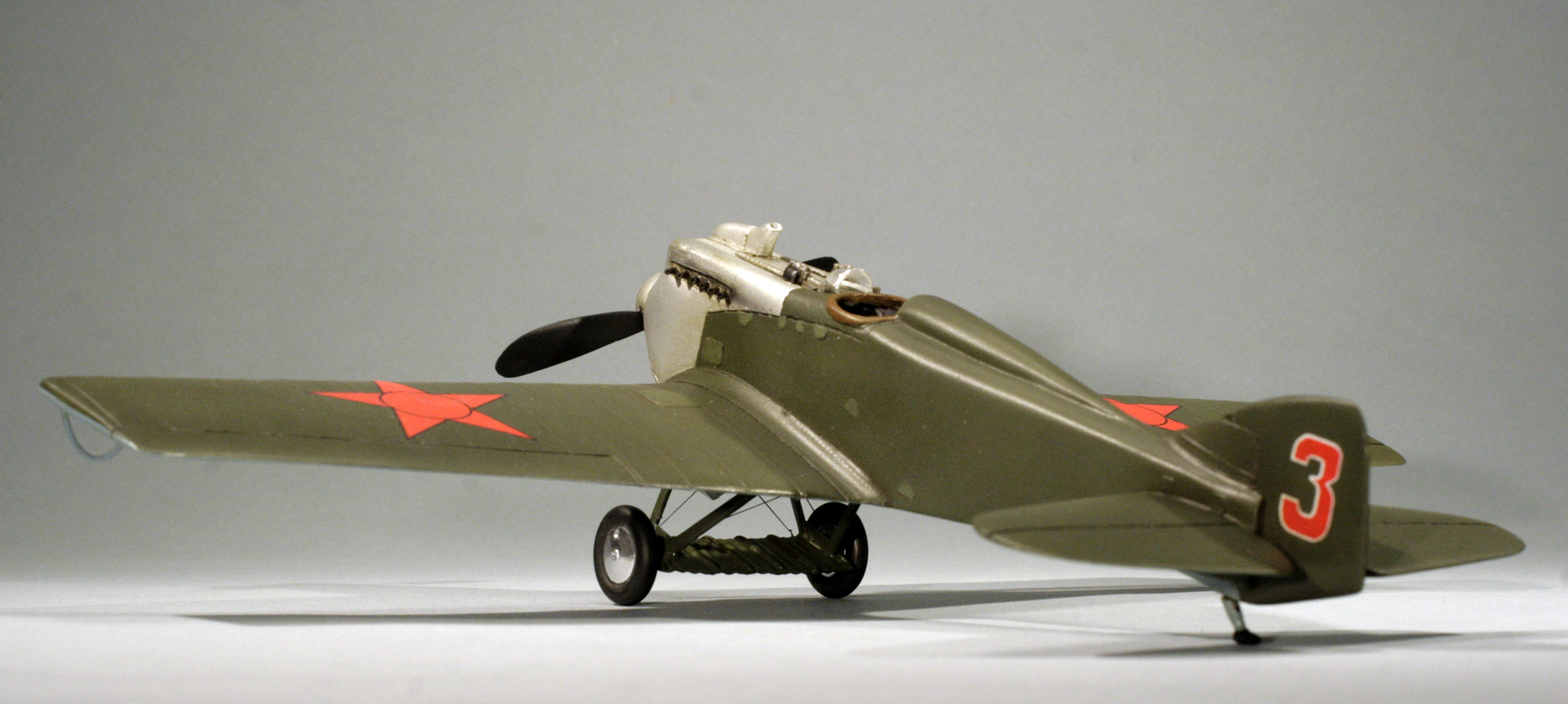 С нуля был сделан бортик кабины и подушка за головой пилота, решетка на радиатор, из запасов взяты колеса шасси, стволы пулеметов, патрубки сделаны из тянутой ушной палочки, козырек кабины выдавлен из ПЭТ-пластика.