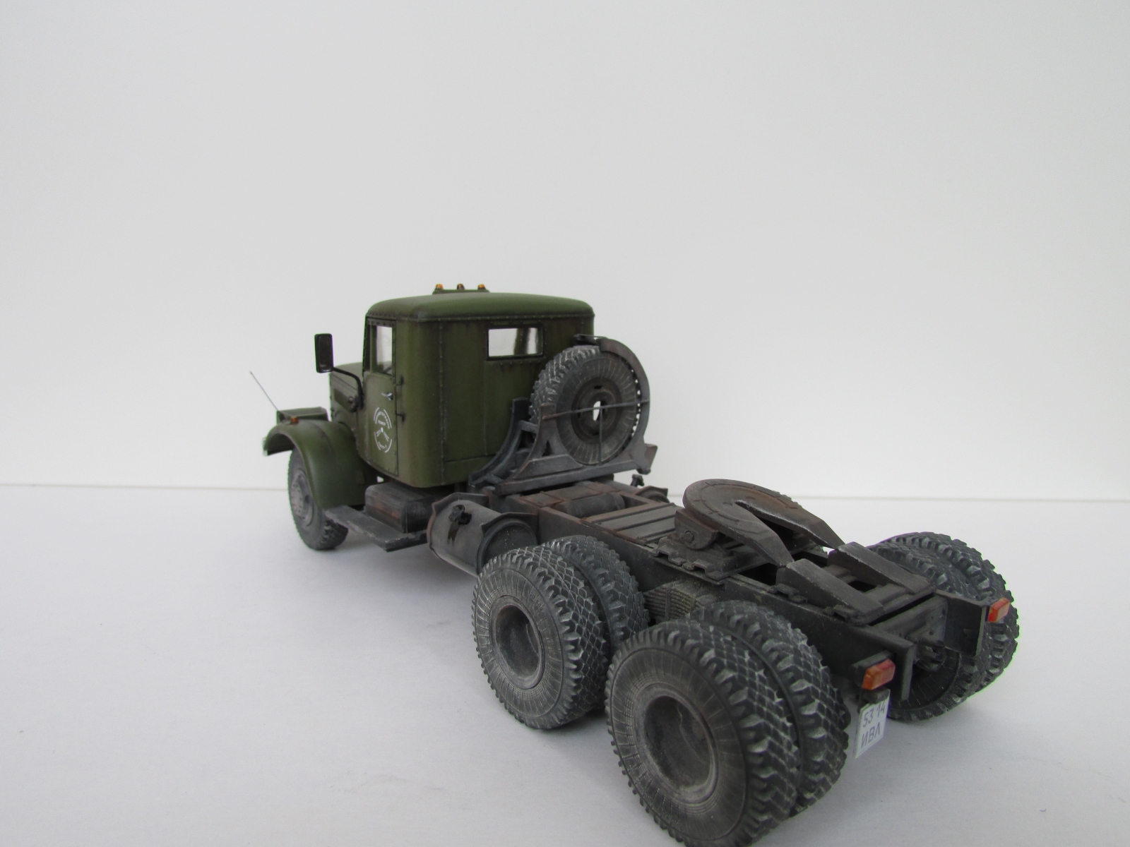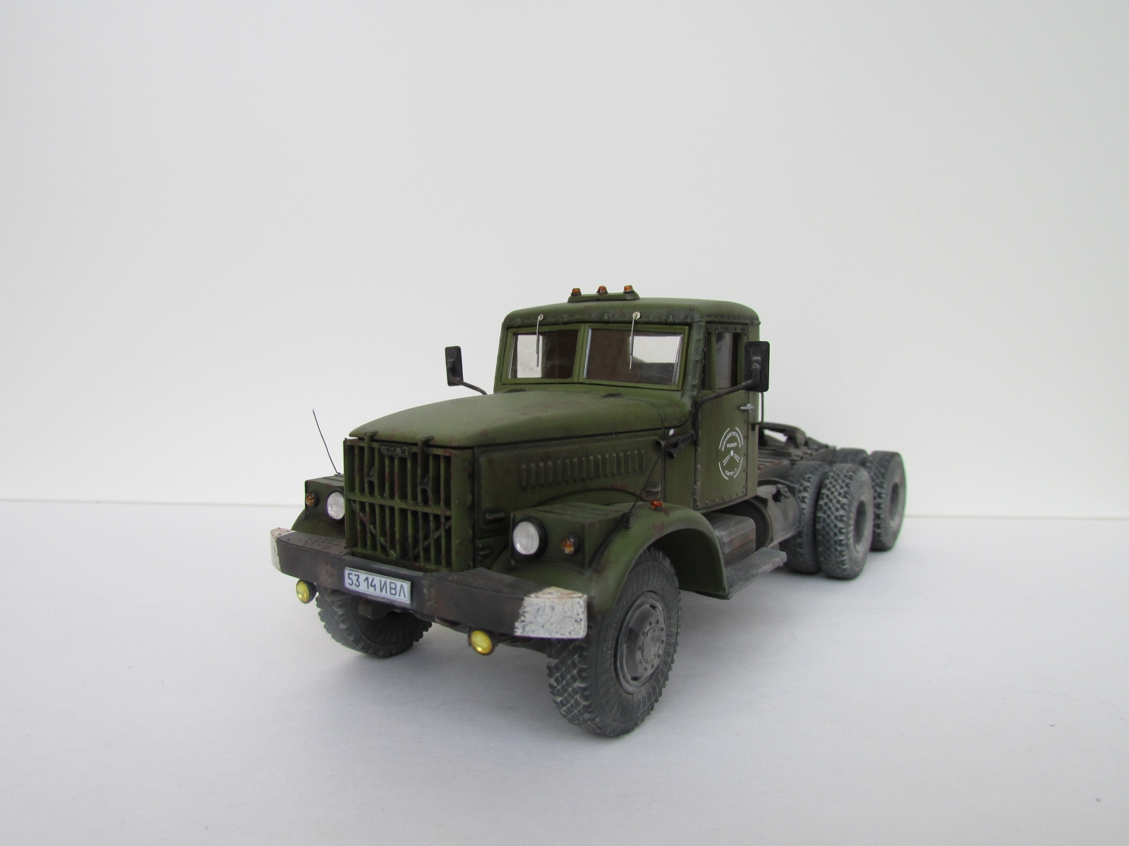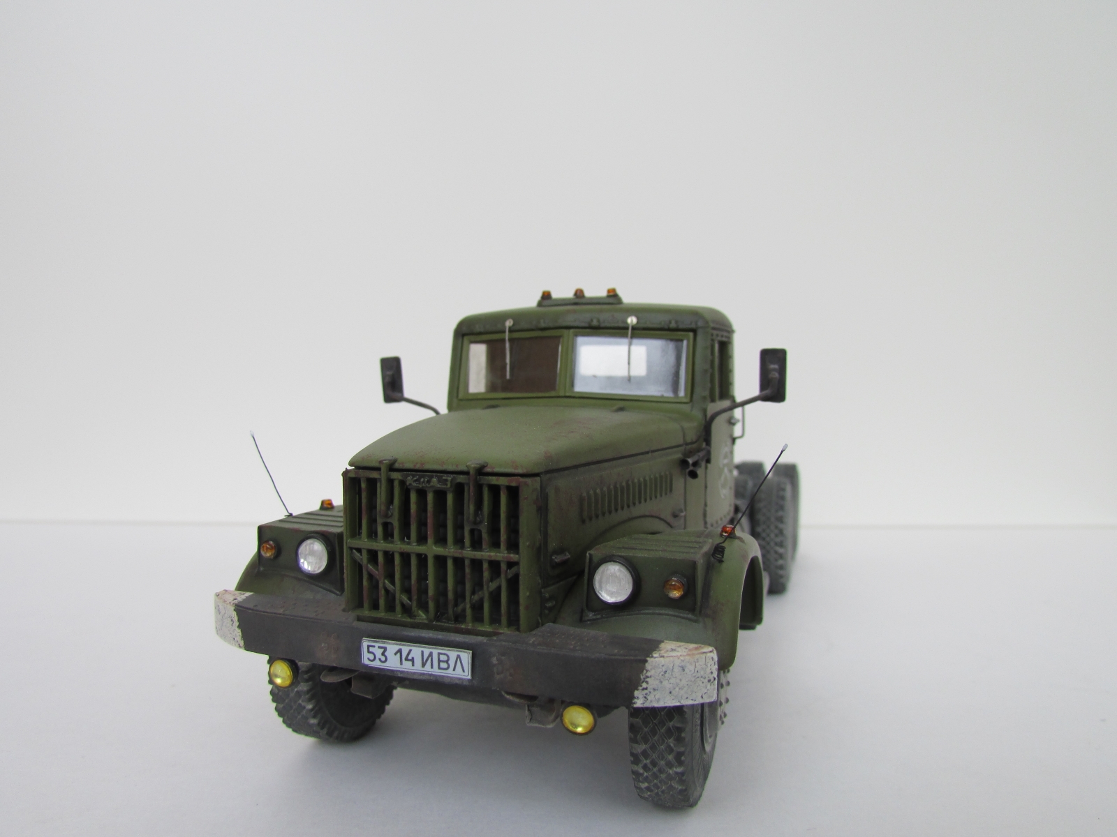 Еще раз приветствую коллеги !!! Крайняя модель на 2018 год , Практически изкоробка , за исключением некоторых внешних доработок : были сточены поручни на кабине и изготовлены из скрепок для степлера , габаритные усы из проволоки , слегка довел до ума ДЗК , туманки эльф. Окраска : база Валехо , смывка Тамия, пигменты Миг.
