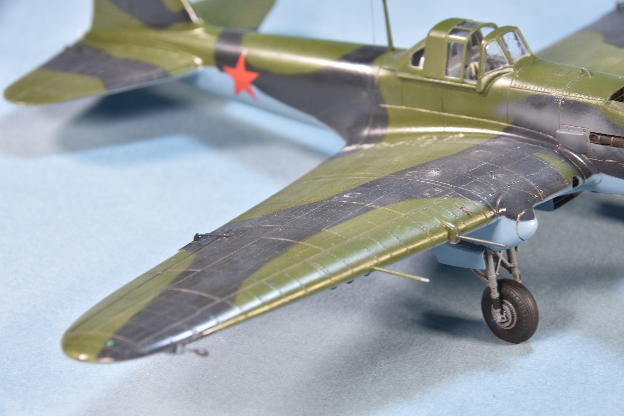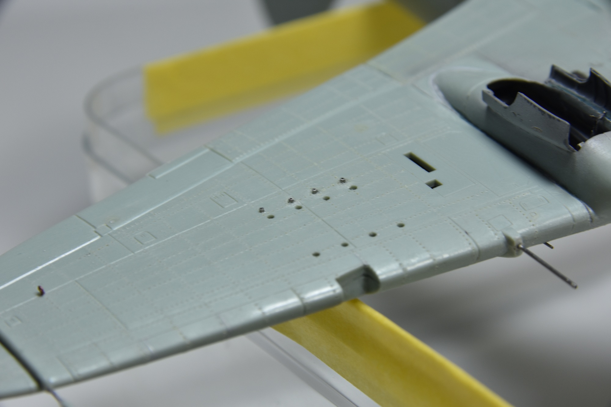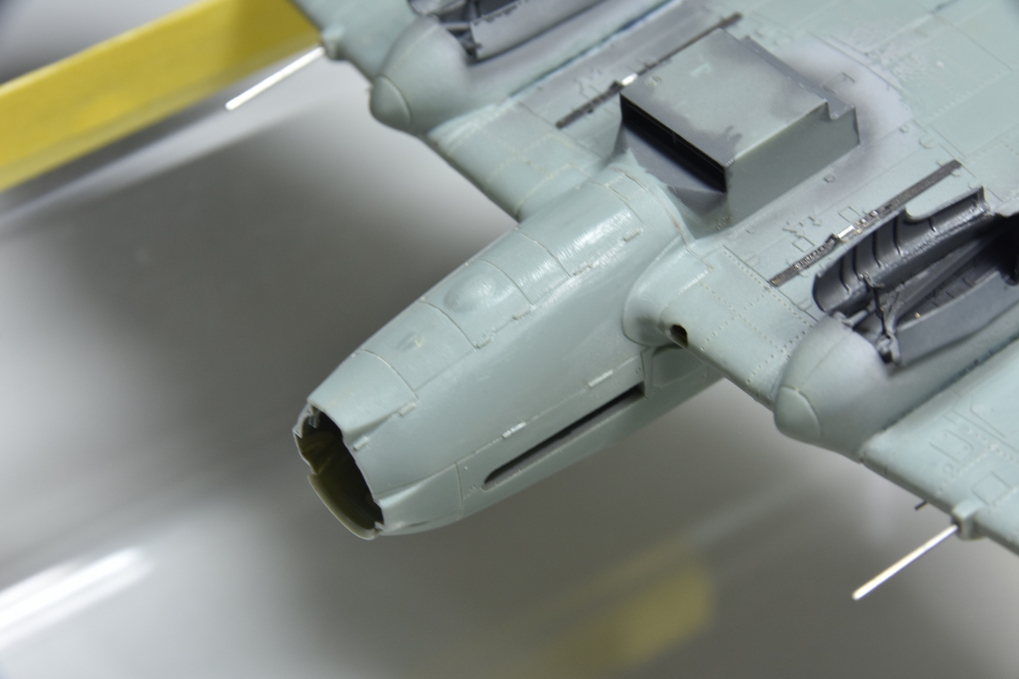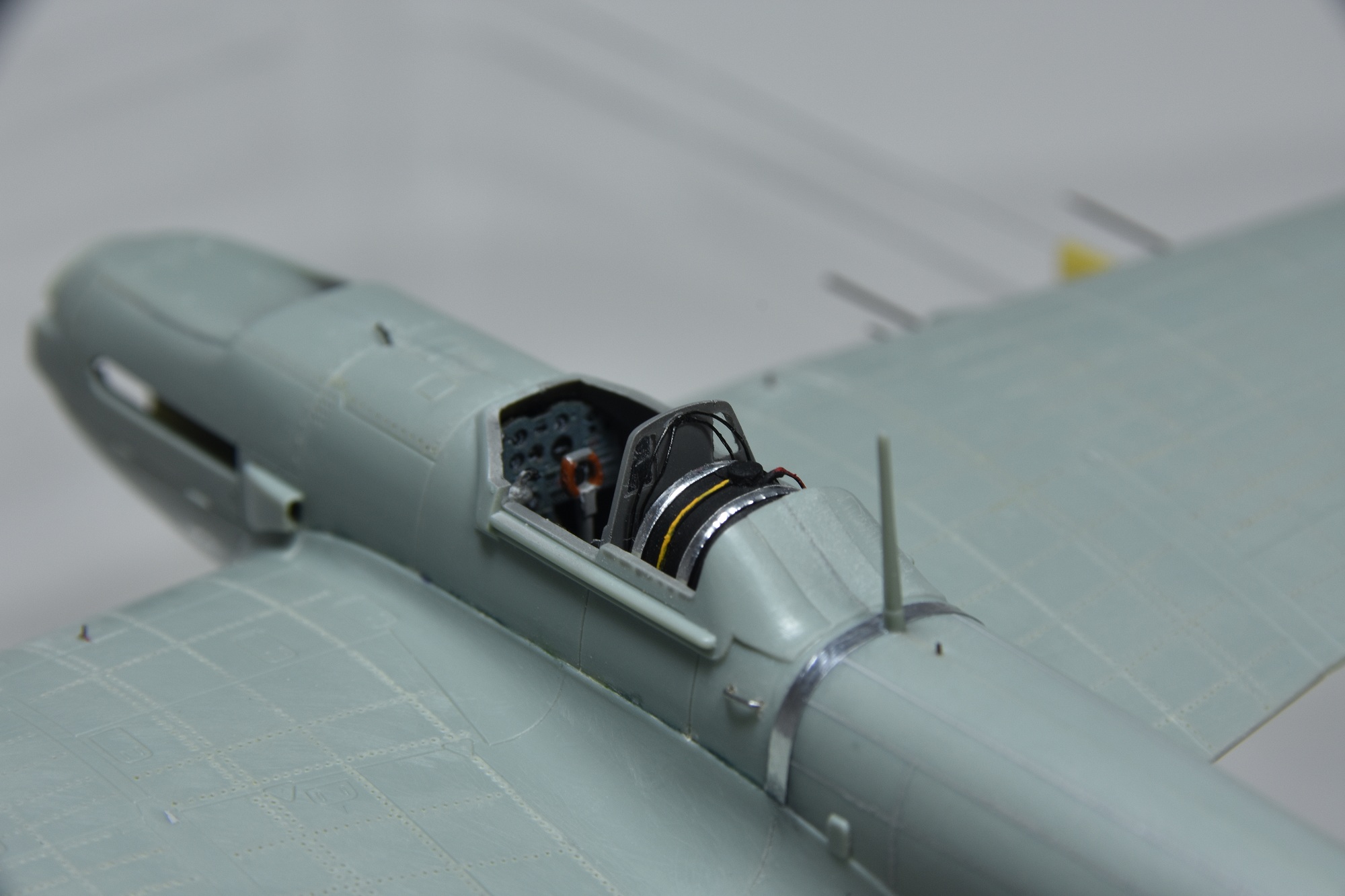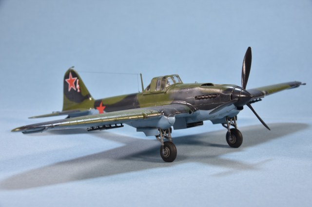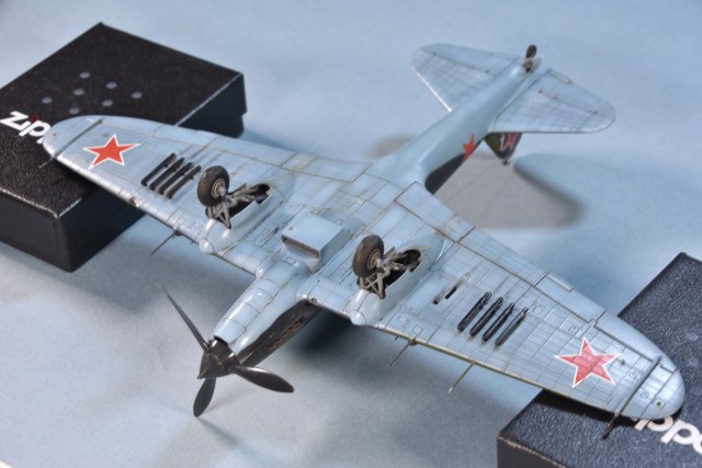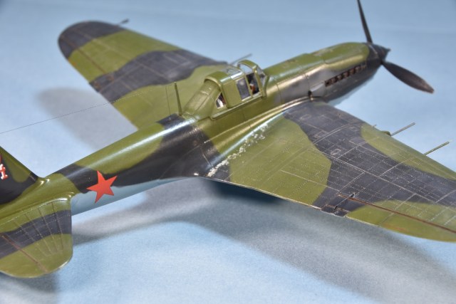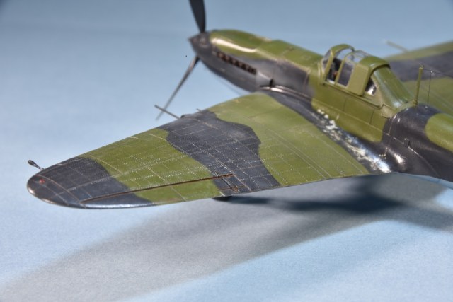 Представляет из себя некий микс из крыла под пушки ВЯ-23 и фюзеляжа присущего ранним выпускам(имитирована "металлическая" хвостовая часть)и фильтра.Увенчает все это фонарь несколько неправильной формы.И с обломанной нижней кромкой козырька. Пластик для меня оказался слишком хрупок.Постоянно ломался в тонких местах,вызывая определенные проблемы при накатывании имитации клепа.В сборке трудности с установкой гондол шасси . Подгонкой к ним"системы" стоек.