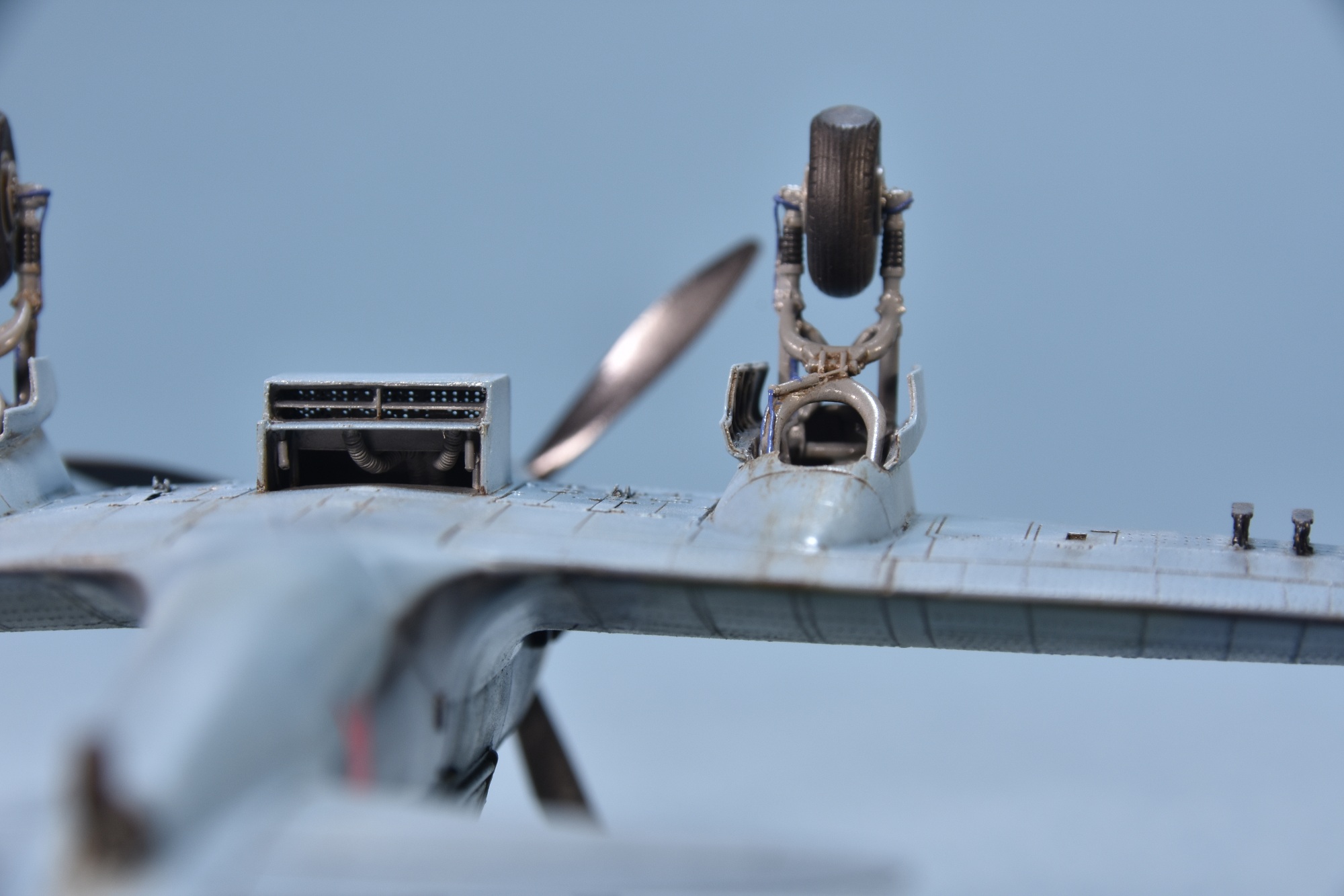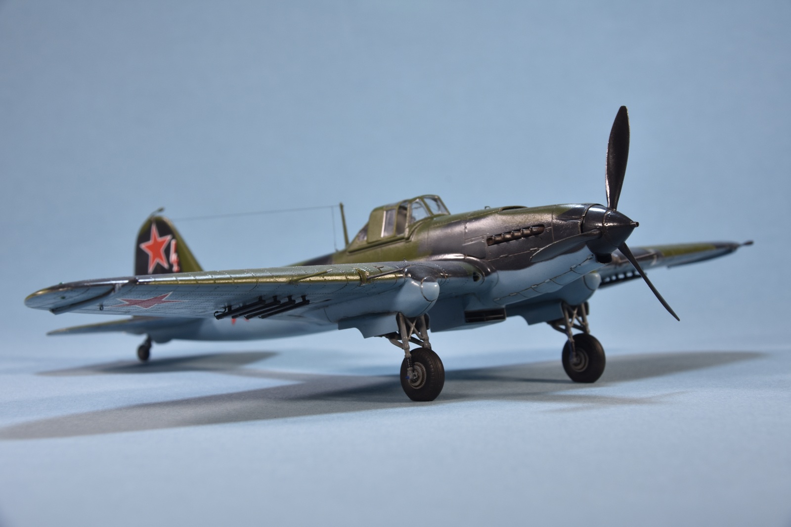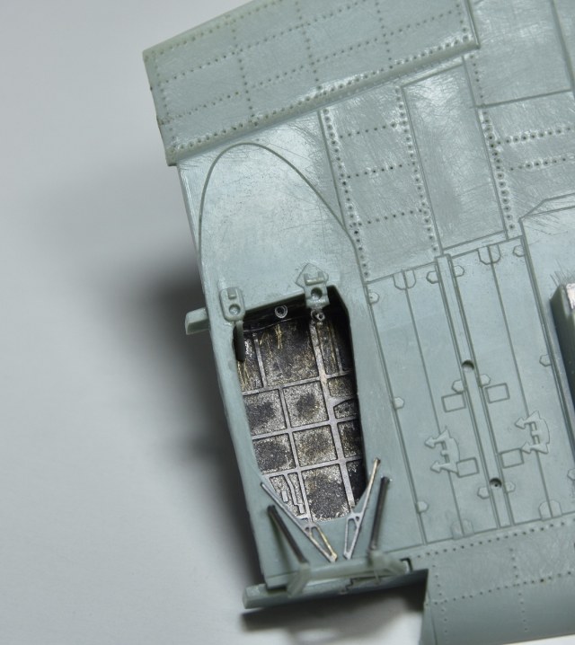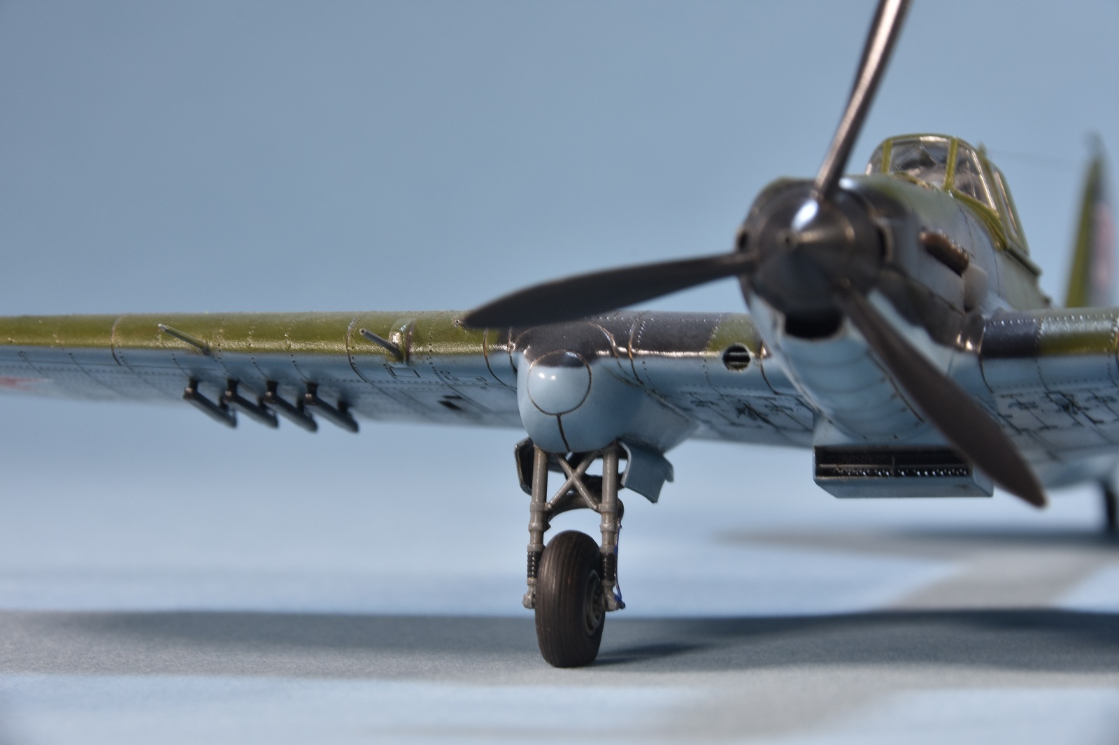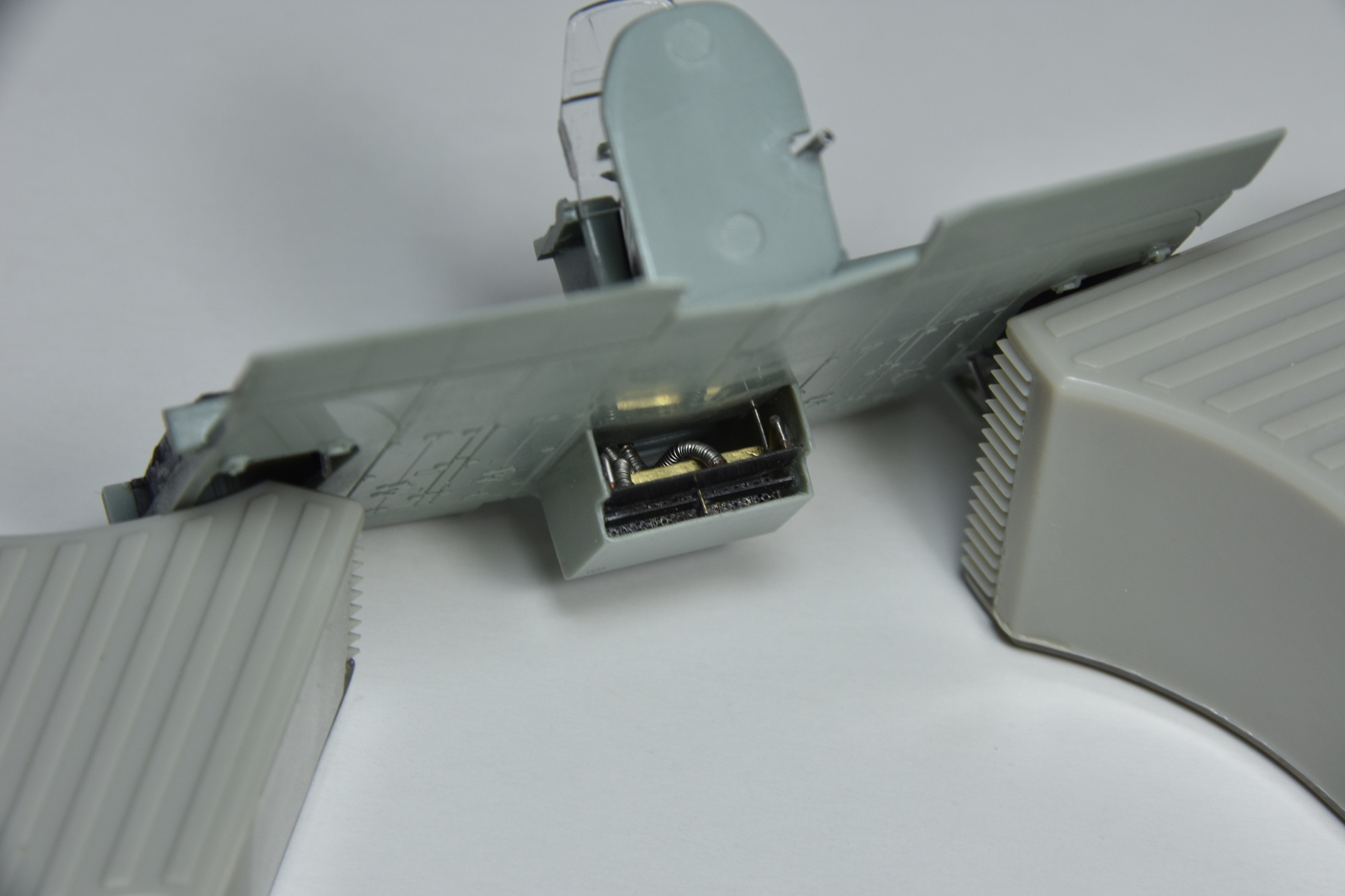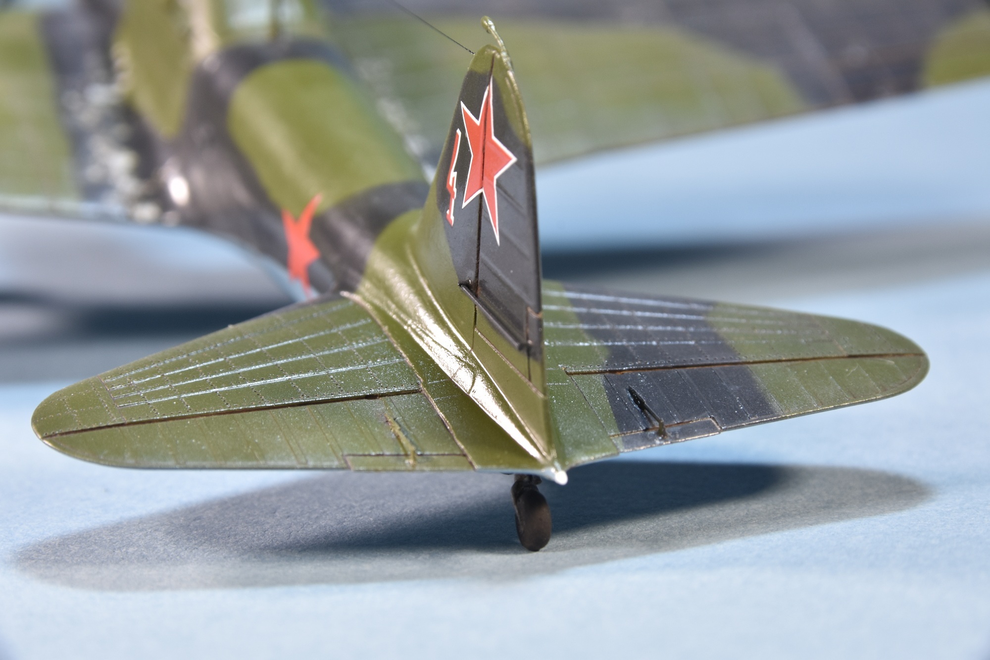 Представляет из себя некий микс из крыла под пушки ВЯ-23 и фюзеляжа присущего ранним выпускам(имитирована "металлическая" хвостовая часть)и фильтра.Увенчает все это фонарь несколько неправильной формы.И с обломанной нижней кромкой козырька. Пластик для меня оказался слишком хрупок.Постоянно ломался в тонких местах,вызывая определенные проблемы при накатывании имитации клепа.В сборке трудности с установкой гондол шасси . Подгонкой к ним"системы" стоек.