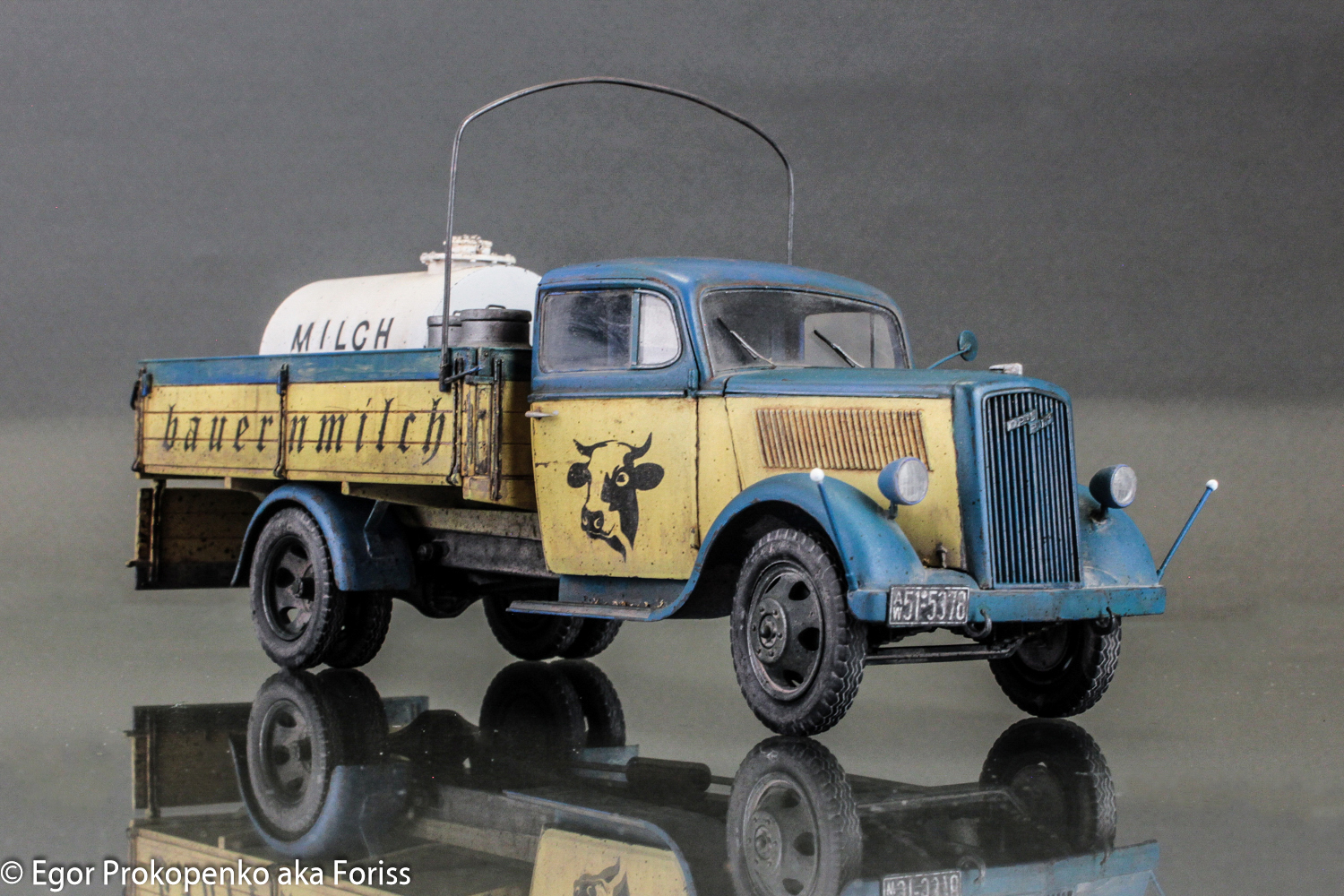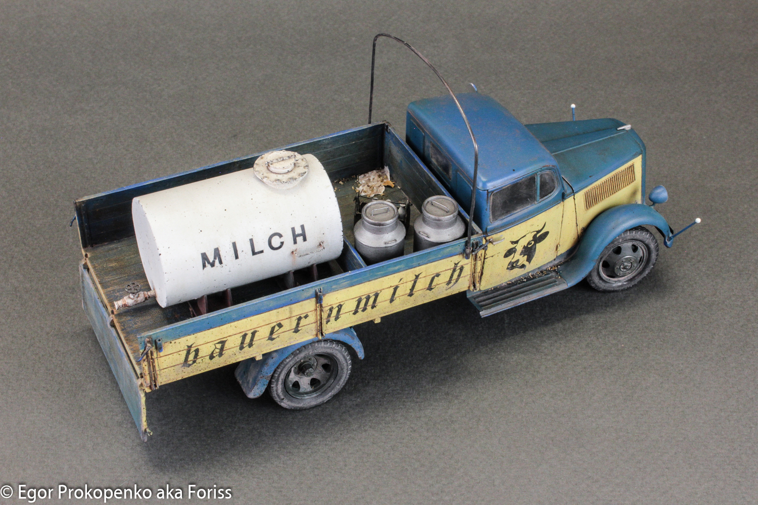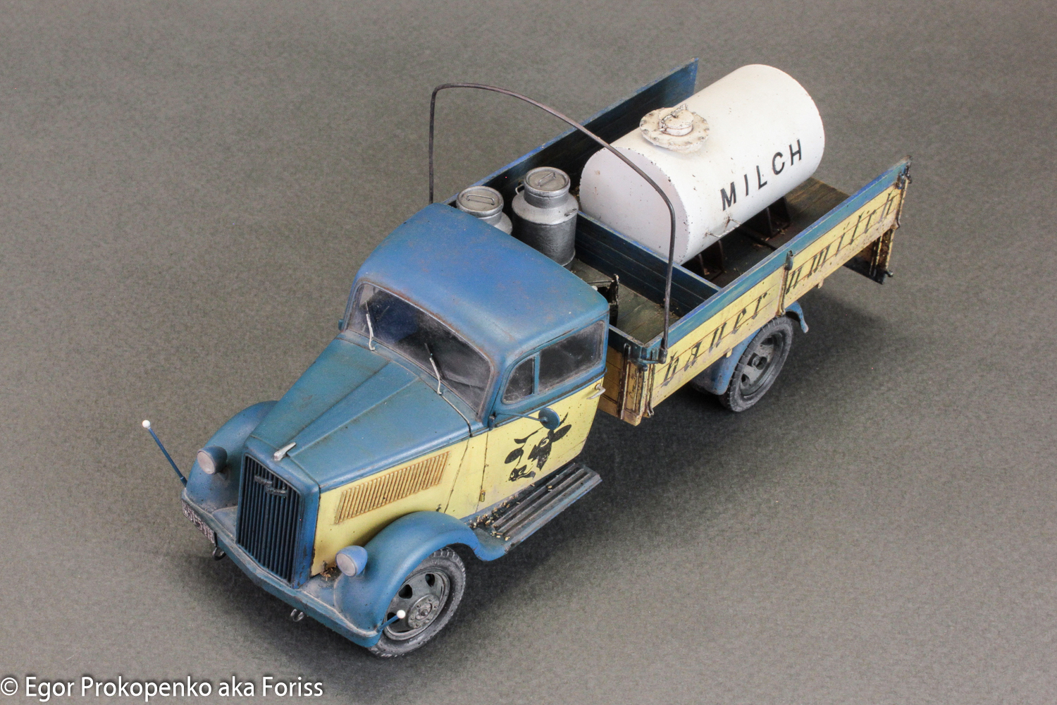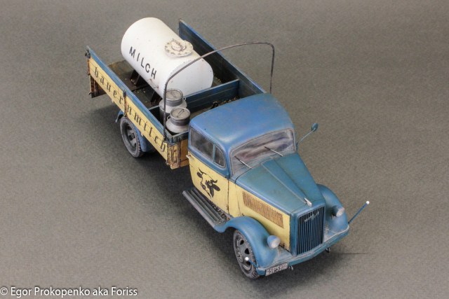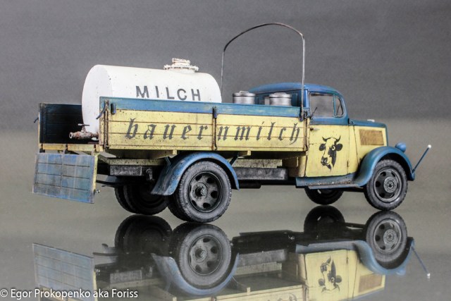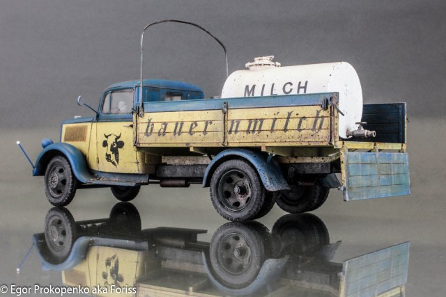 Егор, приятная глазу окраска. С интересом разглядывал с разных сторон. Единственное, на мой вкус перебор с загрязнениями и износом: если бы это была полевая санитарка, то ок, а так довоенная н е м е ц к а я фермерская машина. Тем более, молоковоз. Экономика на подъёме, машина должна быть вылизана и блестеть. Орднунг в конце концов. Но это субъективно, конечно, ворчу.