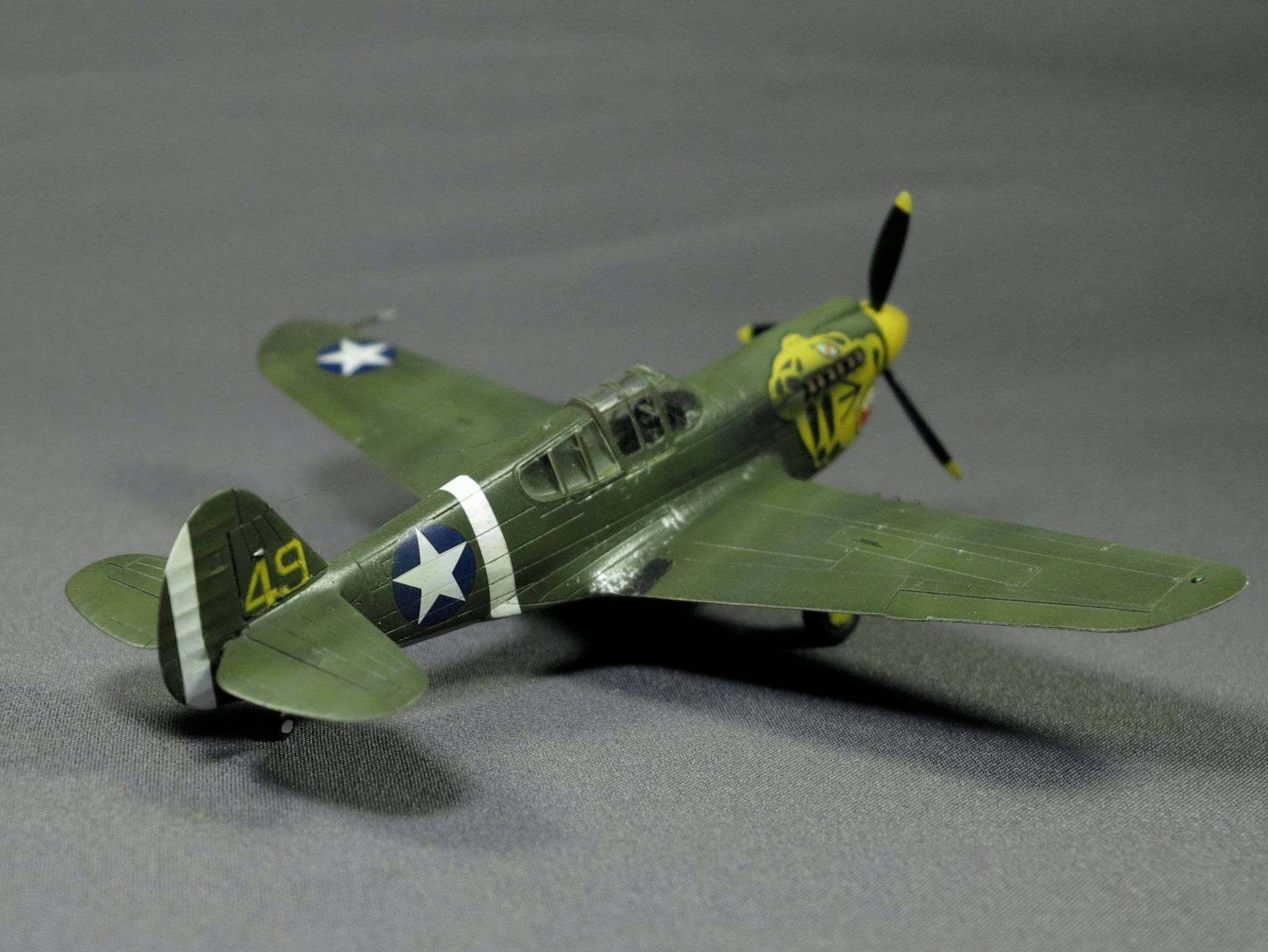 У меня опять американская авиация.Собирал три Р-40 академских вместе. Все три понравились. Главная трудность - жесткие декали. Вроде заборол. Использовал маленькие платы фототравления от Eduard, оно в основном в кабину. Короче, опять изкоробка. Акрил Gunze/лак Pacific88. Как я больше всего люблю, модель как бы "чуть-чуть эксплуатировалась": уже видно, что не с завода, но ещё не в усмерть ободранные.