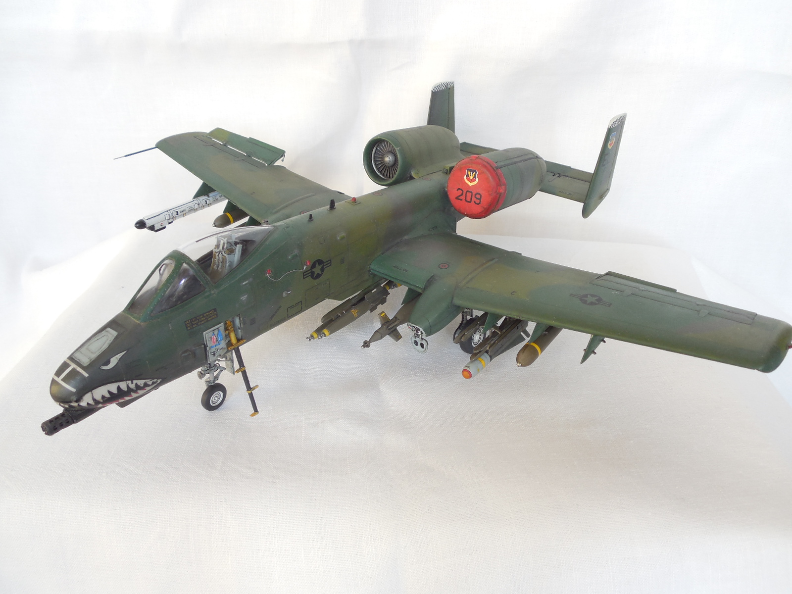 С Новым годом, мужики!!! Удачи, здоровья, успехов в творчестве!!! Вот представляю "новогоднюю ёлку", то есть А-10 от Хобби Босс. Машина представлена по мотивам- A-10 23rd TFW England AFB 1990. Машина красивая, набор вроде тоже по своему крут, но в процессе сборки столкнулся и честно говоря уже не первый раз у Хоббика, с "неровным" прилеганием половинок фюзеляжа. Что доставило массу неудобств и заняло много времени пока я их всё-таки свёл. В модели также использовал смоляные гондолы шасси от Айрес, что тоже ещё то удовольствие!!! Не знаю, но у меня они очень муторно шли, но таки дошли!!!. Иммитировал выпущенную механизацию крыла, отклонил рули высоты с триммерами, справа выпустил воздушный тормоз, слева зачехлил двигатель, подсмотрел где то представленную схему подвески "Буря в Пустыне отдыхает" и попытался изобразить фронтовой камуфляж для пущей смотрибельности, хотя серые "бородавки" очень даже респектно смотрятся!!! Челюсти надуты через трафареты, что тоже заняло у меня приличную уйму времени. Ствол "Вулкана" . ПВД, некоторые антенны- самодел. Доширак, степлерные скребки, проволока, иглы, втулки в полной мере нашли применение!!! Вооружение частично родное, что то из доп. комплектов Хаси. Краски М.Колор, смывки М.Колор и Тамия, пудреницы Тамия. Желаю приятного просмотра, я надеюсь, С уважением RSHA!