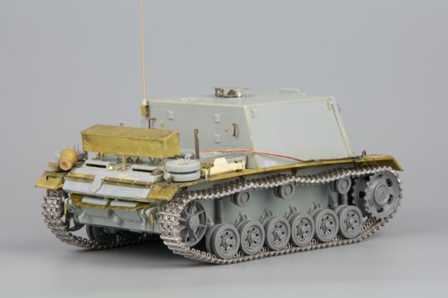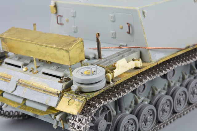 К модели были приобретены дополнения: наборы травления Voyager Model PE35476 и PE35364, стволы орудия и пулемета RB Model, металлические траки MasterClub, антенна Panzer Art, ходовая часть из набора от Комплект ЗИП, ведро от Микродизайн. Заменены все болты и заклёпки на смолу MasterClub. Шанцевый инструмент и фара Бош позаимствованы из запасов, оставшихся от наборов Драгон. Домкрат - смола из набора Voyager Model для Sd.Kfz.222. Буксировочные приспособления сделаны из латунных прутков, проводка к фаре и антенне - из медной проволоки, бронестекло мехвода - из DVD, линза прибора наблюдения - из прозрачного пластика. Буксировочные тросы взяты из набора Voyager Model. Заново сделаны сварные швы из двухкомпонентной шпатлёвки от Тамии.