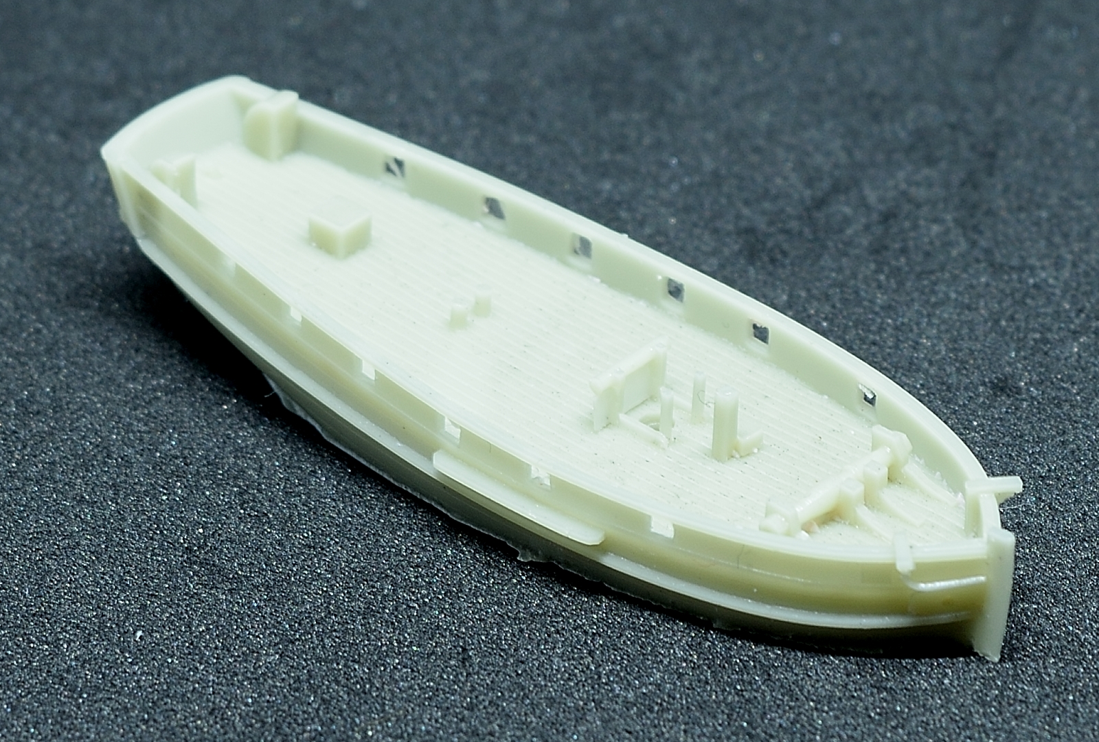 Смола очень качественно и детально пролита, минимальная зачистка нужна лишь вдоль ватерлинии, в пушечных портах, около кофель-нагельных планок. Рангоут есть из смолы, но как минимум мачту надо заменять на точенку - поведет. Якоря очень филигранные и соответствуют по типу. Даны пушки, что странно - Найтингейлы несли 2 пушки 6фн калибра и 4 6фн карронады, Нимблы несли 10 12фн карронад, и лишь только Dove имел 6 орудий неизвестного калибра.