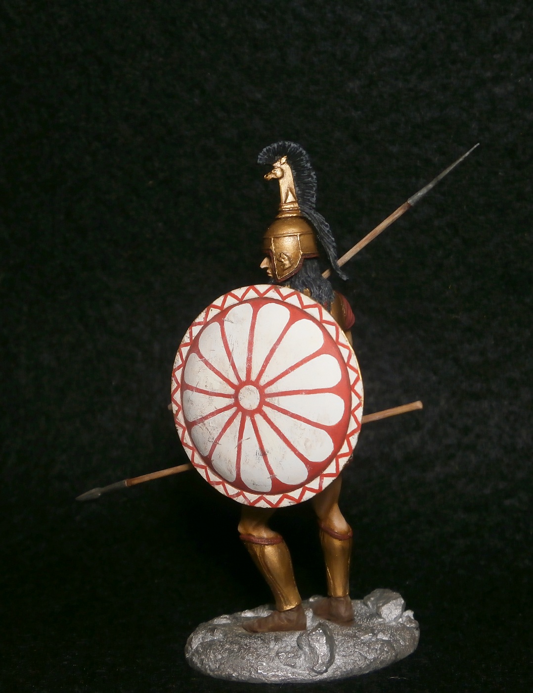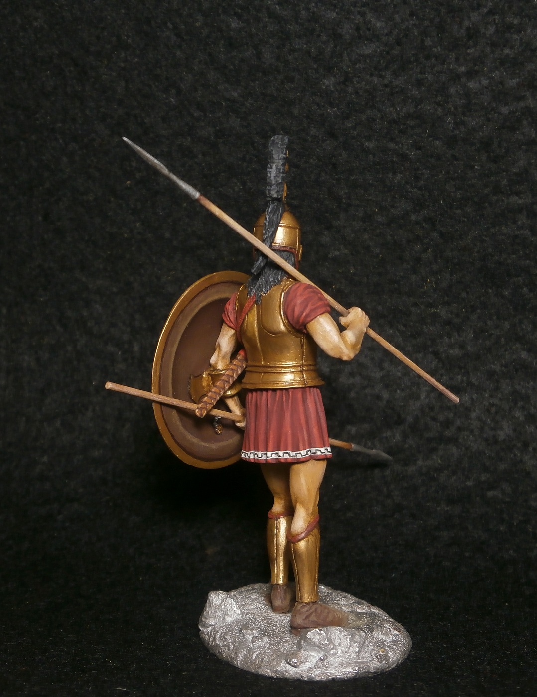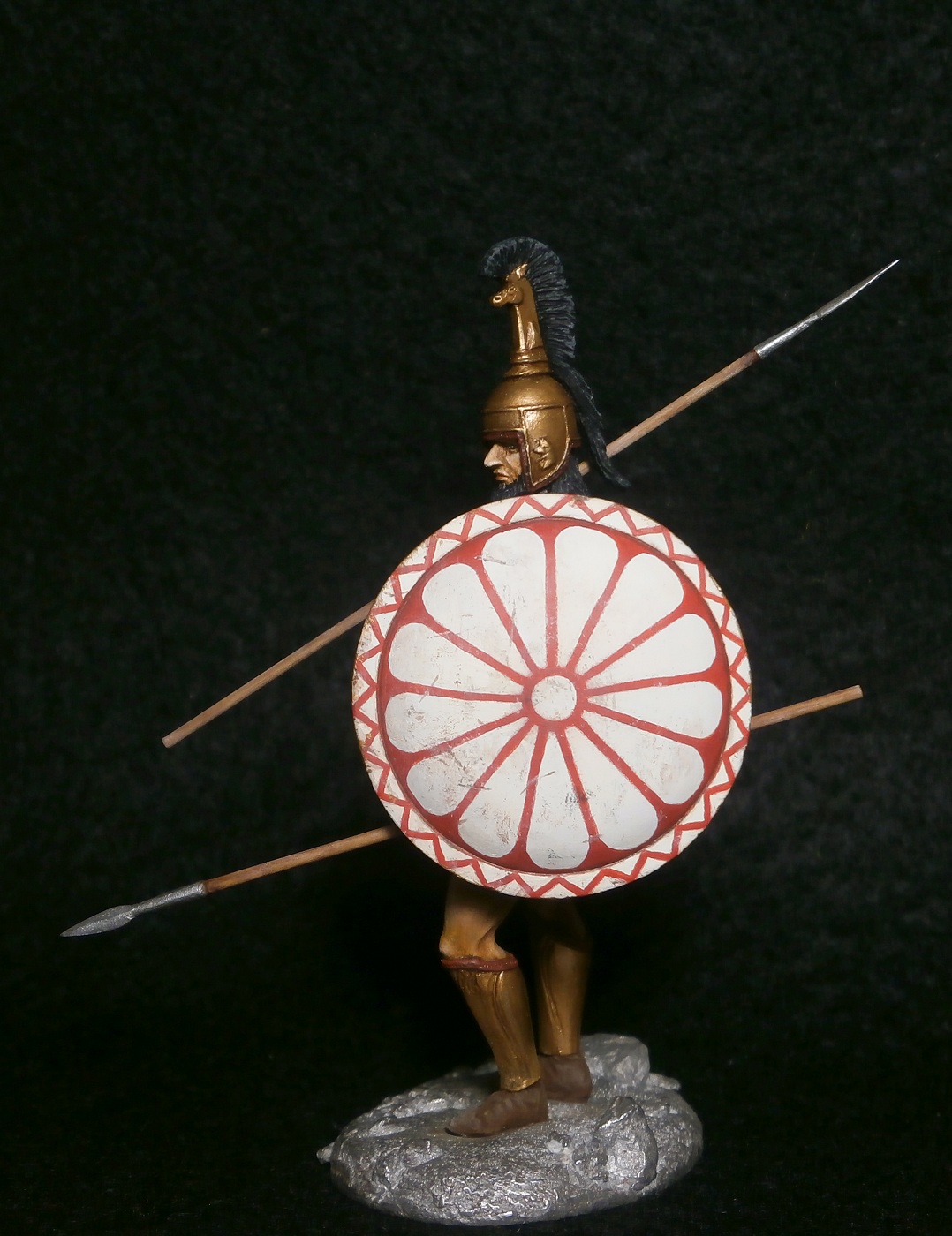 Гоплит относится к периоду Мессенских войн, времени когда Спарта только утверждалась как ведущее государство в регионе. Рисунок щита основан на фигурках из раскопок храма в Спарте. Точно не известно, носили ли спартанцы свои знаменитые кроваво-красные одежды в столь древнее время, но я всё же решил остановится именно на этом цвете. Старая фигура от Tartar, сейчас уже снята с производства, белый металл, масштаб 54мм. Акрил валехо и миг, масло abteilung 502, ганзовские металлики. Впервые попробовал расписать кожу маслом по акрилу.