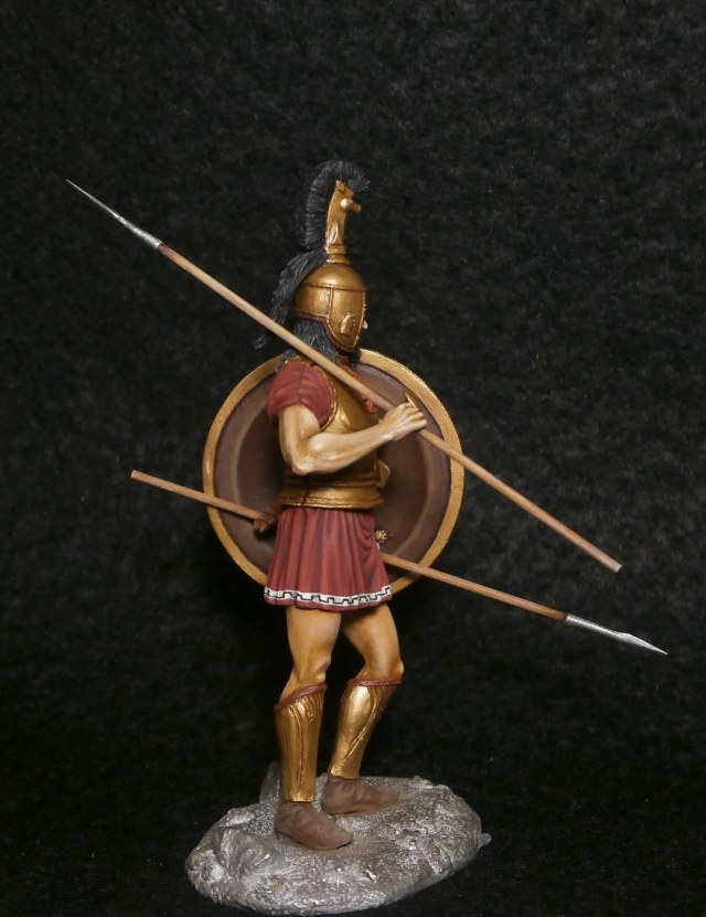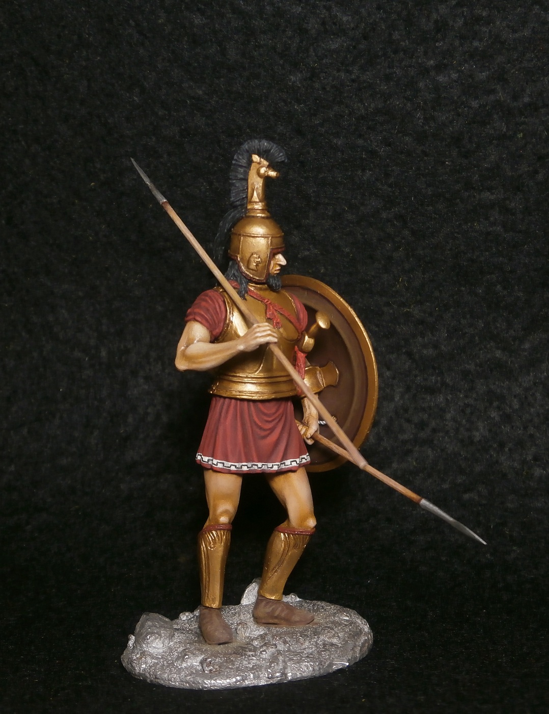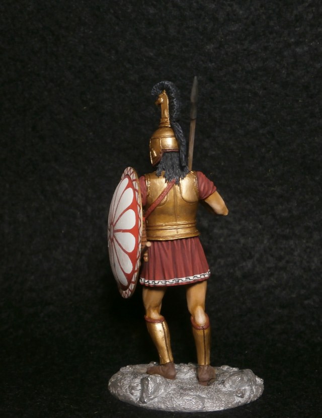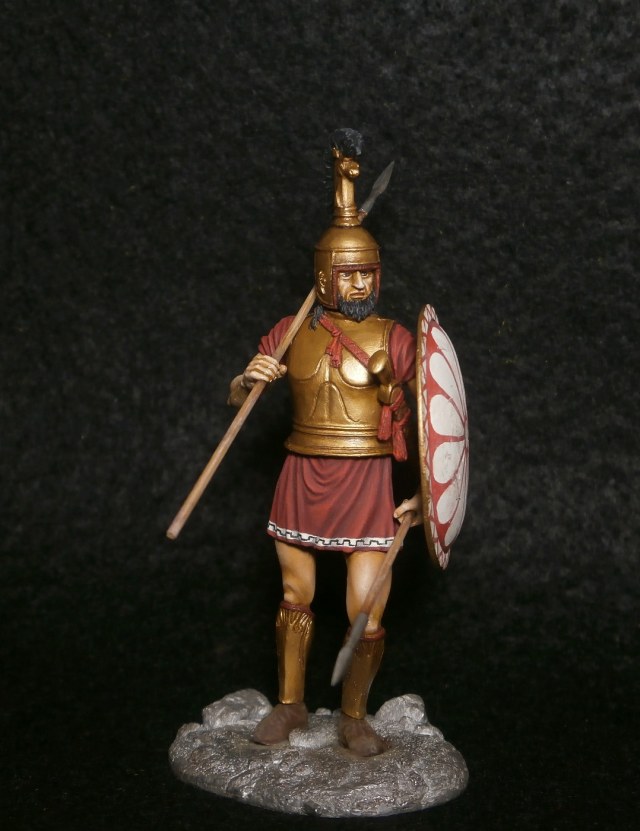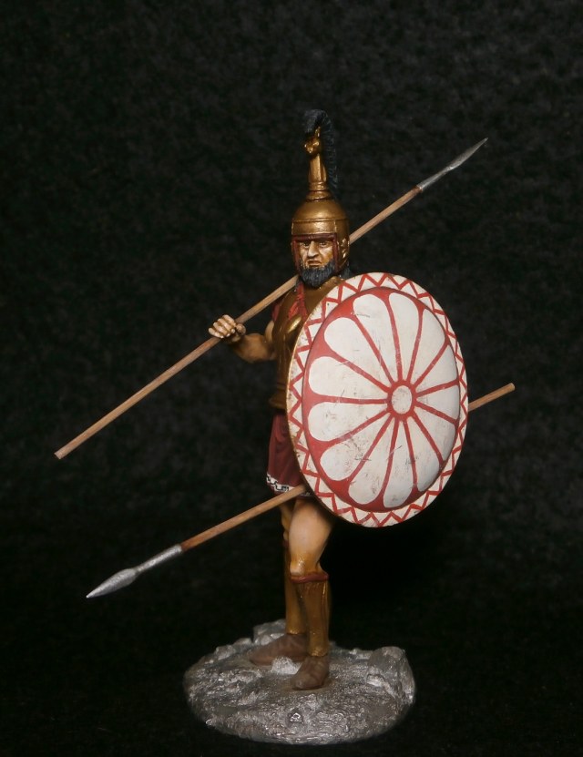 Гоплит относится к периоду Мессенских войн, времени когда Спарта только утверждалась как ведущее государство в регионе. Рисунок щита основан на фигурках из раскопок храма в Спарте. Точно не известно, носили ли спартанцы свои знаменитые кроваво-красные одежды в столь древнее время, но я всё же решил остановится именно на этом цвете. Старая фигура от Tartar, сейчас уже снята с производства, белый металл, масштаб 54мм. Акрил валехо и миг, масло abteilung 502, ганзовские металлики. Впервые попробовал расписать кожу маслом по акрилу.