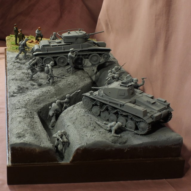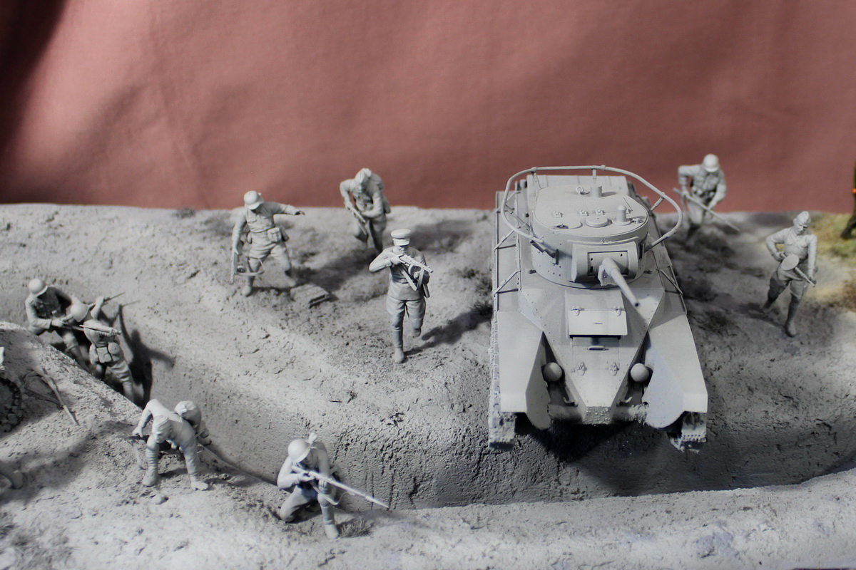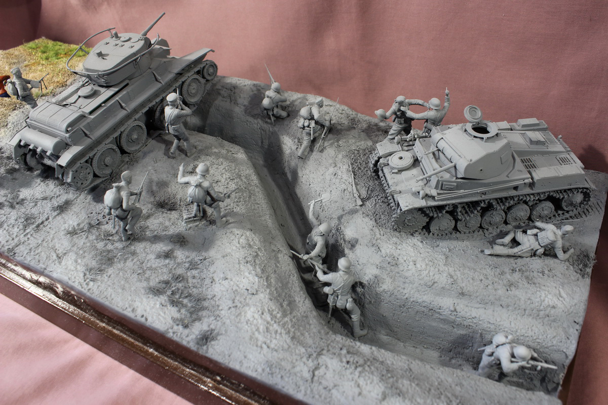 Работа понравилась. И пропорции в ней тоже. Что такое бой с участием бронетехники по сравнению с раскопками? Их масштабы сильно отличаются друг от друга, поэтому малая часть на диораме занятая раскопками вполне пропорциональна боевой части.