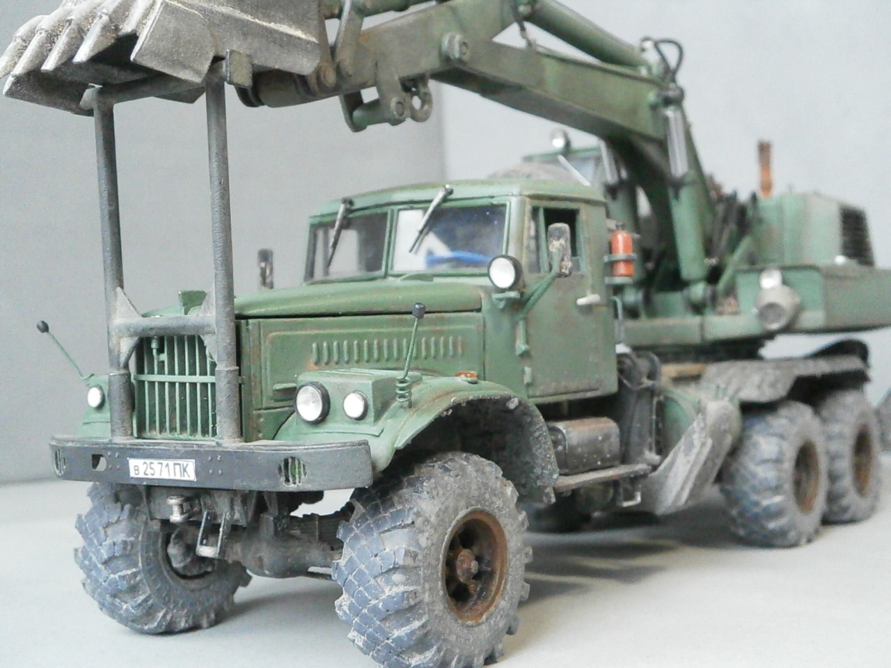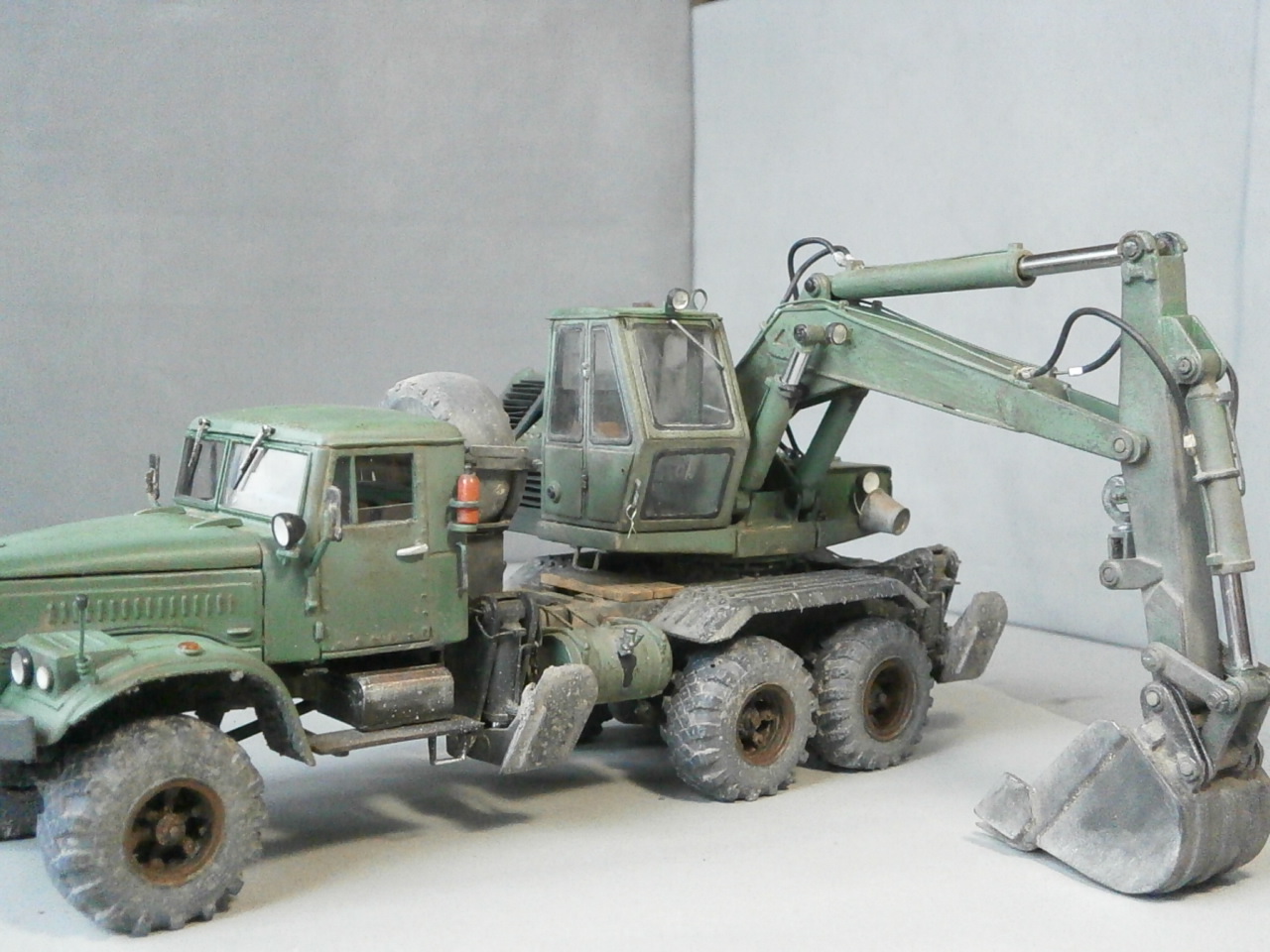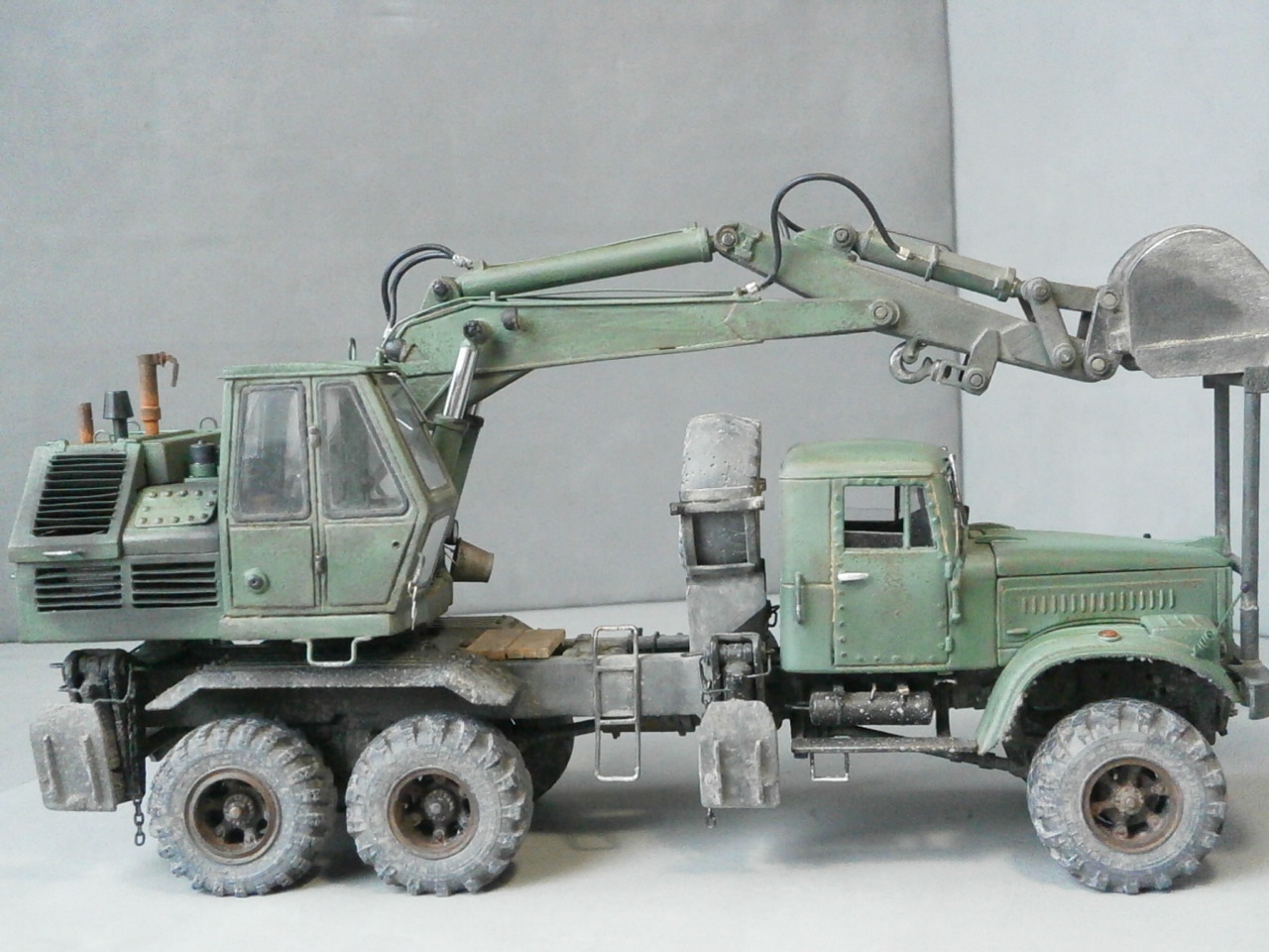 Рад всех приветствовать! Представляю вашему вниманию перекрашенную модель военного экскаватора на шасси КрАЗ-255Б,построенную ещё в 2015 г. Для более колхозного образа поменял колёса. Раму не трогал вообще,лишь неудачно загрязнил её. "Зелёное" всё было перекрашено,добавлены номера и вообщем то всё. В жизни цвет маленько другой и ржа не такая ядовитая,но фотоаппарат исказил цветопередачу. Вся гидравлика и платформа остались подвижные. В новом цвете мне "колупатор" понравился,жду ваших мнений. Приятного просмотра!