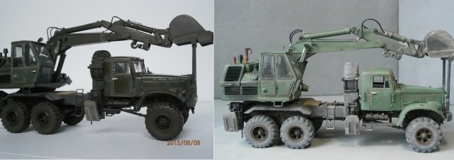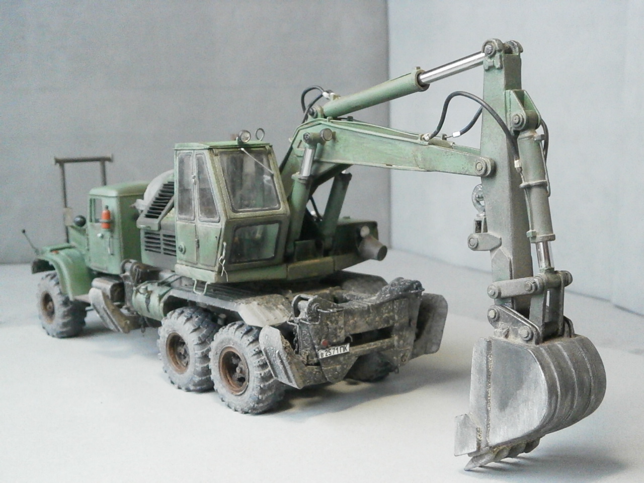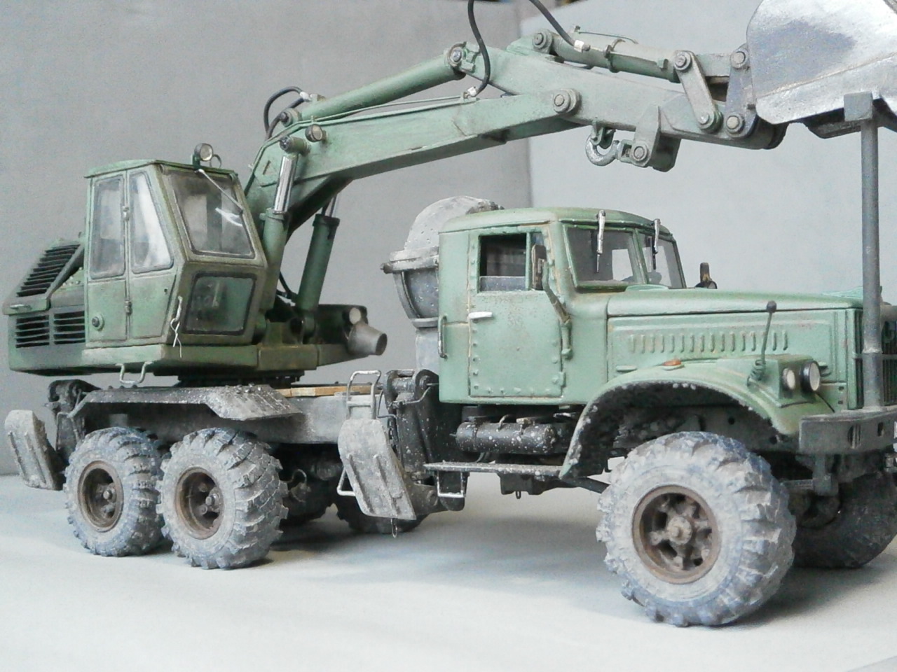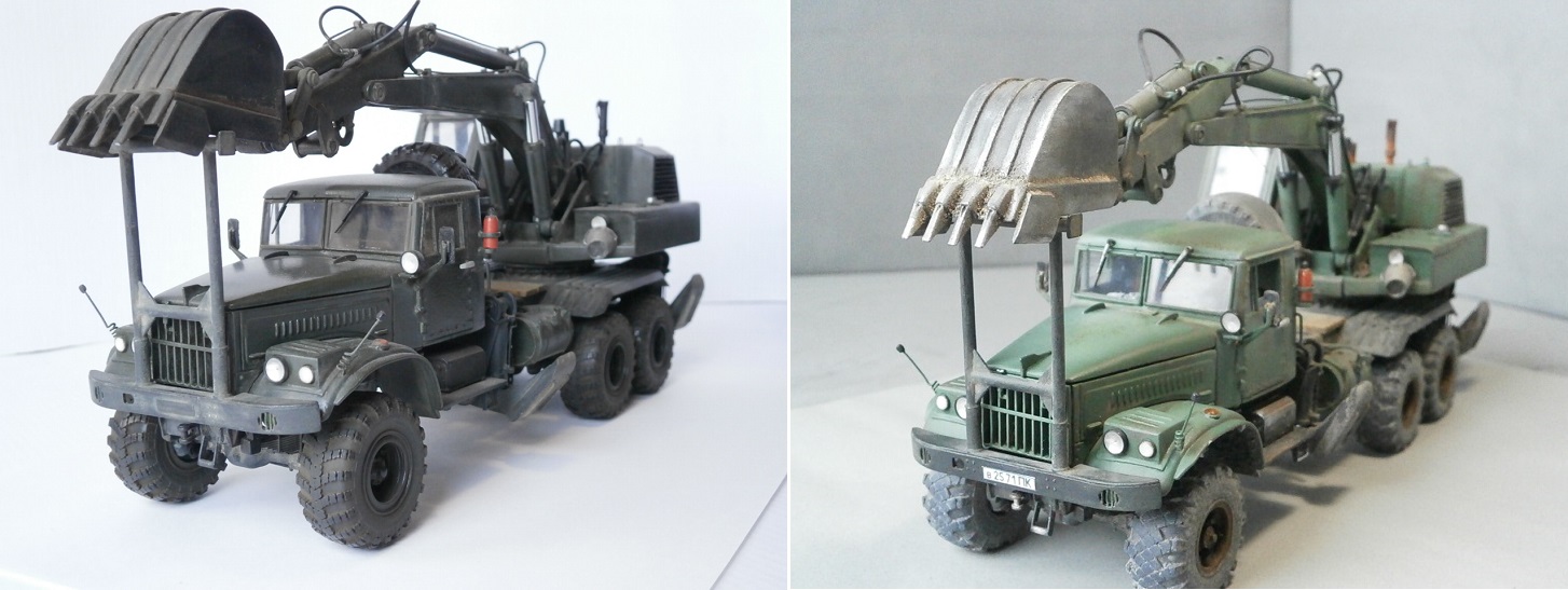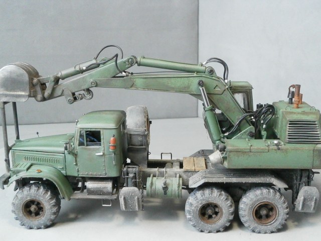 Рад всех приветствовать! Представляю вашему вниманию перекрашенную модель военного экскаватора на шасси КрАЗ-255Б,построенную ещё в 2015 г. Для более колхозного образа поменял колёса. Раму не трогал вообще,лишь неудачно загрязнил её. "Зелёное" всё было перекрашено,добавлены номера и вообщем то всё. В жизни цвет маленько другой и ржа не такая ядовитая,но фотоаппарат исказил цветопередачу. Вся гидравлика и платформа остались подвижные. В новом цвете мне "колупатор" понравился,жду ваших мнений. Приятного просмотра!