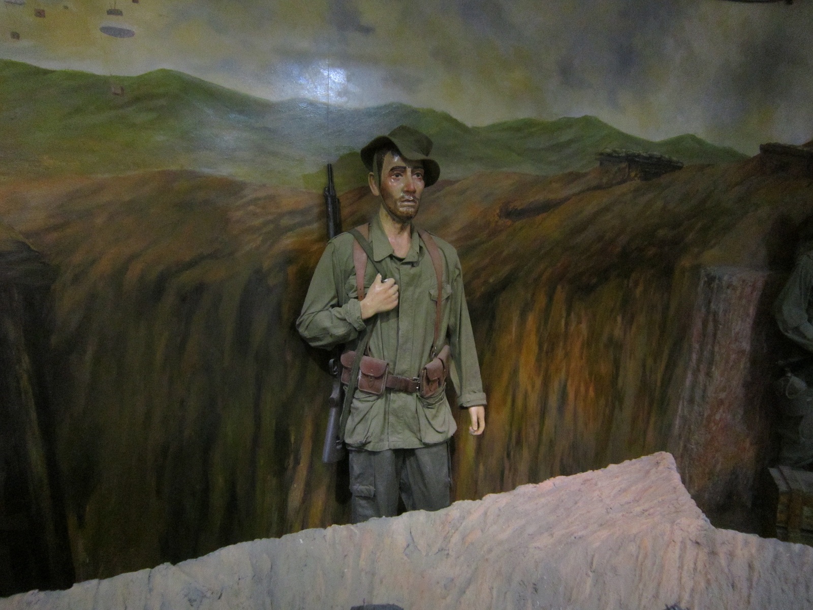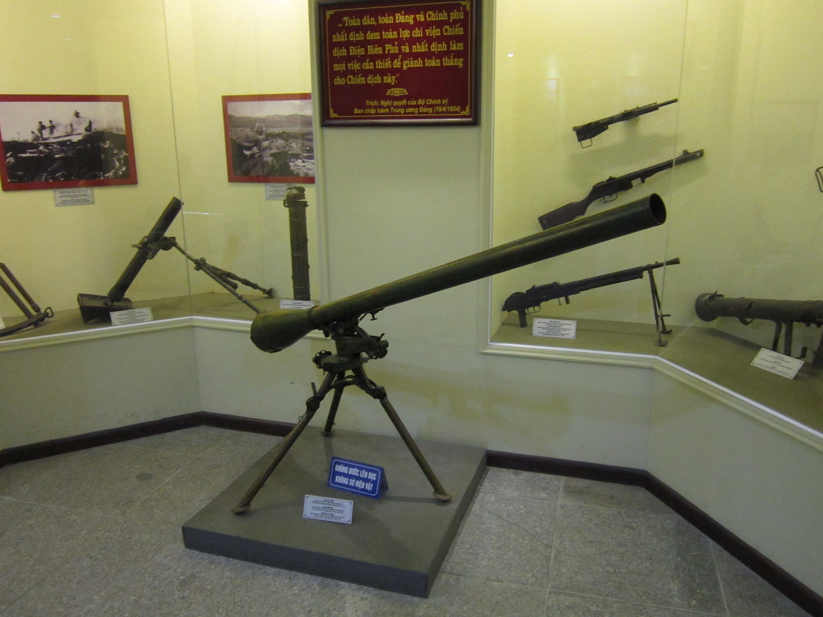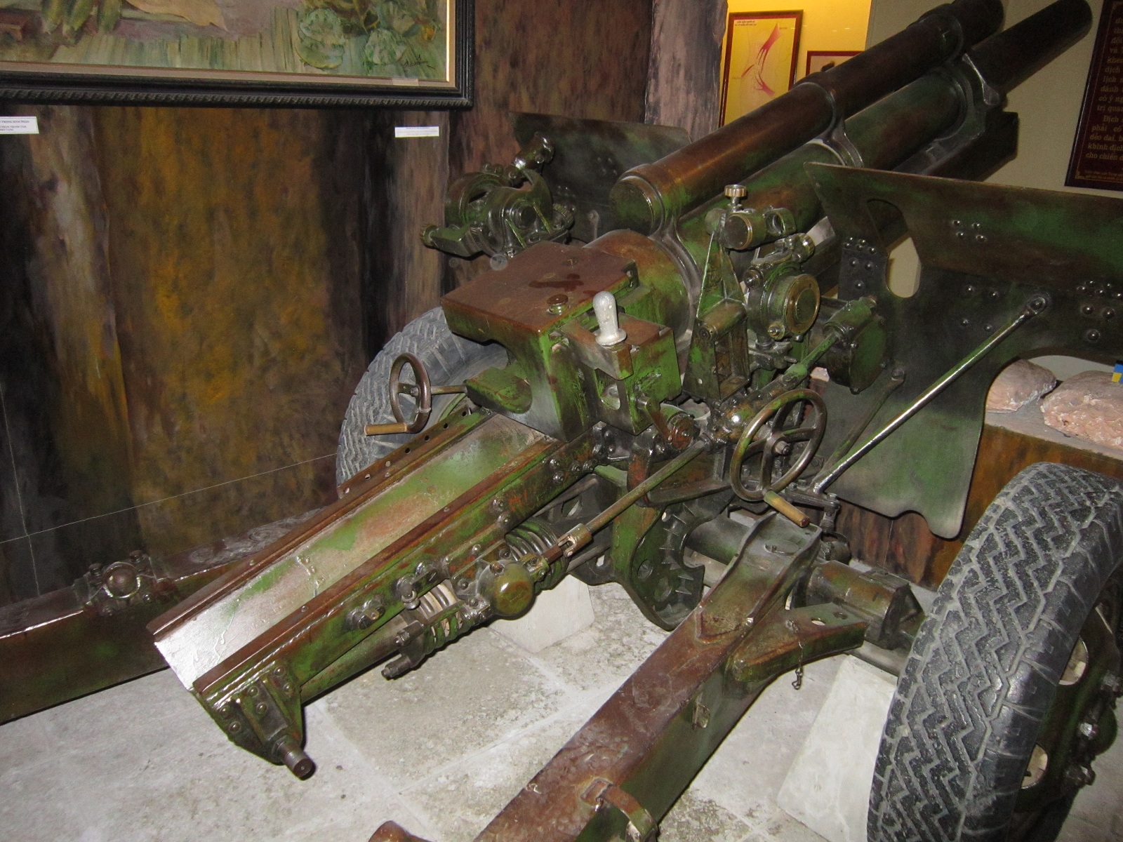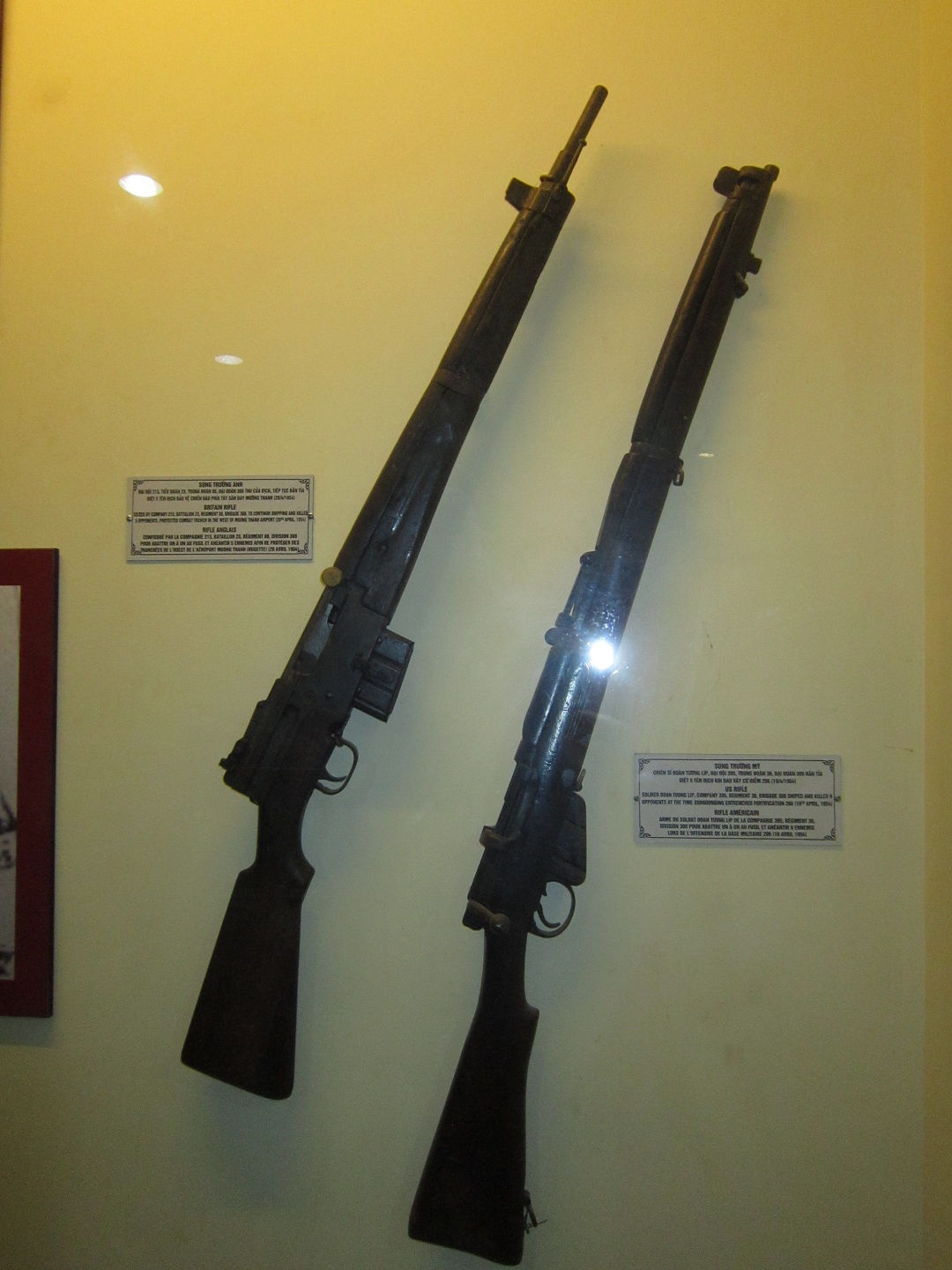 В промежутках между макетами расположены витрины с фотографиями и документами относящимися к битве, и многочисленным "железом" как французским, так и вьетнамским. Многие фото раньше мне нигде не попадались. Подписи к экспонатам сделаны на трёх языках: вьетнамском, английском и французском. Подписи к стрелковому оружию огорчают - в большинстве случаев названий оружия нет, пишут просто "винтовка" или "пулемёт" и чем это оружие отличилось, т.е. какой боец где и сколько врагов "завалил" из него. Конечно, практически все "стволы" я знаю, но всё же попалась винтовка, которую я не смог опознать с ходу, и лишь дома, порывшись в справочниках понял, что это 8-мм "Лебель-Бертье" образца 1902 года. Обнаружил и пару ошибок: МАС-49 подписана как "Британская винтовка", а висящий рядом "Ли-Энфилд" обозвали американцем. Так же явно перепутаны местами таблички у пулемётов РП-46 и М1924/29. Стоящие в залах американская 105-мм гаубица и советская 37-мм зенитка скорее всего не участвовали в сражении. Дело в том, что хотя гарнизон Дьен Бьен Фу и капитулировал, война на этом не закончилась, и 351-я тяжёлая дивизия вместе со всеми своими орудиями отправилась к местам новых боёв.
