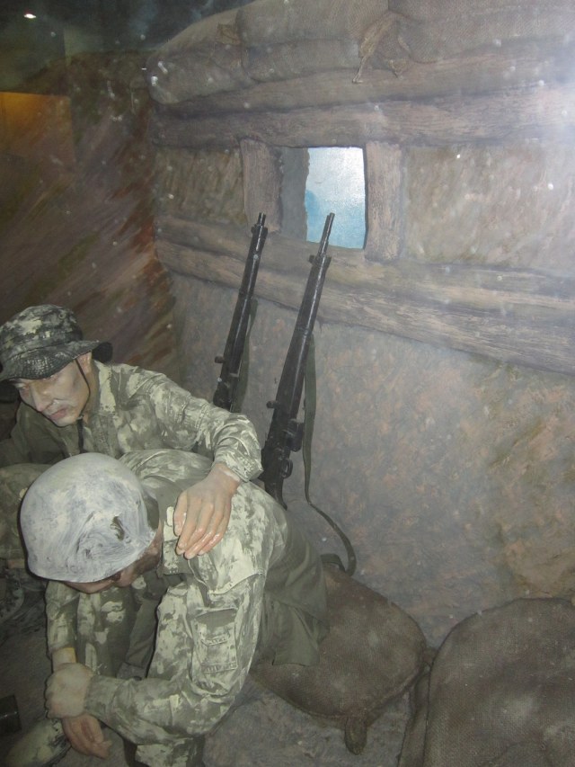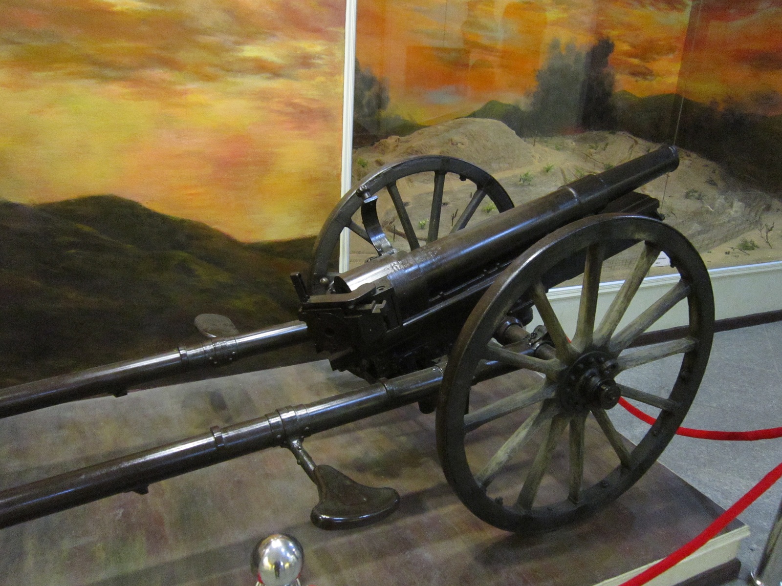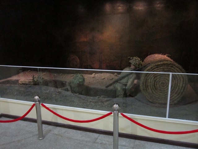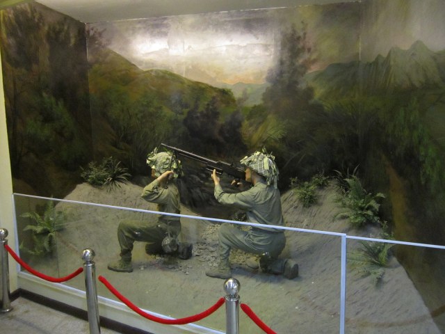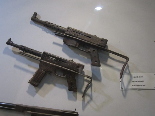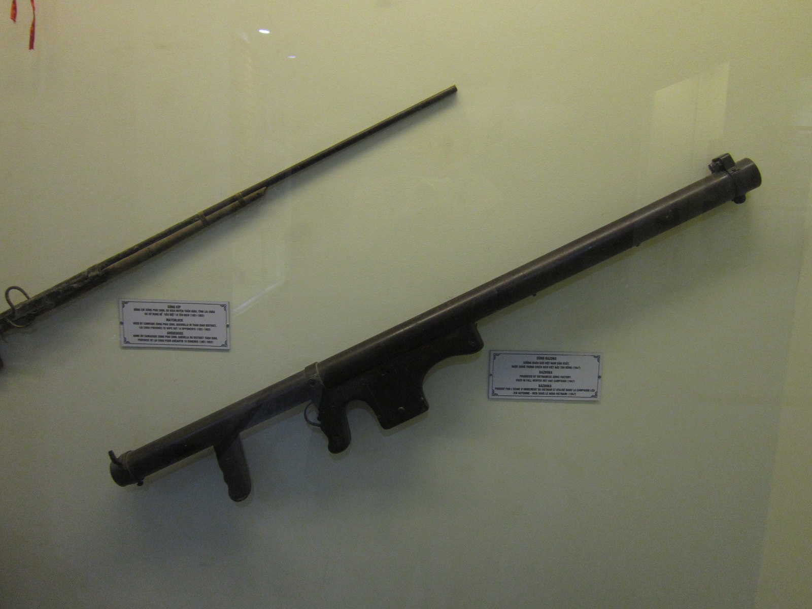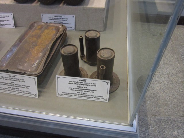 В промежутках между макетами расположены витрины с фотографиями и документами относящимися к битве, и многочисленным "железом" как французским, так и вьетнамским. Многие фото раньше мне нигде не попадались. Подписи к экспонатам сделаны на трёх языках: вьетнамском, английском и французском. Подписи к стрелковому оружию огорчают - в большинстве случаев названий оружия нет, пишут просто "винтовка" или "пулемёт" и чем это оружие отличилось, т.е. какой боец где и сколько врагов "завалил" из него. Конечно, практически все "стволы" я знаю, но всё же попалась винтовка, которую я не смог опознать с ходу, и лишь дома, порывшись в справочниках понял, что это 8-мм "Лебель-Бертье" образца 1902 года. Обнаружил и пару ошибок: МАС-49 подписана как "Британская винтовка", а висящий рядом "Ли-Энфилд" обозвали американцем. Так же явно перепутаны местами таблички у пулемётов РП-46 и М1924/29. Стоящие в залах американская 105-мм гаубица и советская 37-мм зенитка скорее всего не участвовали в сражении. Дело в том, что хотя гарнизон Дьен Бьен Фу и капитулировал, война на этом не закончилась, и 351-я тяжёлая дивизия вместе со всеми своими орудиями отправилась к местам новых боёв.