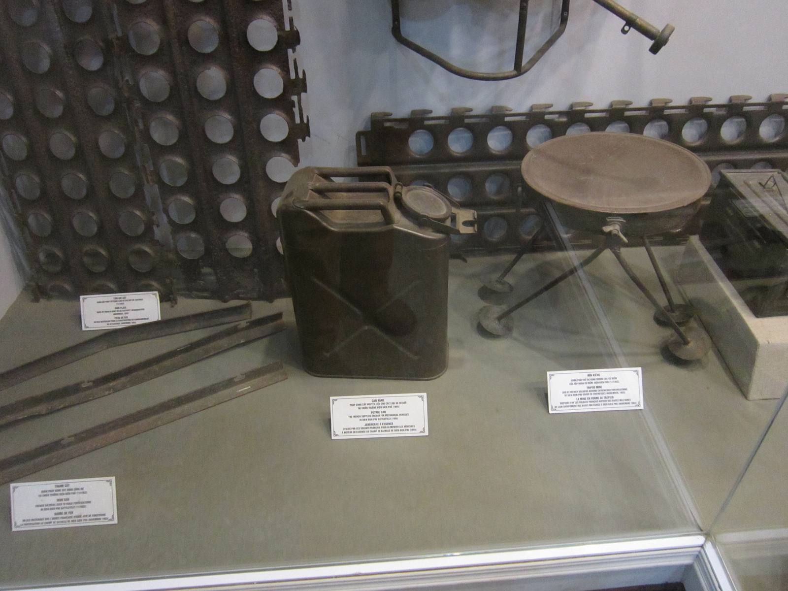 Большой раздел экспозиции посвящён организации системы тыла, что не удивительно. Победа в сражении была достигнута прежде всего потому, что вьетнамцы сделали то, что французы считали невозможным - в лишённой дорог горно-лесистой местности сосредоточили и снабжали всем необходимым группировку из четырёх дивизий с артиллерией и ПВО. В результате французы, твёрдо убеждённые, что их противник не сможет доставить под Дьен Бьен Фу артиллерийские орудия и уж тем более обеспечить их достаточным количеством боеприпасов, с началом штурма были шокированы настолько, что начальник артиллерии французского гарнизона через два дня боёв покончил с собой. Разумеется, всё это потребовало огромных усилий, и представленные экспонаты позволяют осознать каких. Обратил внимание на рессору от грузовика с бамбуковыми накладками вместо лопнувших пластин.