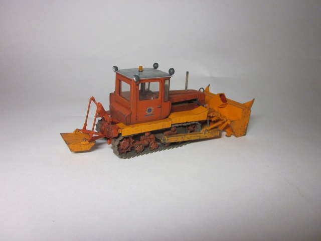 Здравствуйте товарищи моделисты. Представляю модель шнекоротора на базе трактора ДТ 75. Трактор от Хашет коллекции перекрашен, дополнен траками наборными. Навеска-смоляной транскит от три а студио. Красил Тамией, потёки масляными красками. Впихнул двигатель ханомага от Звезды)