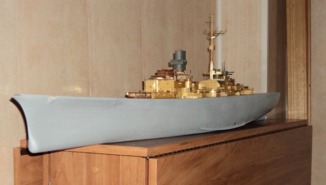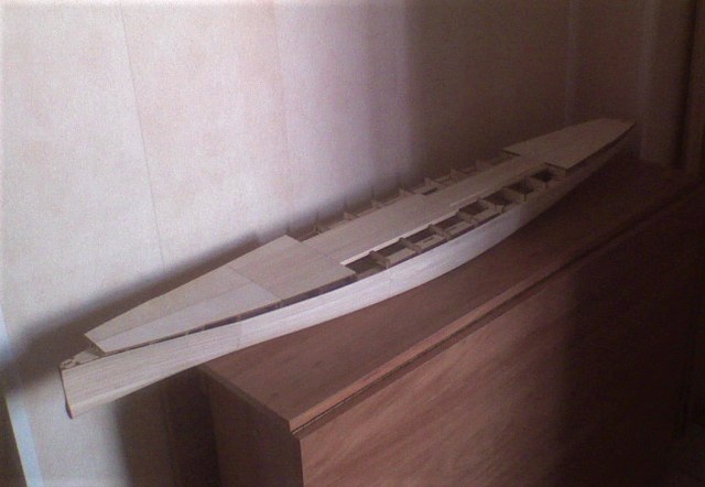 Обшивка представляла собой рейки, выходившие в два этапа. Первый- более толстые рейки толщиной 1.5 мм, покрывающие корпус от верхнего бронепояса до элементов днища, второй – рейки толщиной 1 мм и покрывающие весь корпус от края палубы, этот слой сравнивал поверхность вровень с элементами смолы. Кроме реек были детали вырезанные лазером из 1,5 мм фанеры- 2 детали с иллюминаторами на носу и 2 на корме + 4 детали которые представляли собой скос к верхнему поясу, 2 детали с техническими отверстиями, кингстонами и прочим, и 2 скуловых киля (они из 4 мм, стачивались до треугольного сечения), всё это крепилось на первый слой обшивки.