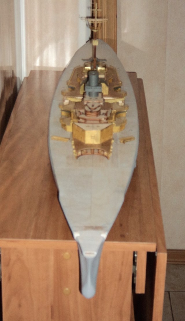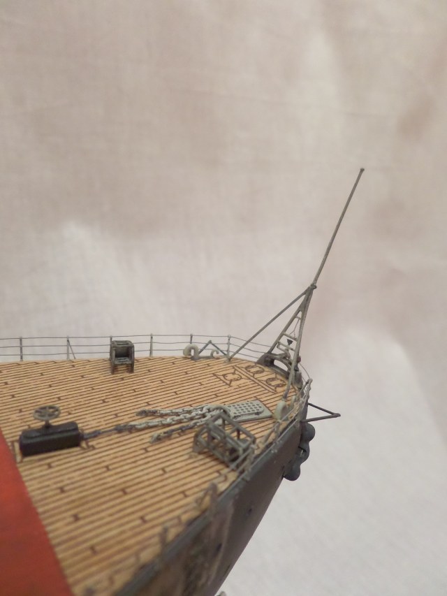· Сделано остекление адмиральского мостика на башенной надстройке, ярусом выше высверлены не достающие иллюмиаторы, под правым ноком площадки «фирлингов» сделан сигнальный тифон.