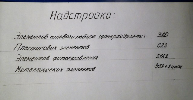 Итак , сам набор корпуса выходил в общем 31 номер, не подряд, чередуясь с номерами с надстройками и прочим. Был один номер с подставкой, её я обпилил по ширине, что бы её было минимум и покрасил в темно-коричневый с подтеками ржавчины, но это было так, на отвали, для пробы. В общем, все элементы набора выходили в виде листов 4-х мм фанеры с вырезанными в них лазером деталями. Схему устройства корпуса и количества деталей привожу ниже.