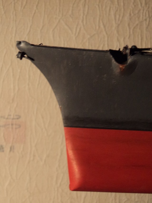 · Носовой элемент из смолы подвергся жесткому «обточингу», потому что имел излишнюю ширину в месте сужения у ВЛ, и непонятный горбыль у якоря на виде с боку. Все это долго и упорно снималось напильником и надфилем.