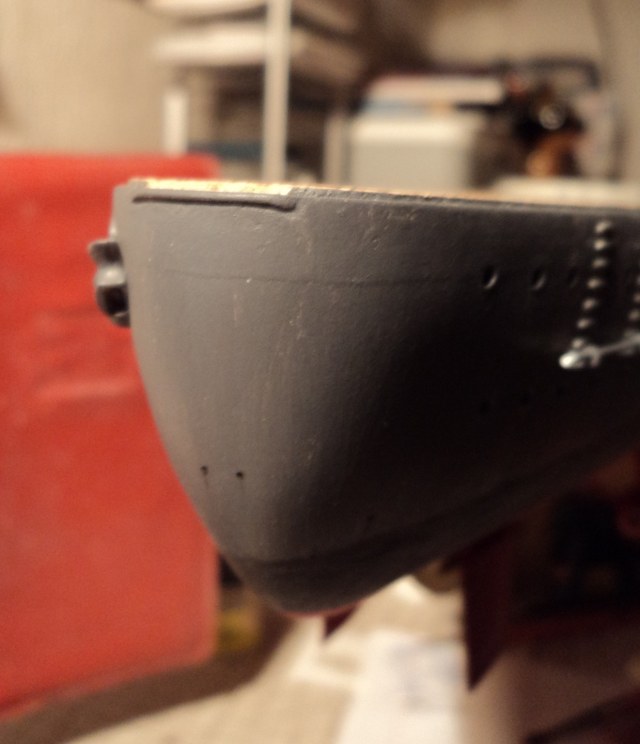 · Добавлена имитация отверстий сонара в носовой подводной части, по сделанному шаблону, и в форштевне высверлено отверстие, точно не знаю зачем оно.