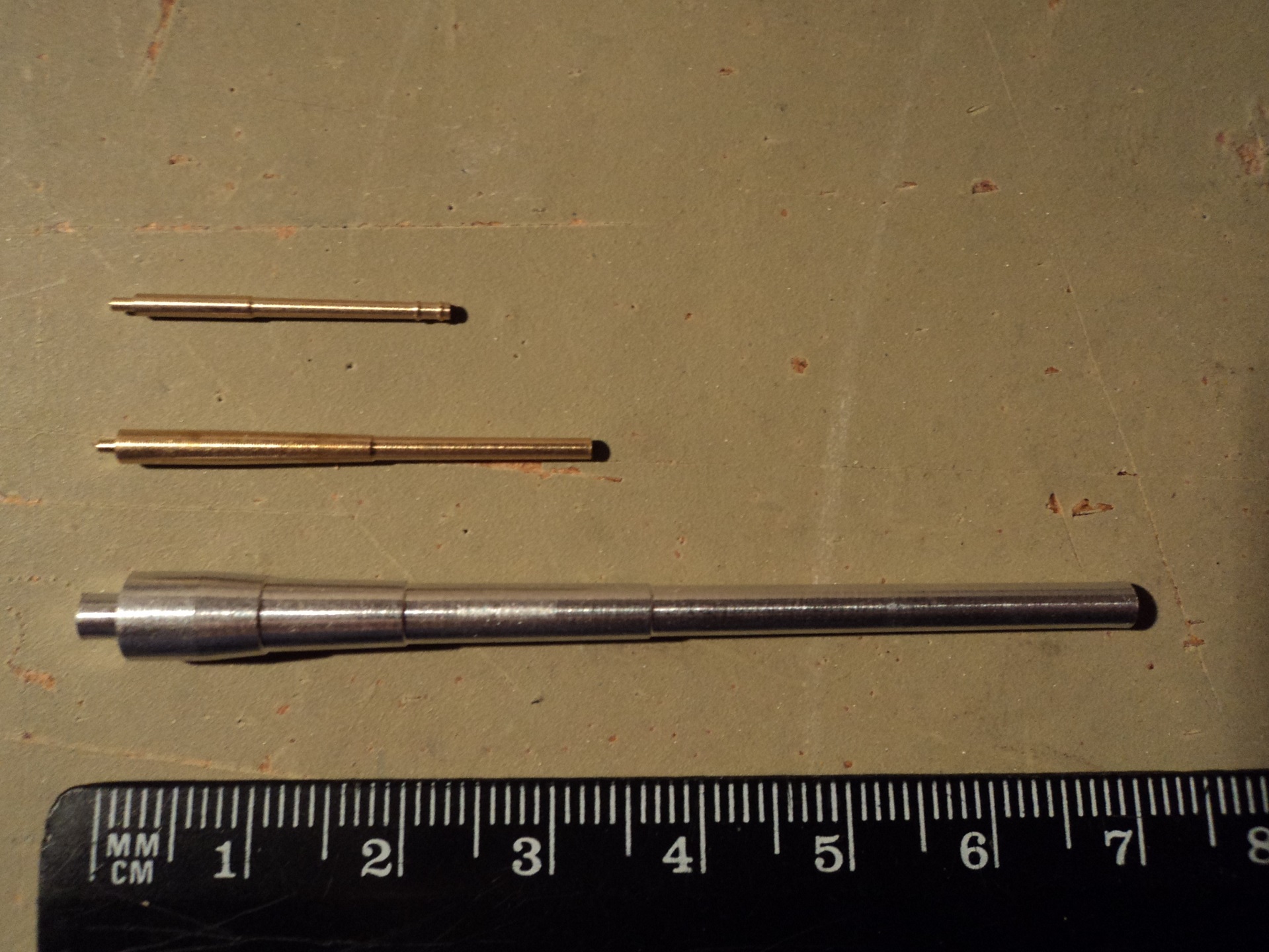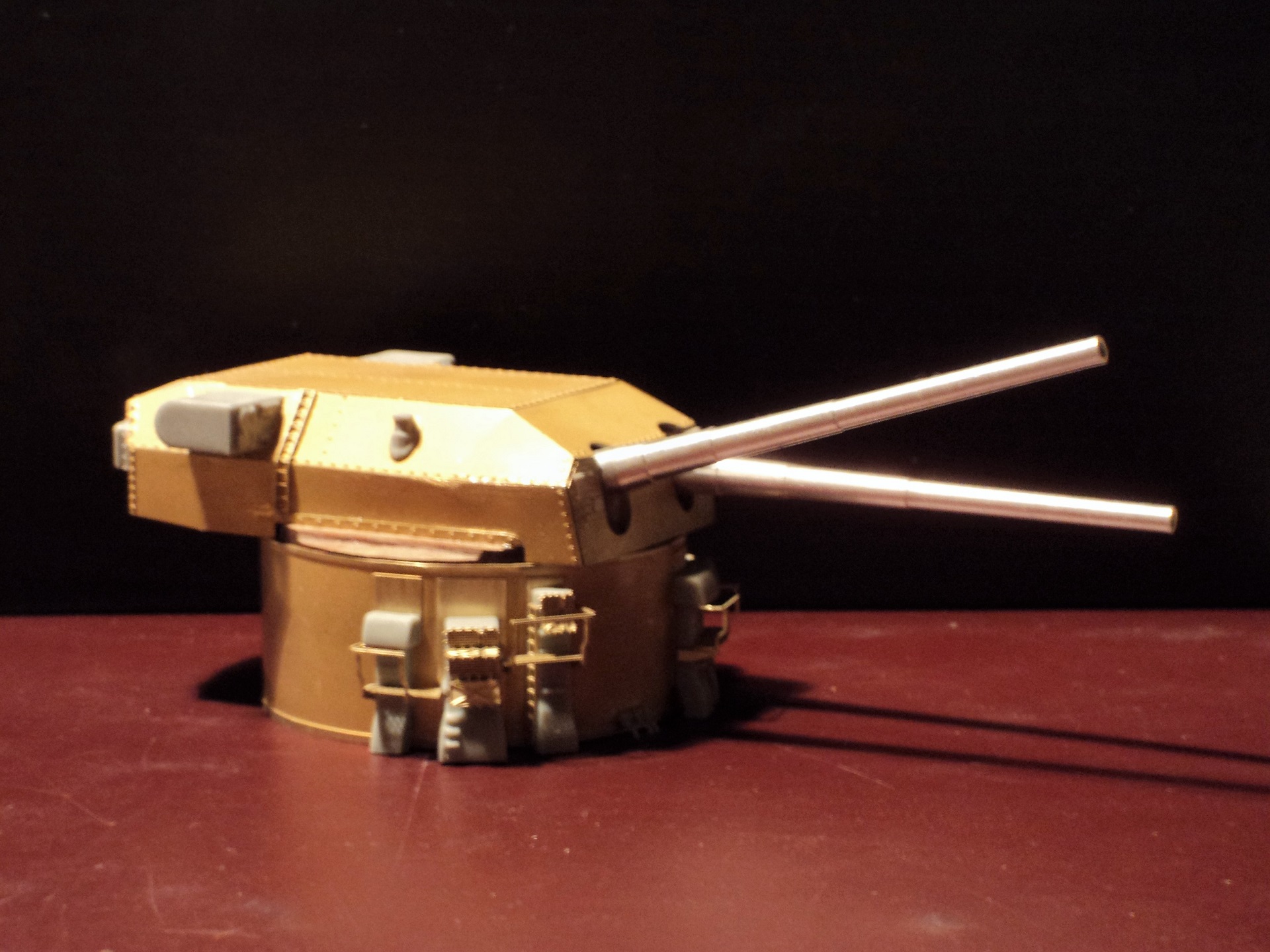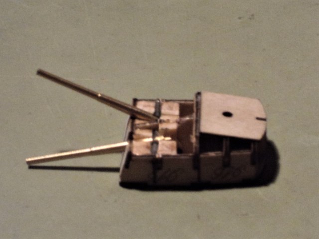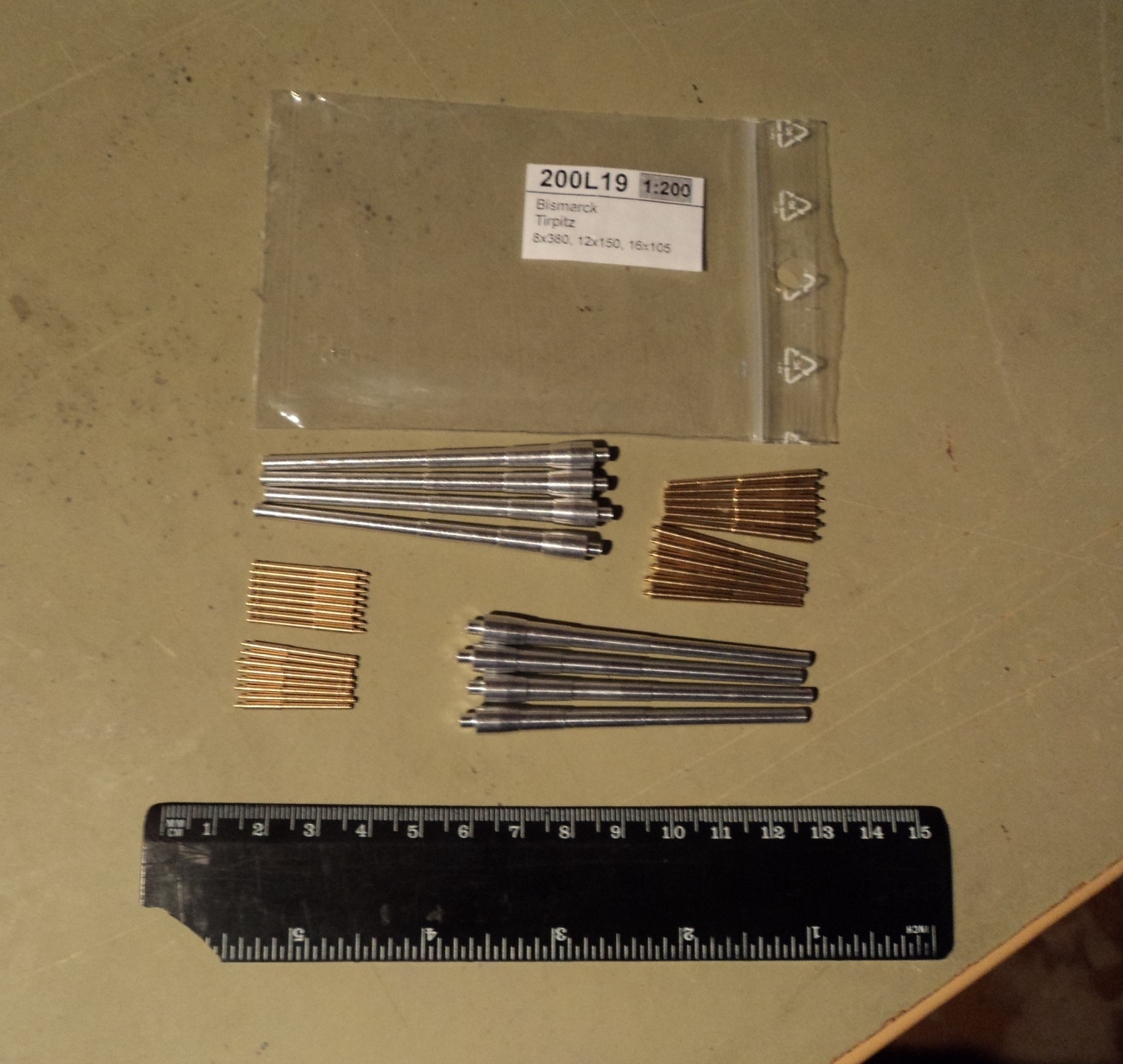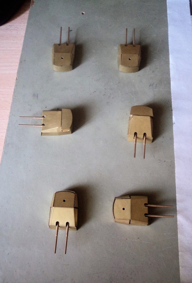 · Воспользовавшись наборной структурой башен, было решено сделать стволы двигающимися, но журнальные орудия для этого не подходили, т.к. простоя вставлялись в амбразуры намертво, да и исполнение мне не понравилось, стенки у дульного среза слишком тонкие. По-этому были закуплены стволы от RB-models (8 стволов ГК, 12 СК И 16 крупные зенитки), но там был нюанс, они видимо предназначались для картонной модели от GPM или типо того, из-за чего орудиям ГК пришлось наращивать казенную часть из медной трубочки с запасов, сверлить по оси цапф, и сажать в башню на пруток, выдерживая межосевое расстояние. С орудиями СК повезло больше, они по длине доходили до цапф и сверлились прямо так. А вот у крупных зениток журнальные стволы оказались более масштабные и правильные, их я оставил.