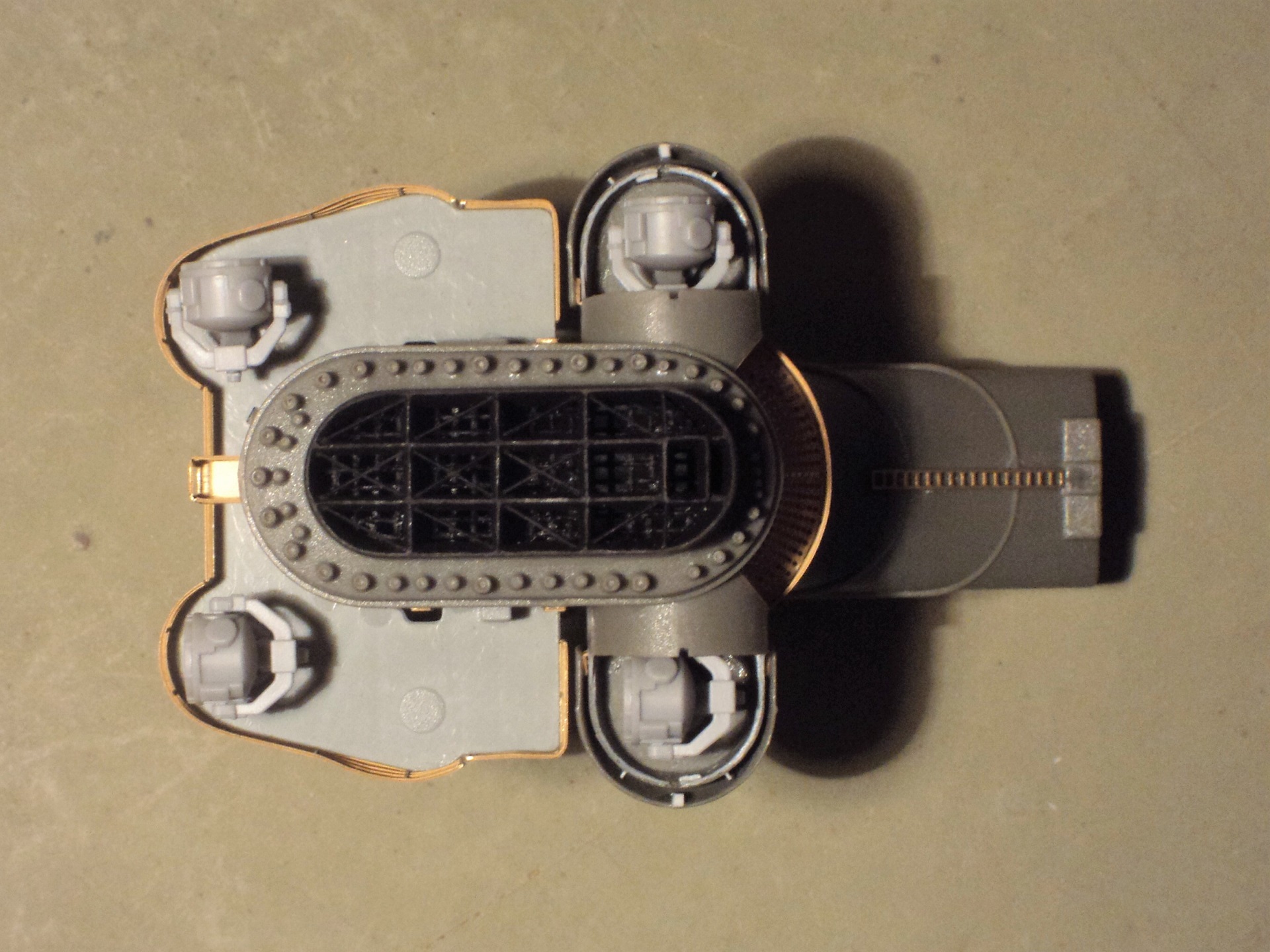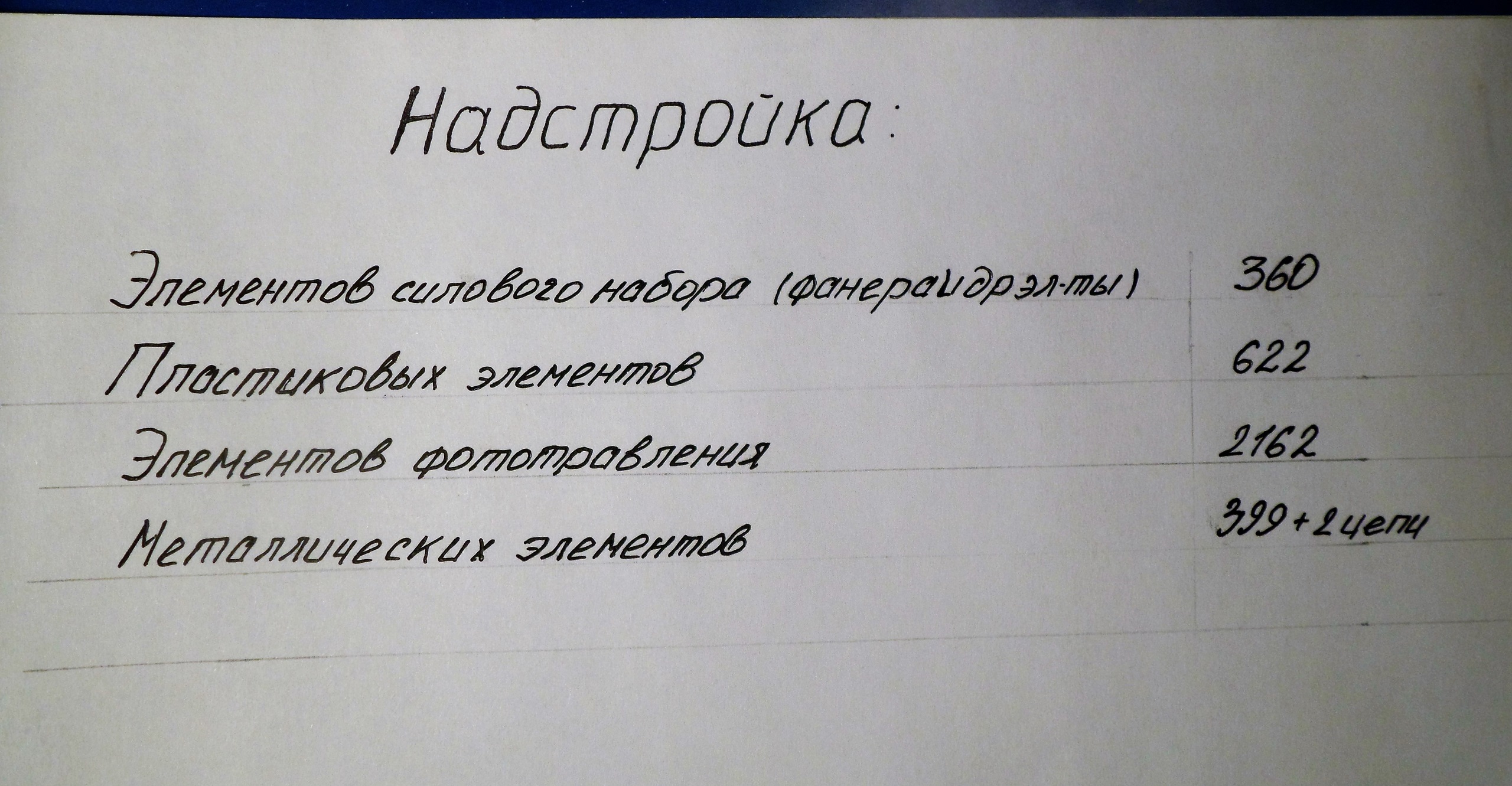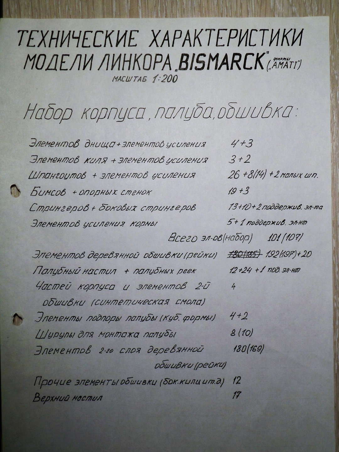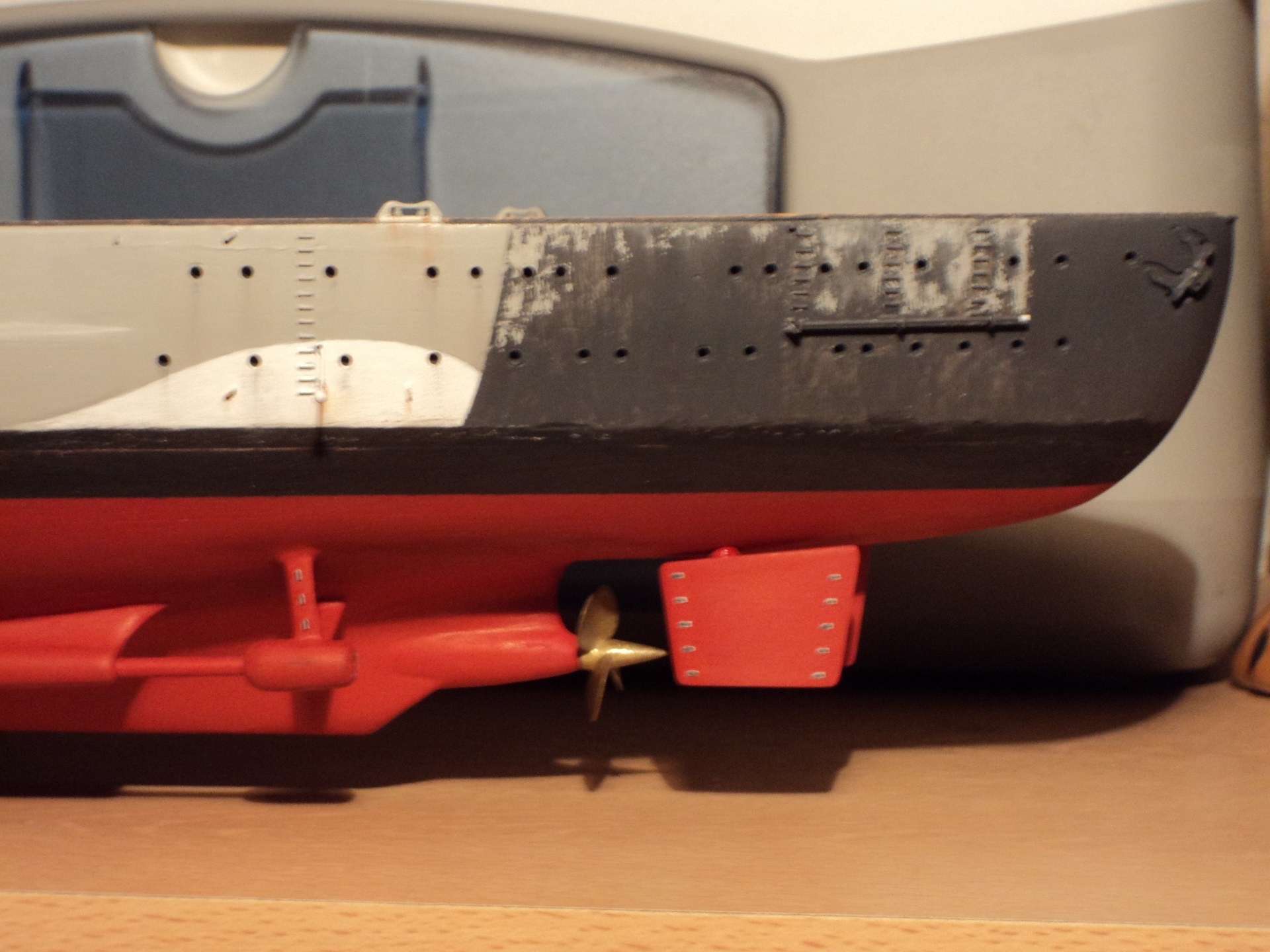 Помимо дерева были 4 элемента из смолы: носовая и кормовая часть, часть с обтекателем среднего винта и часть с якорными клюзами. Всё это крепилось обычным «Моментом».