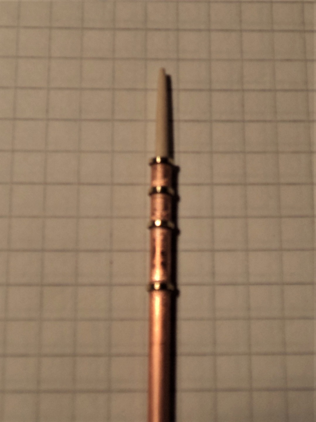 · Гюйсшток шел вытравленным вместе с перемычками на носовую киповую планку, их отрезал, сделал из проволоки 0.5 мм. Сам гюйсшток особо не переделывался только штатный носовой огонь из травления (смотрелся огромным) заменен на более меньший кусочек металла из набора, и добавлен клотик на верхушке с помощью супер-геля, а так же фал из эластичной нити HOBBY+PLUS. Вообще в одной пластине были огни настенные, которые крепились по всему кораблю на стены, некоторые не пригодились и ими я дорабатывал недостающие элементы.