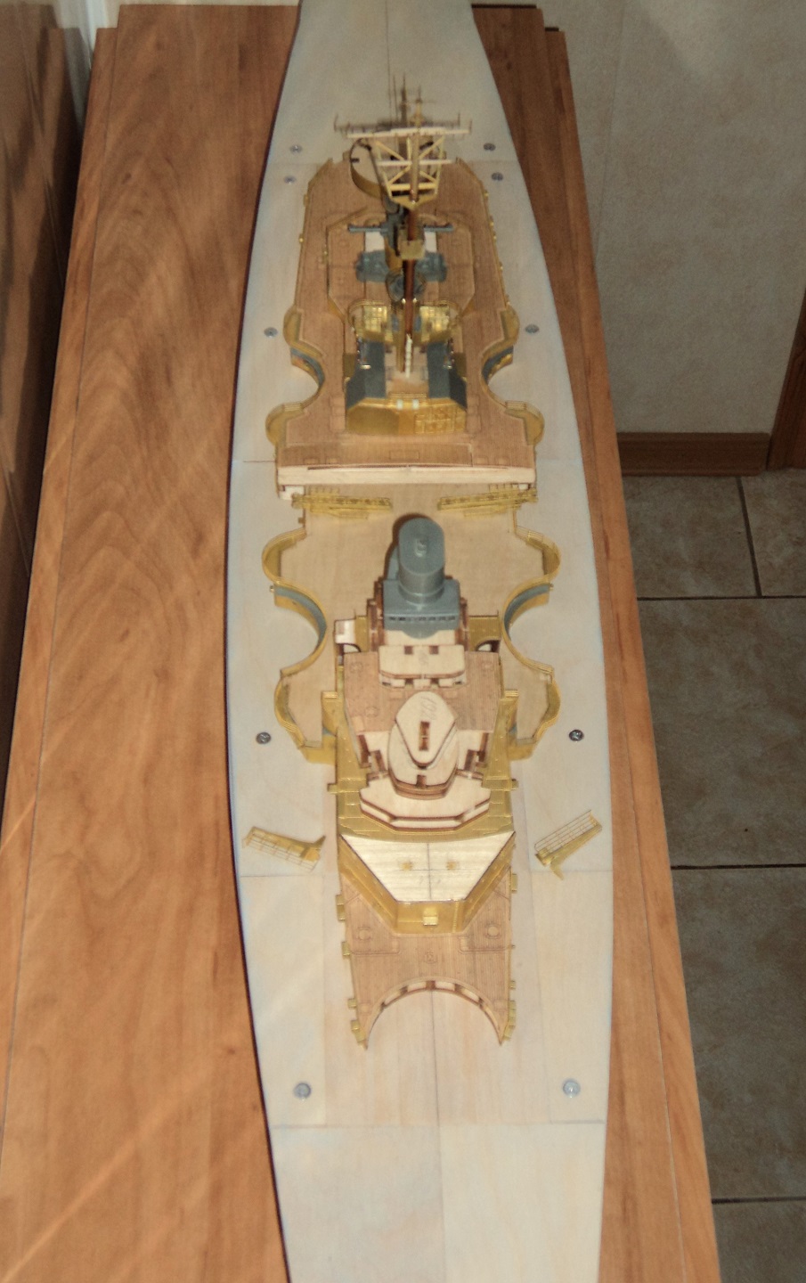 Палуба состояла из фанерных фрагментов и реек толщиной так же 4 мм, и все это клеилось на шпангоуты или бимсы (это для радиомодели, для доступа в отсек). И тут моя вторая ошибка, по инструкции съемный фрагмент крепился саморезами, но для стенда то лучше было её клеить намертво, в следствии чего, на поздних стадиях модели после шпатлевки-покраски появились небольшие трещинки, но их уже без кап. ремонта не заделать, но теперь буду знать. Палубный настил главной палубы и надстроек (где он был на оригинале) состоял из листов шпона нужной формы, толщиной 0.5 мм, и наклеенных на тонкий пергамент, клеился так же на «Столяр». В следствии возможности радиоуправления настил был сделан сегментами, с линиями стыка тупо поперек корпуса, и в самых видных местах, этот косяк убрать не получилось.