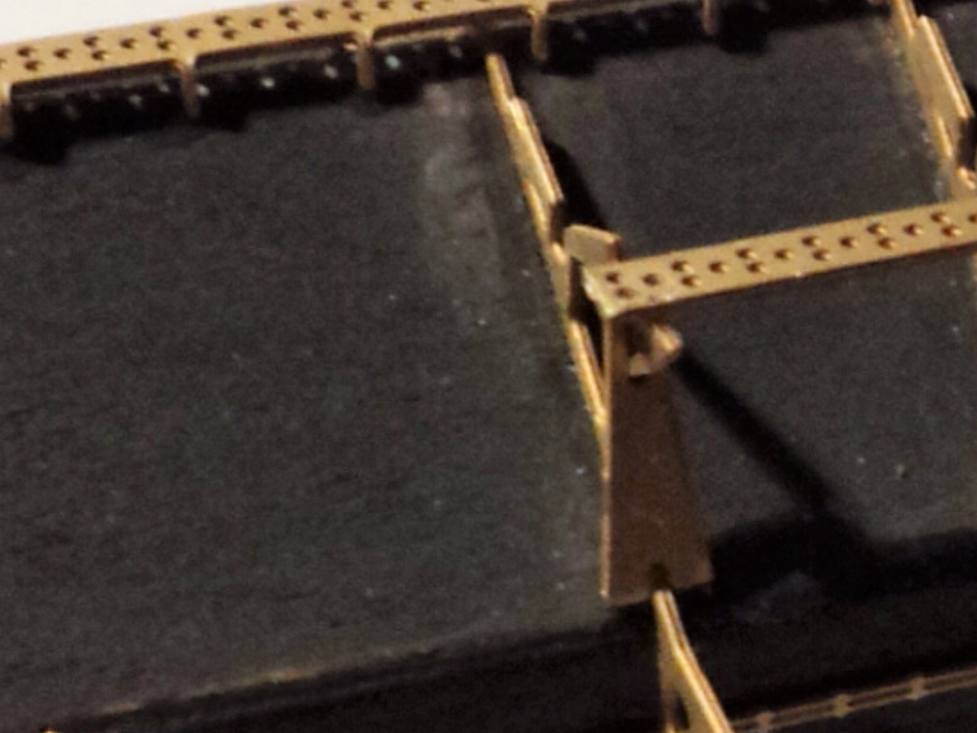 · Леера по борту делались в конце стройки, с ними пришлось тоже попотеть. Давалось 300 травленых из меди, я так понял, столбиков с тремя отверстиями под нить + 72 с подпоркой, я делал по фото и чертежам, а не по инструкции (давался шаблон для разметки мест), размечал вручную, линейкой, в итоге стоек на корабле около 310, с интервалом 8,33-8,5 мм, т.е. получается остались штук 60. И на корабле стоек с подпоркой примерно пополам с одинарными + процент с двумя подпорками есть (например, где разрывы для трапов, там цепь на оригинале снималась), вот такие дела, пришлось подпорки доделывать из тянутого литника. Монтаж занял месяца 1.5, стойки устанавливаются в самый край борта, и во избежание соскальзывания сверла, сверлил под углом, внутрь, соответственно все основания столбиков пришлось подгибать. Сам леер давался в виде лески, но я заменил его проволокой 0.12 мм.