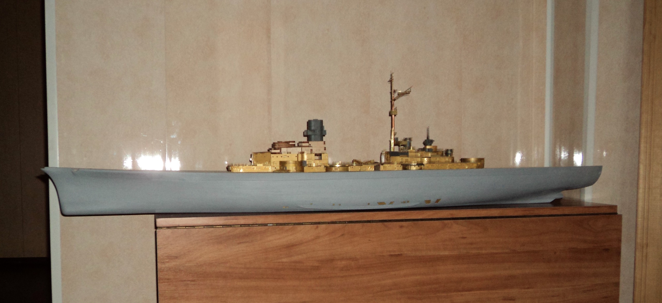 По большей части внутренности надстроек так же сделаны из фанеры. Из пластика сделаны: башенная надстройка, носовой и главный посты управления арт.огнем с дальномерами, округлые стены вокруг башен СК (в виде вставок в надстройку), труба полностью, боковые части главного ангара, площадка ходового мостика, кормовая площадка управления зенитным огнем, а так же по мелочам, вентиляционные короба, всевозможные ящики, вентиляционные патрубки, кабельные каналы, приборы и т.д. Из вооружения пластиковые установки крупной, средней и малой зенитной артиллерии. И все это вперемешку с травлением. Добавлю, что в отличие от европейских выпусков, в наших, некоторые узлы были заменены с фанеры на МДФ, это башни ГК, все барбеты, бортовые ангары, видимо проблемы были у издателя/производителя.