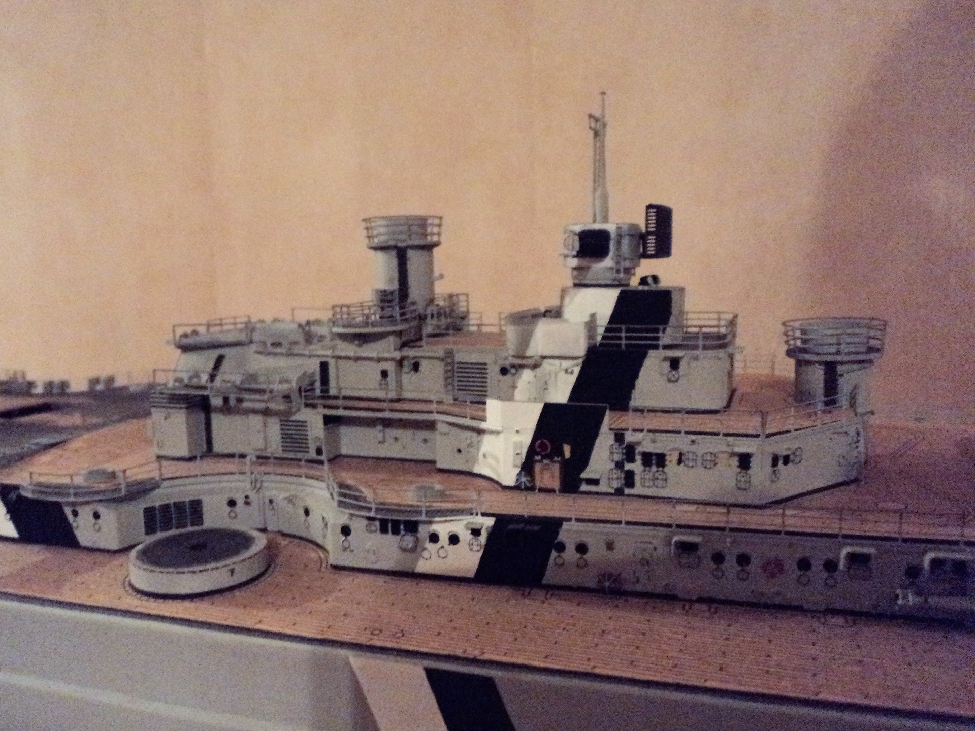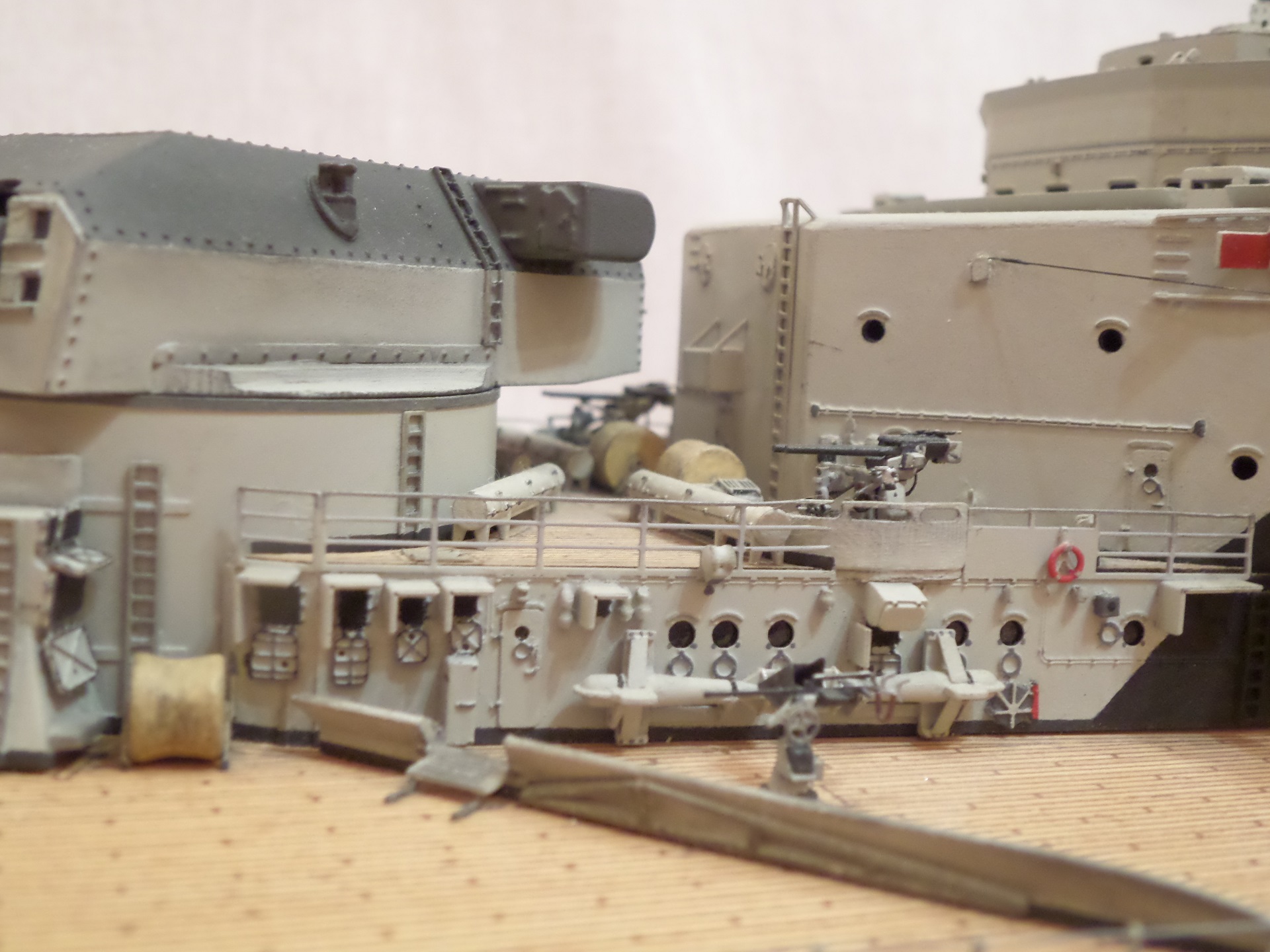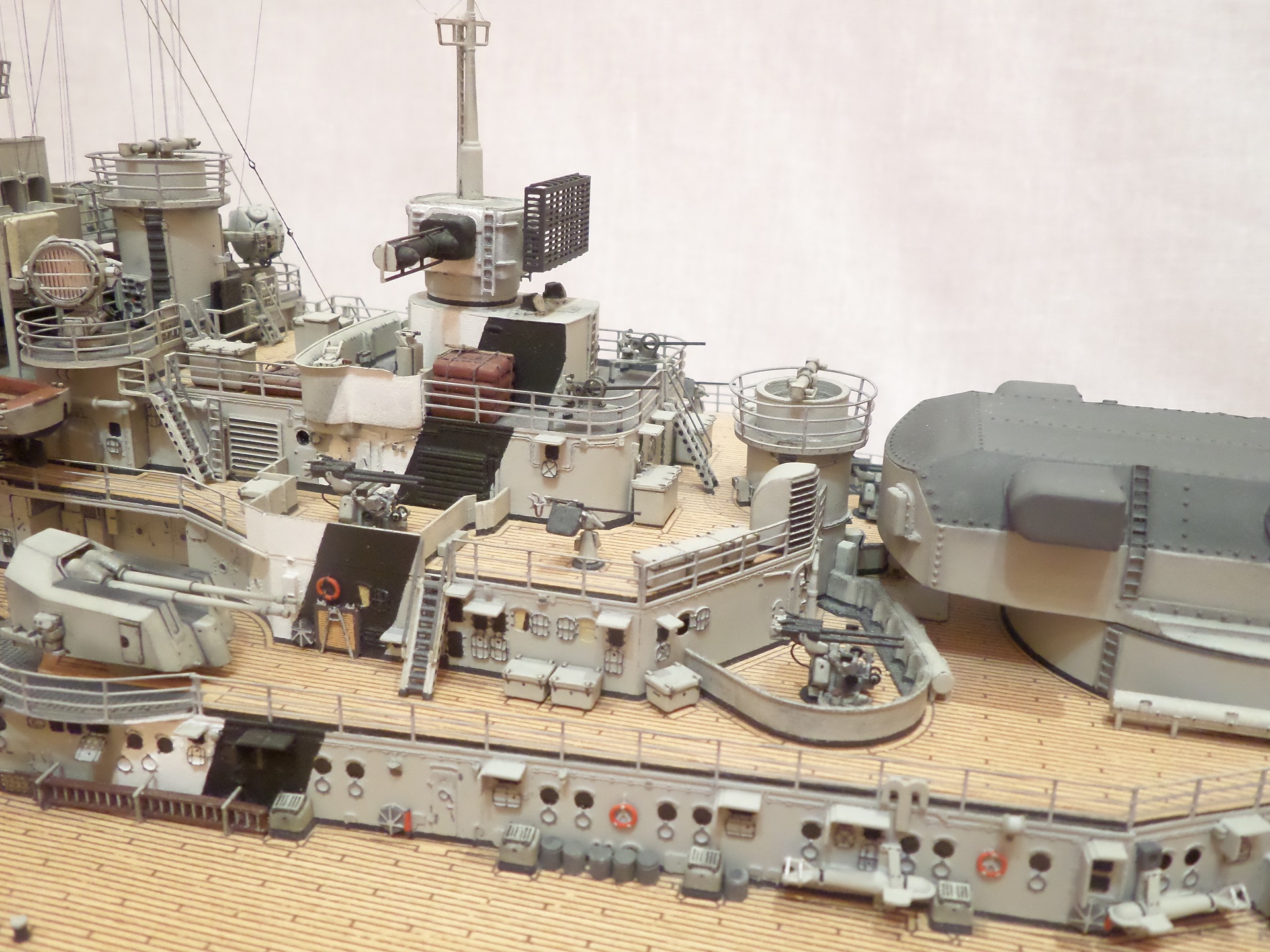 · На носовой надстройке сделаны проходы в надстройку на втором ярусе у носовых тяжелых зениток, с дверью и кое каким обвесом. Это в пластиковой детали ниш орудий СК, полностью отсутствующая часть почему то.