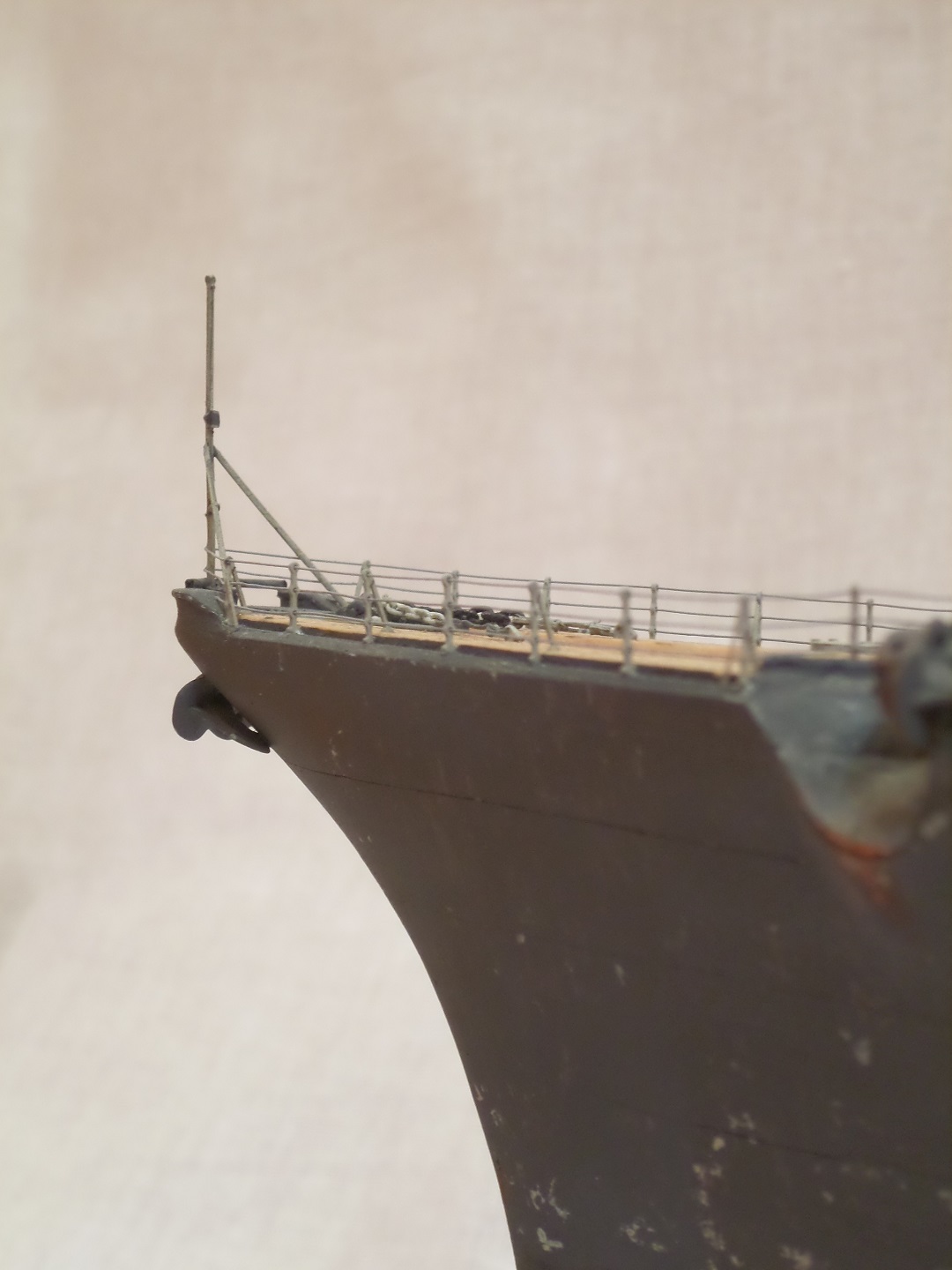 · На носовом якоре веретено давалось травленым, но в следствии замены его на масштабный, то его пластиковое вполне вошло в клюз и торчало из палубы на нужную длину.