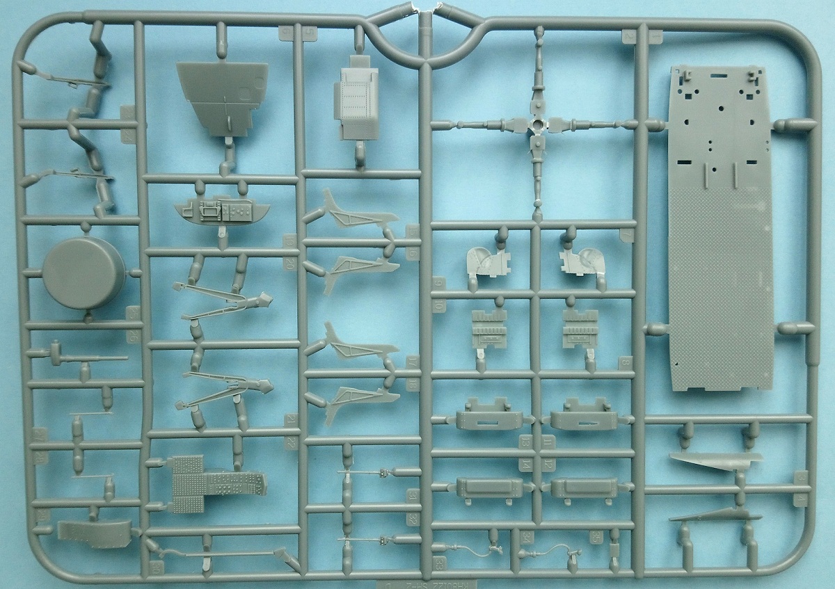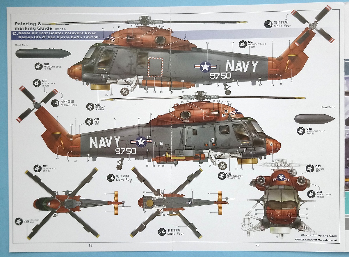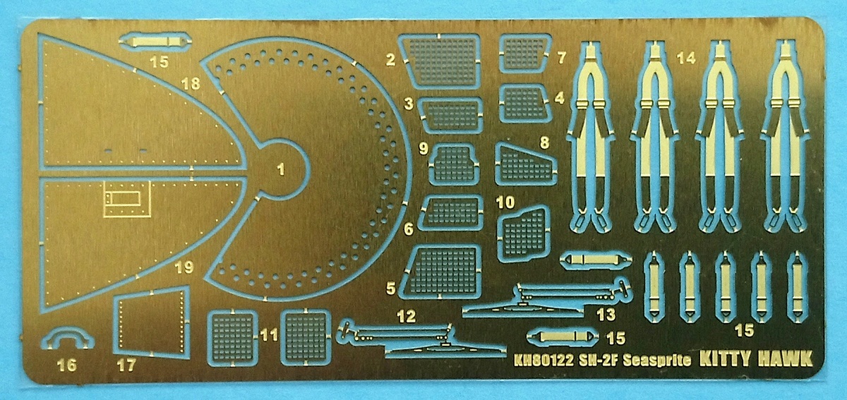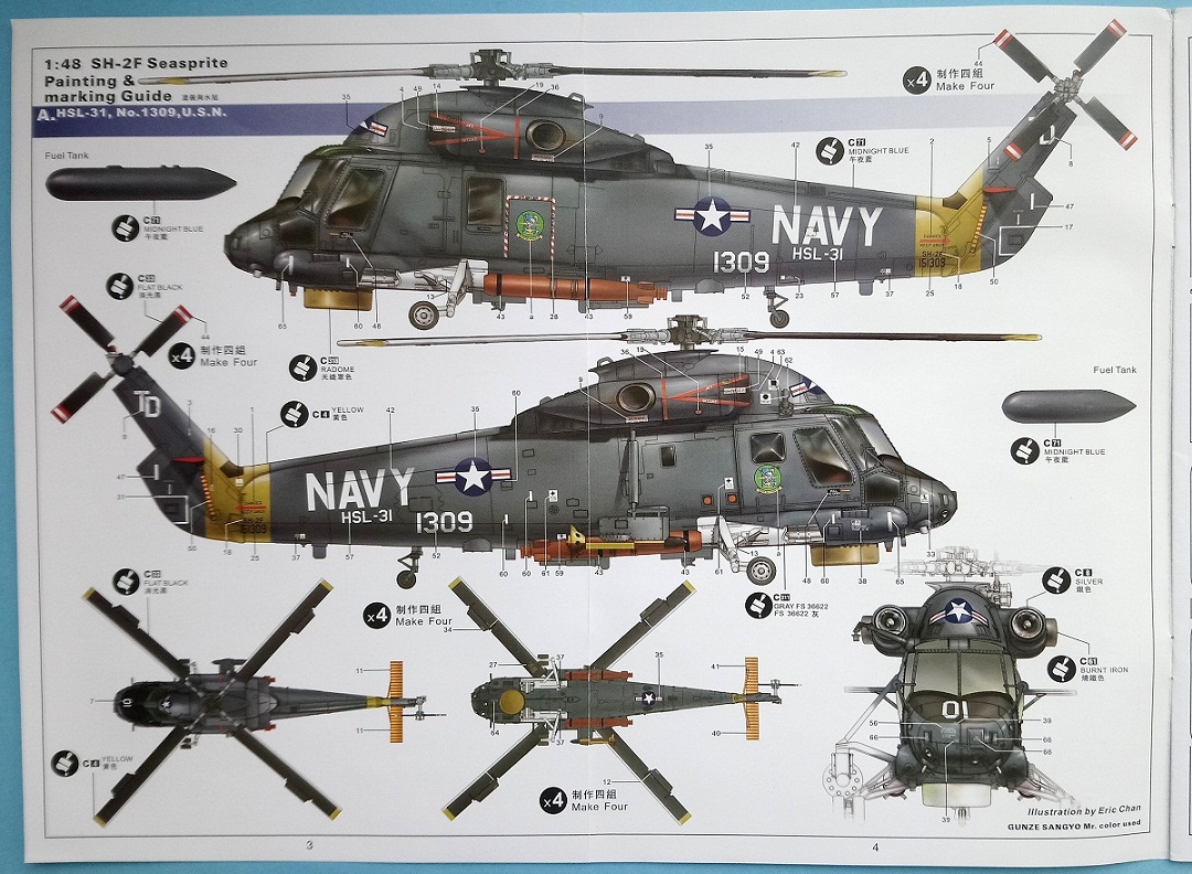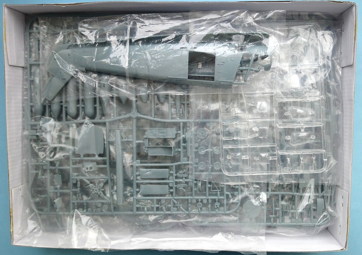В красивой коробке среднего размера из тонкого жесткого картона уложены семь упакованных в полиэтиленовые пакеты полистироловых рамок темно-серого цвета. В отдельной упаковке находится рамка из прозрачного пластика с деталями остекления и светотехники. Также имеются ФТД интерьера и экстерьера вертолета, два листа декалей (большой и малый) с вариантами принадлежности к трем эскадрильям ВМС США и книжечка- инструкция по сборке модели.
