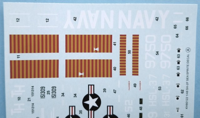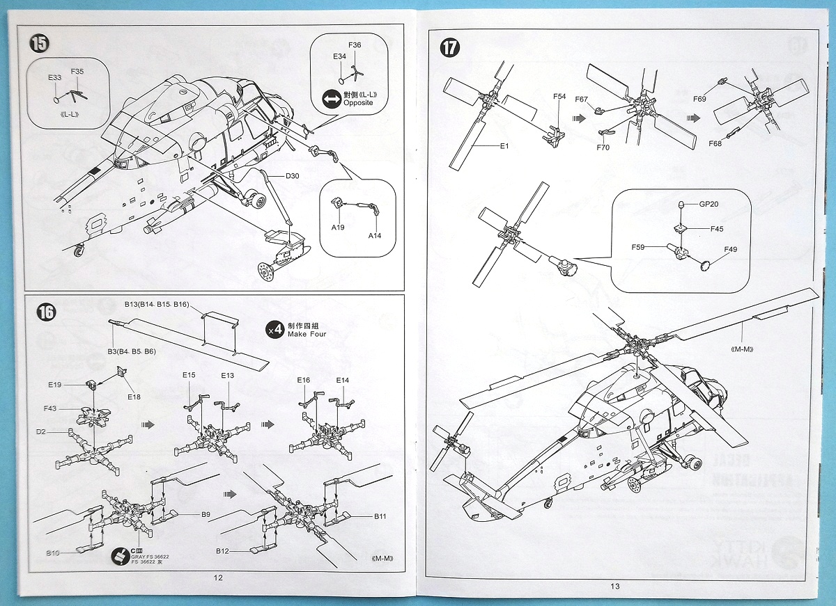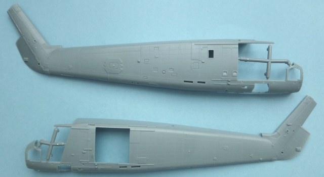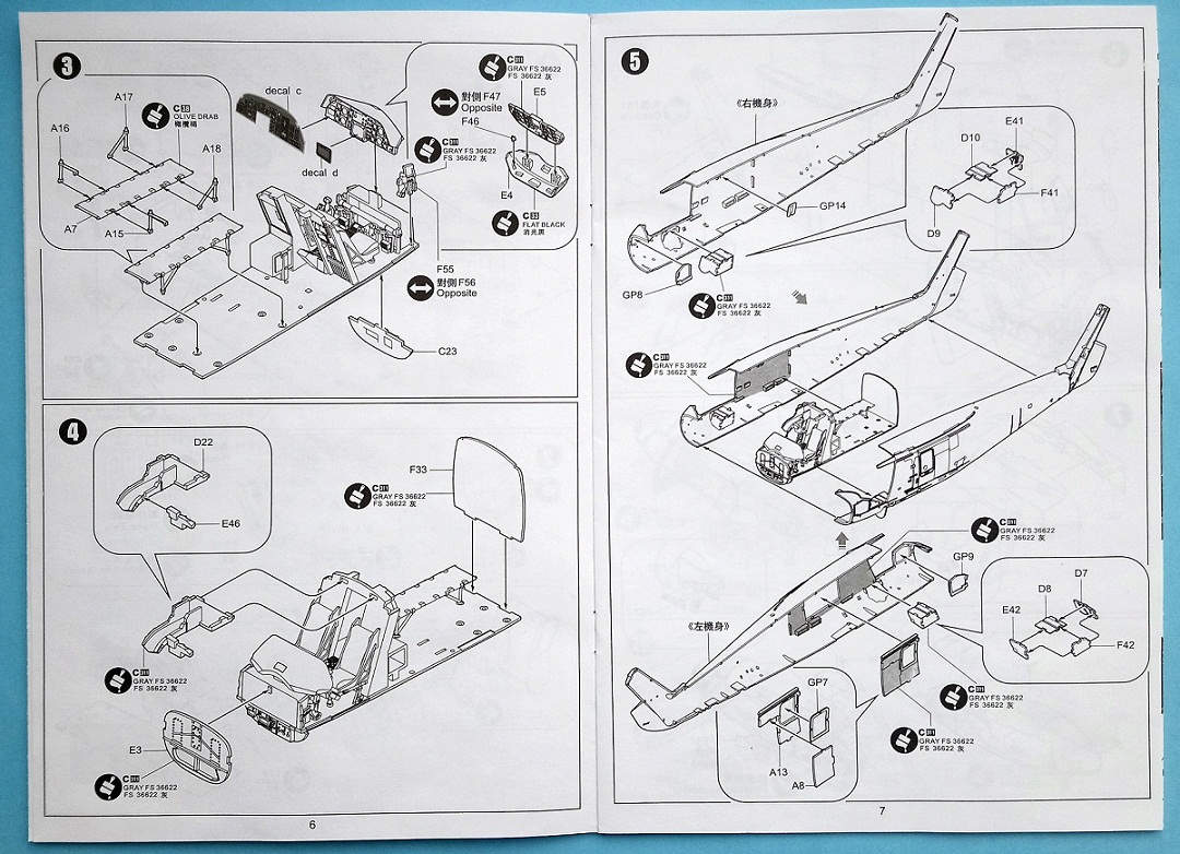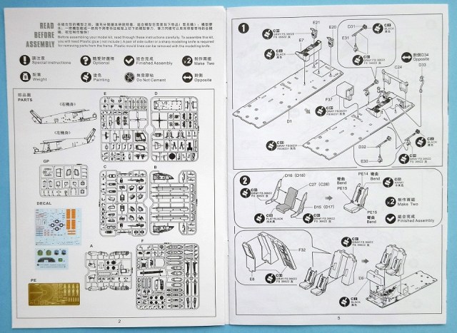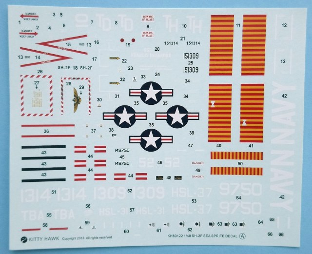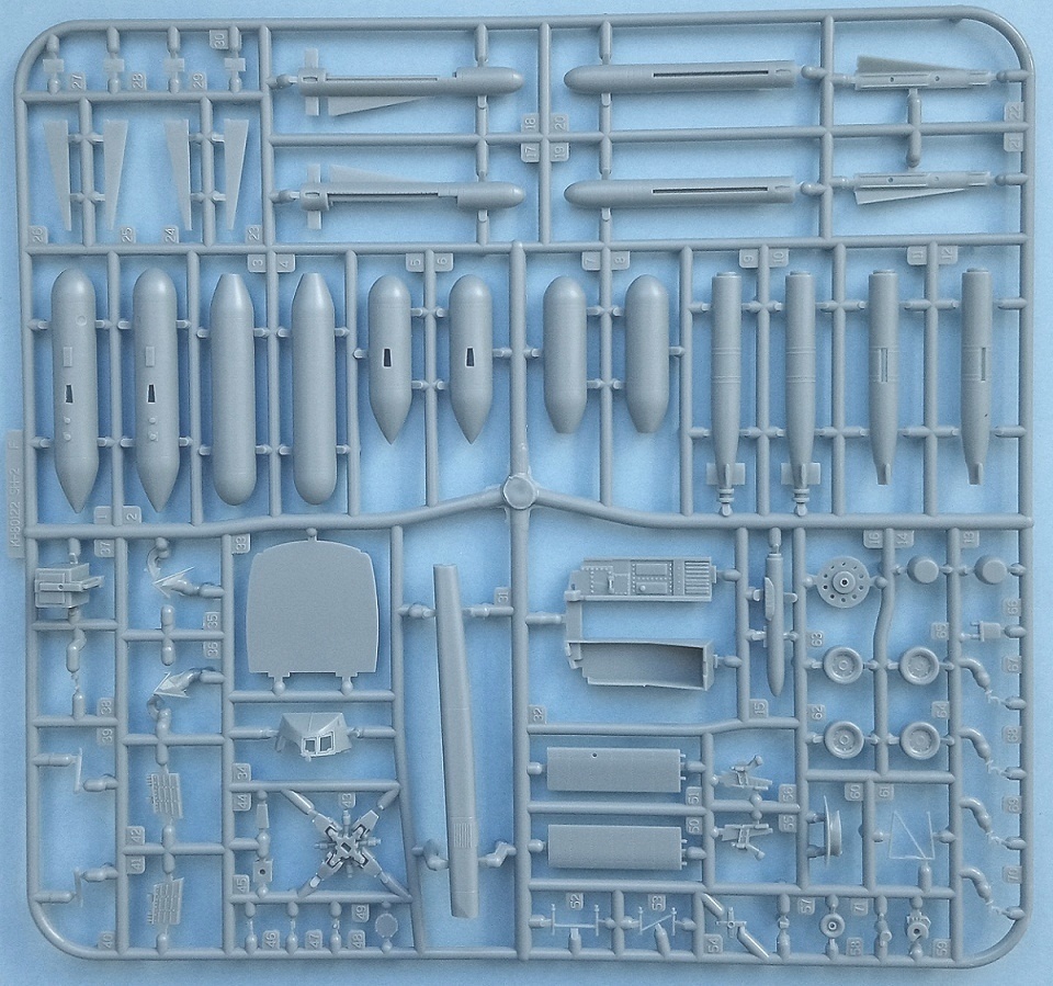 В красивой коробке среднего размера из тонкого жесткого картона уложены семь упакованных в полиэтиленовые пакеты полистироловых рамок темно-серого цвета. В отдельной упаковке находится рамка из прозрачного пластика с деталями остекления и светотехники. Также имеются ФТД интерьера и экстерьера вертолета, два листа декалей (большой и малый) с вариантами принадлежности к трем эскадрильям ВМС США и книжечка- инструкция по сборке модели.